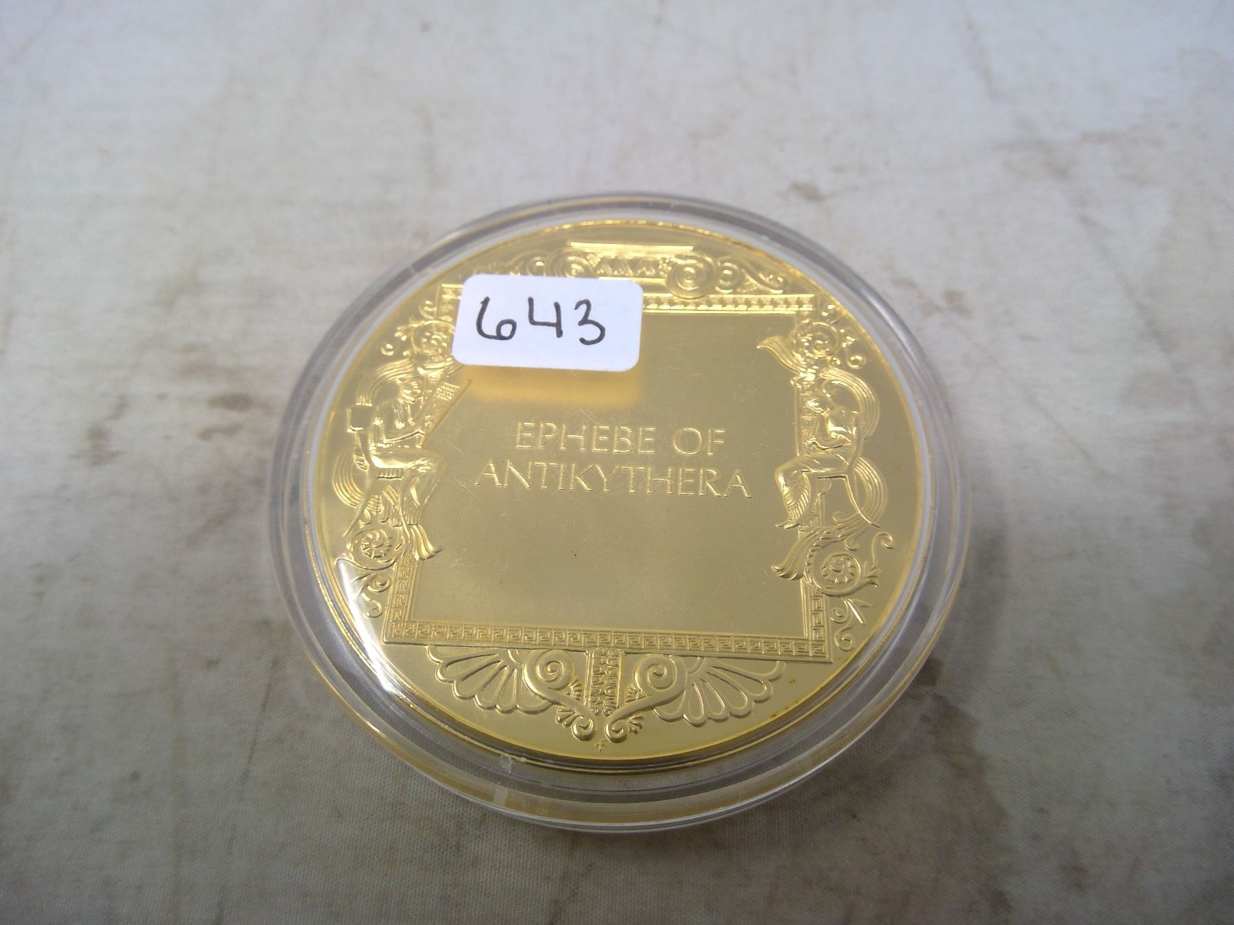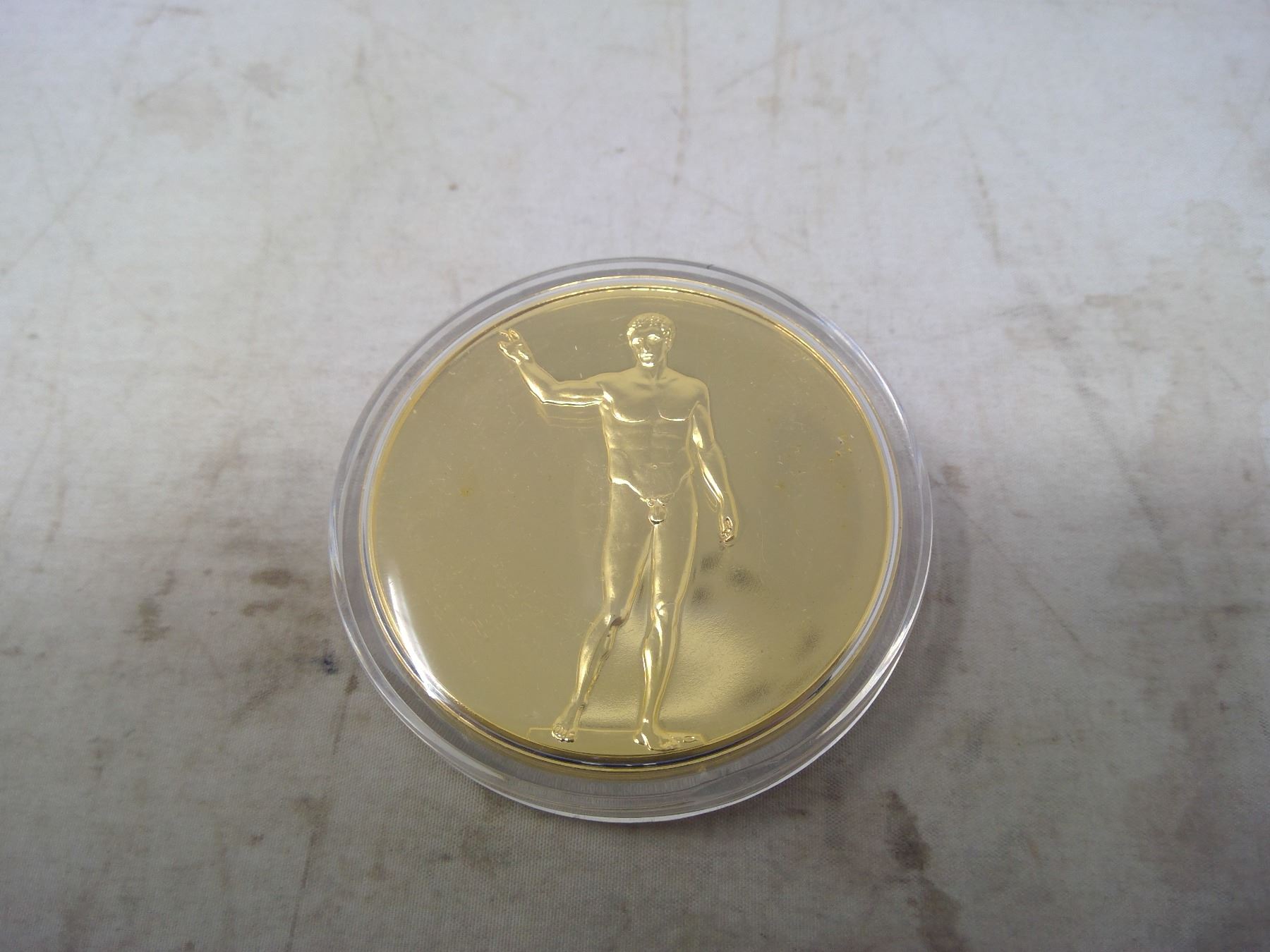 Ephebe of Antikythera. From the Ancient Greece medals series. A beautiful gold-plated bronze medal measuring 50mm in diameter and weighing 80.5 grams. In hard plastic holder. BU. Nice.