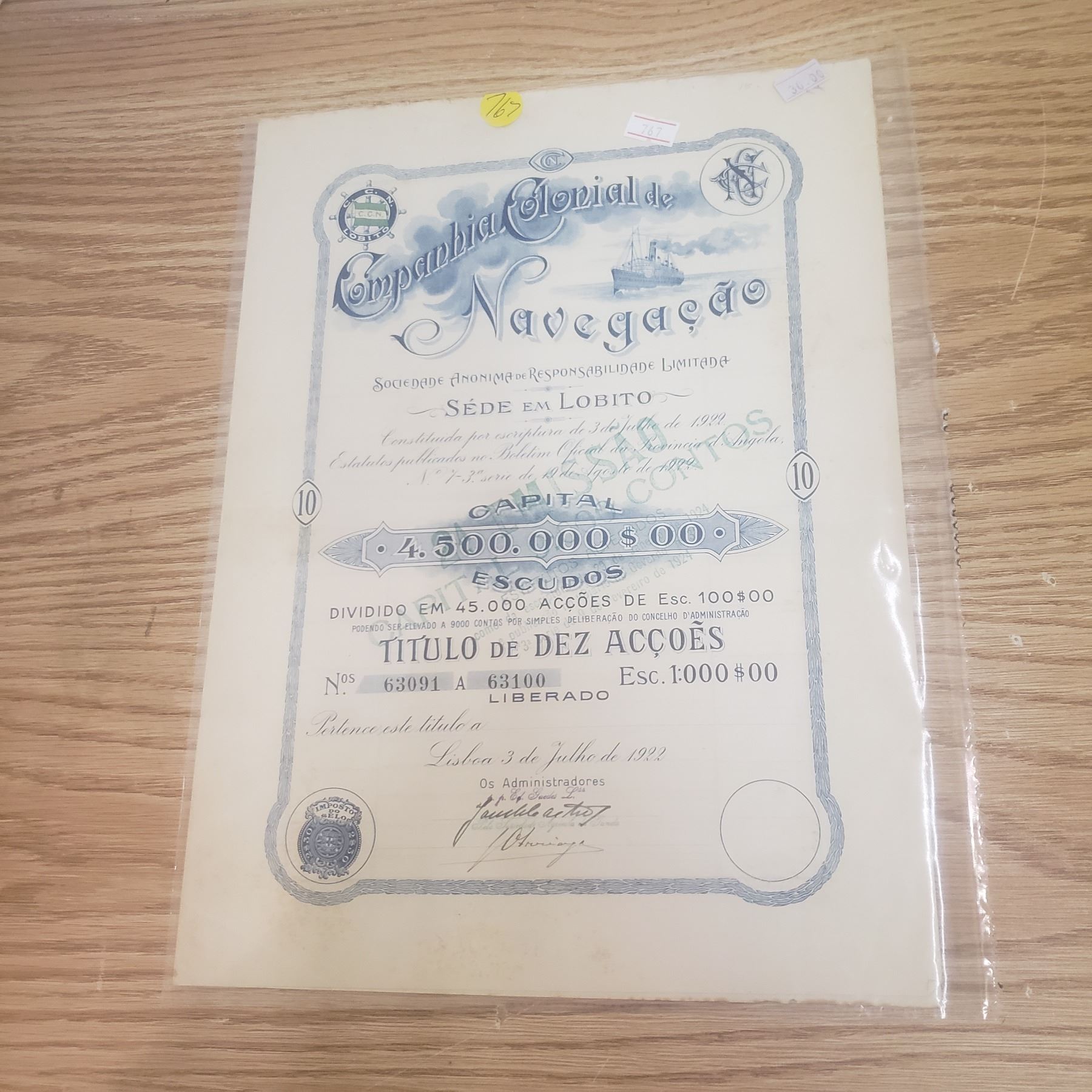 Escudos 1000 shares with Portugal Companbia Clonial der Navegacdo Navigation Company 1922