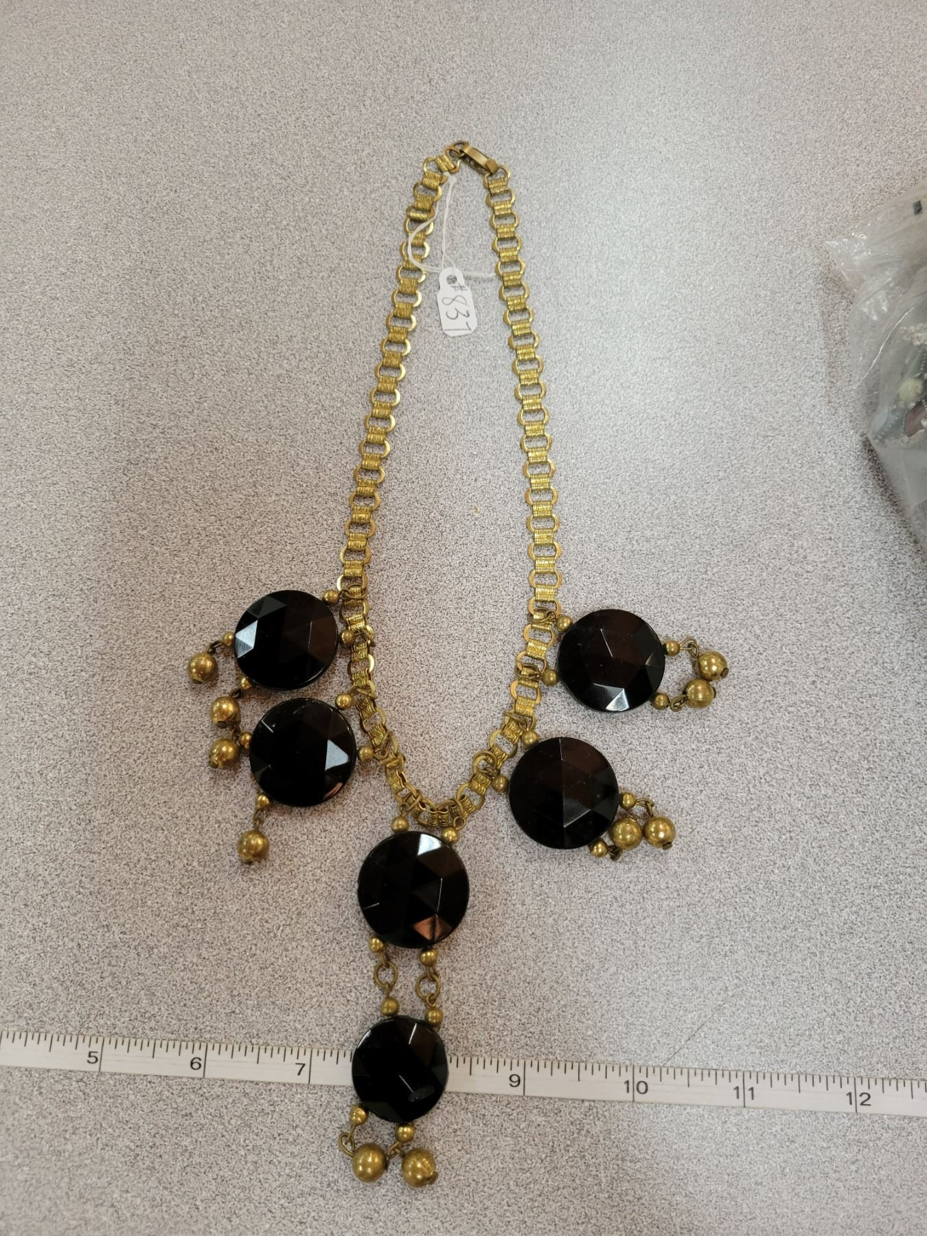 European bib necklace, metal tread and black glass
