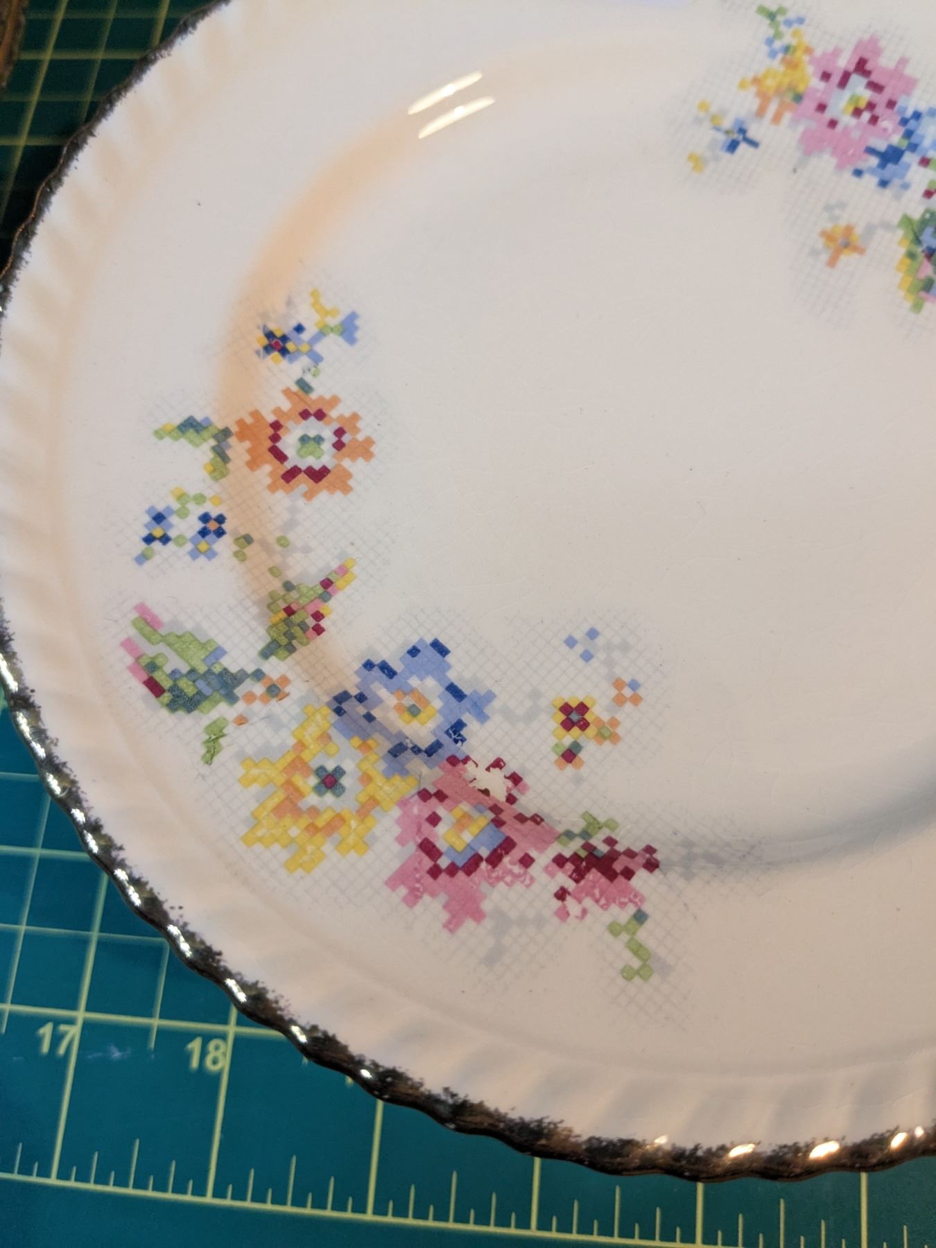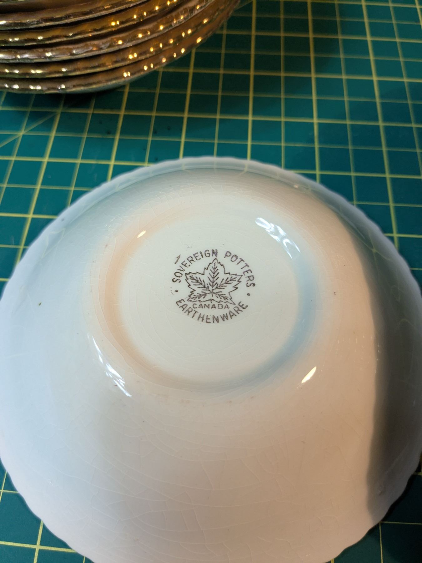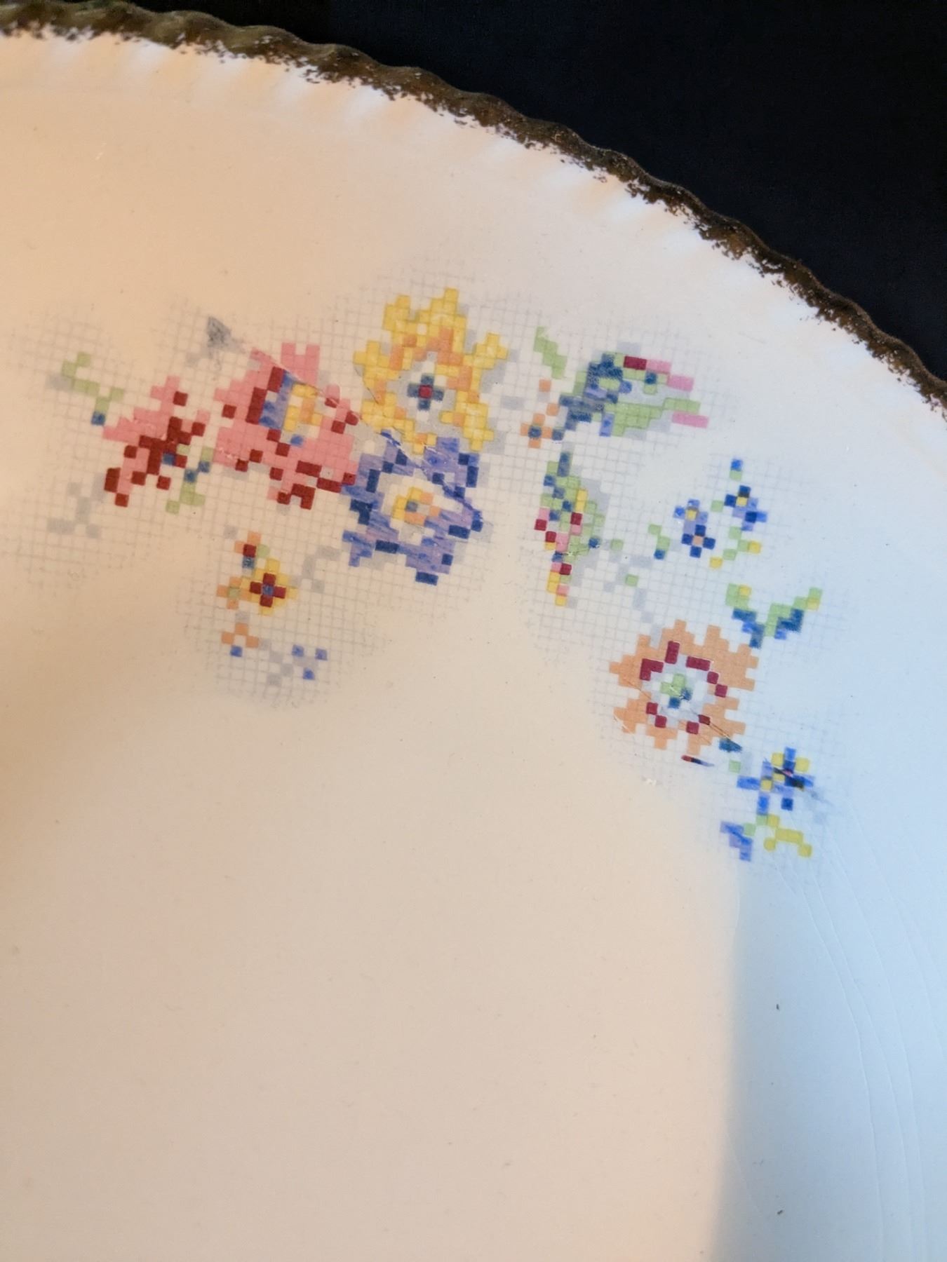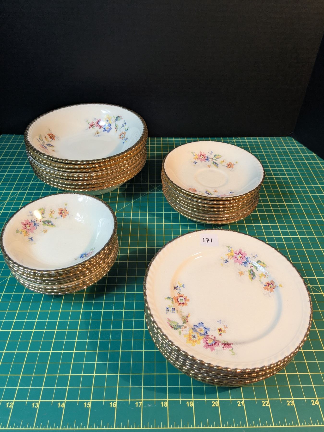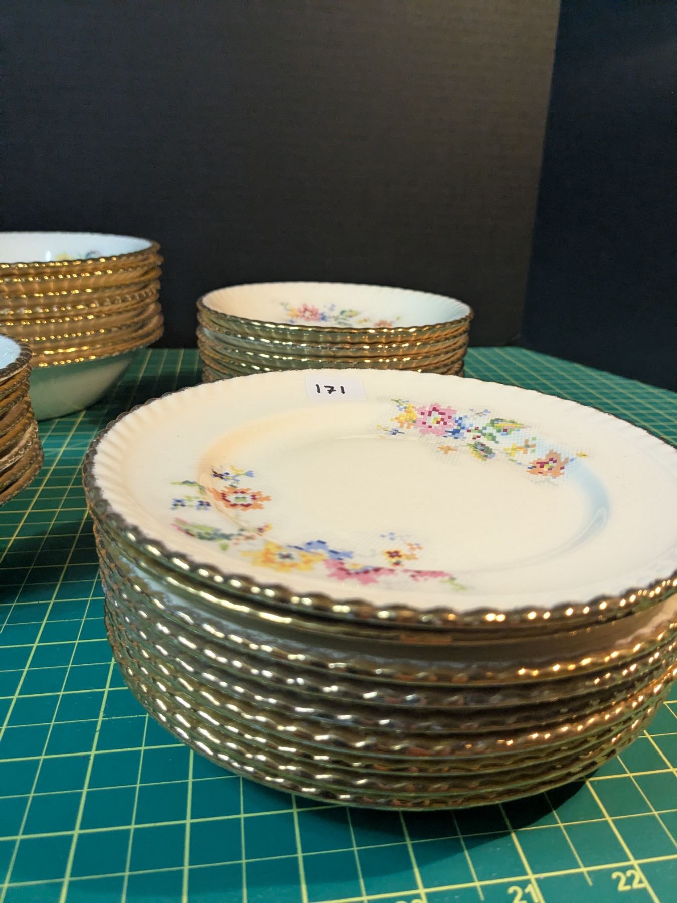 Excellent set of Sovereign Potters Chorley Park needlepoint floral design. 8 soup bowls, 9 dessert plates, 8 saucers, 8 dessert bowls.