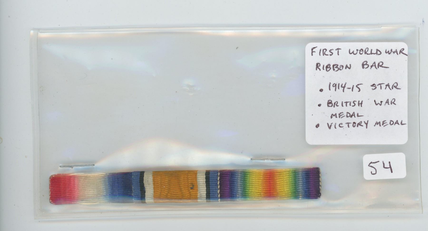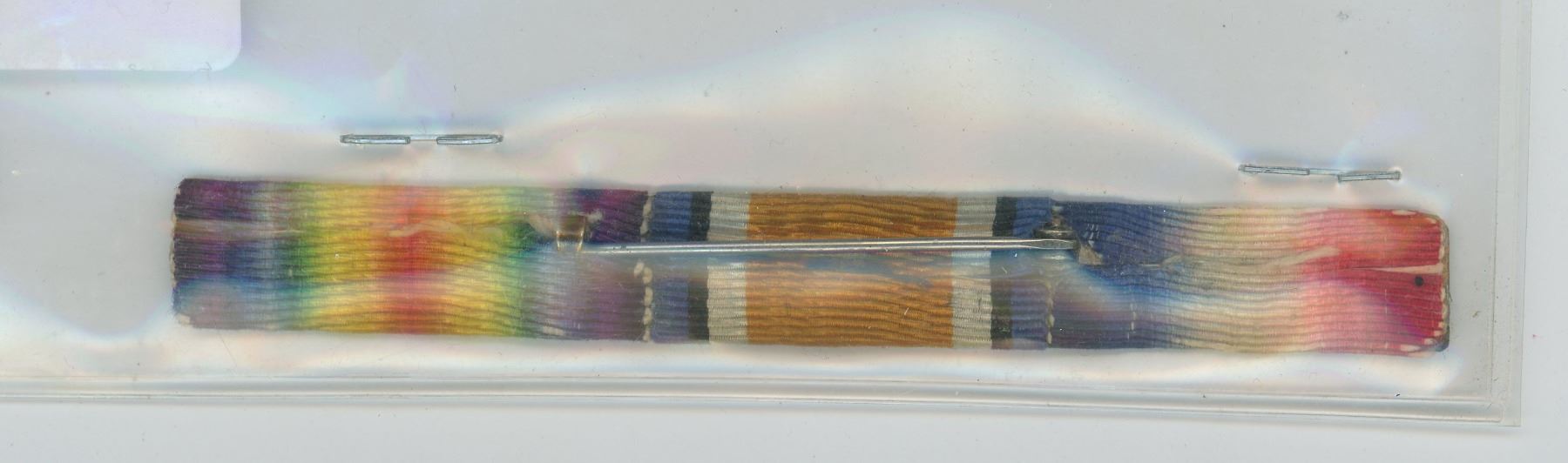 FIRST WORLD WAR RIBBON BAR CONTAINING 3 RIBBONS: 1914-15 STAR, BRITISH WAR MEDAL, VICTORY MEDAL.