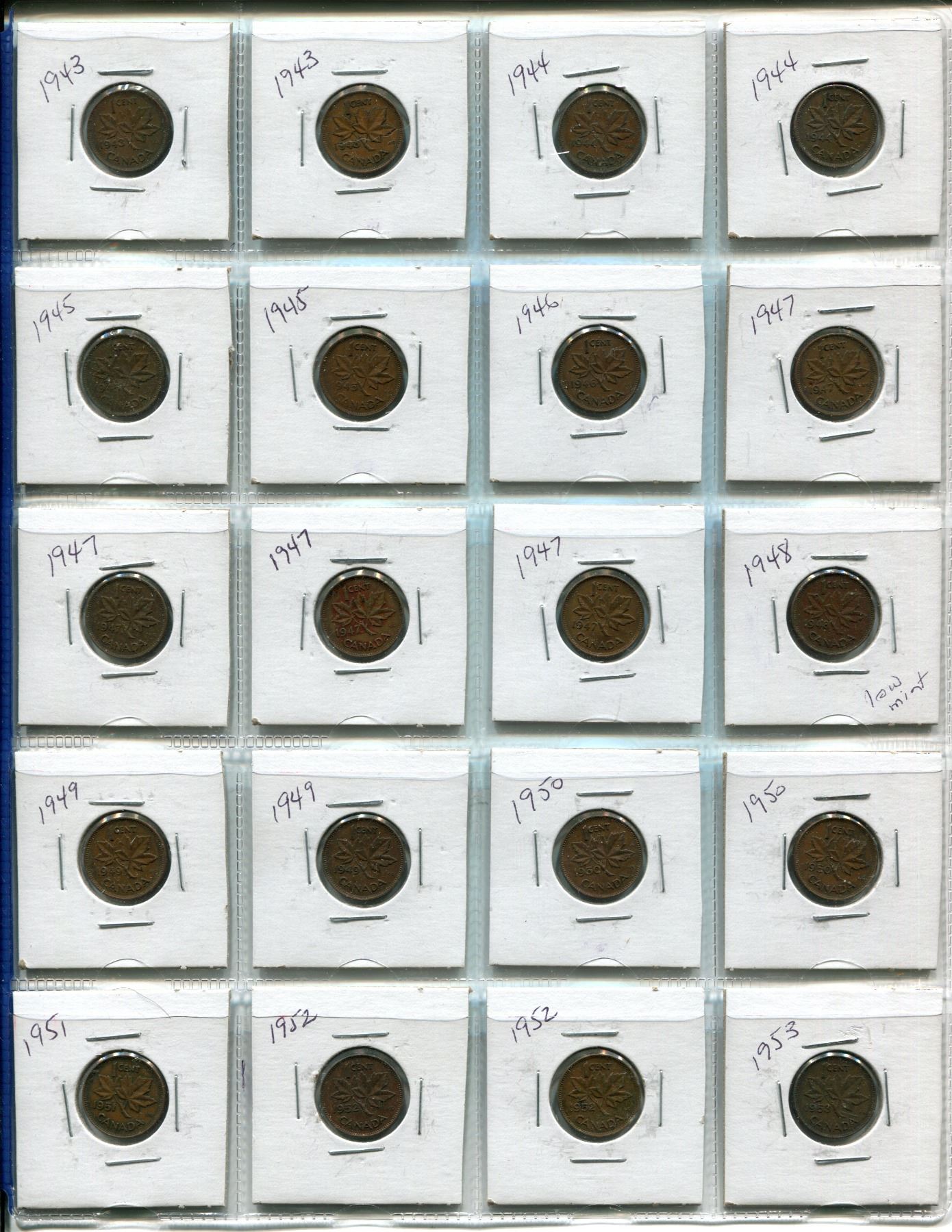 FULL SHEET (20) OF CANADIAN PENNIES VARIOUS YEARS 1943-1953