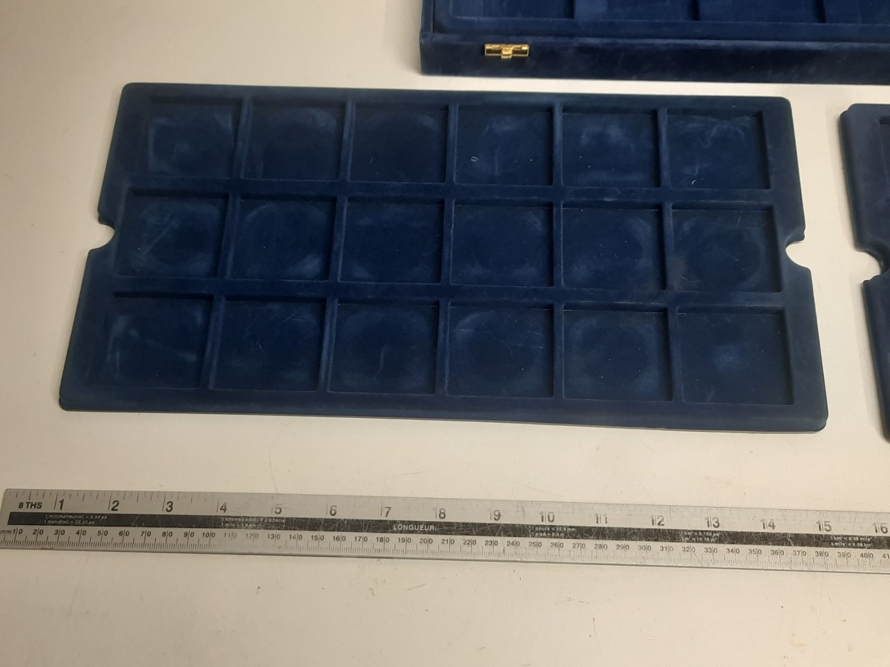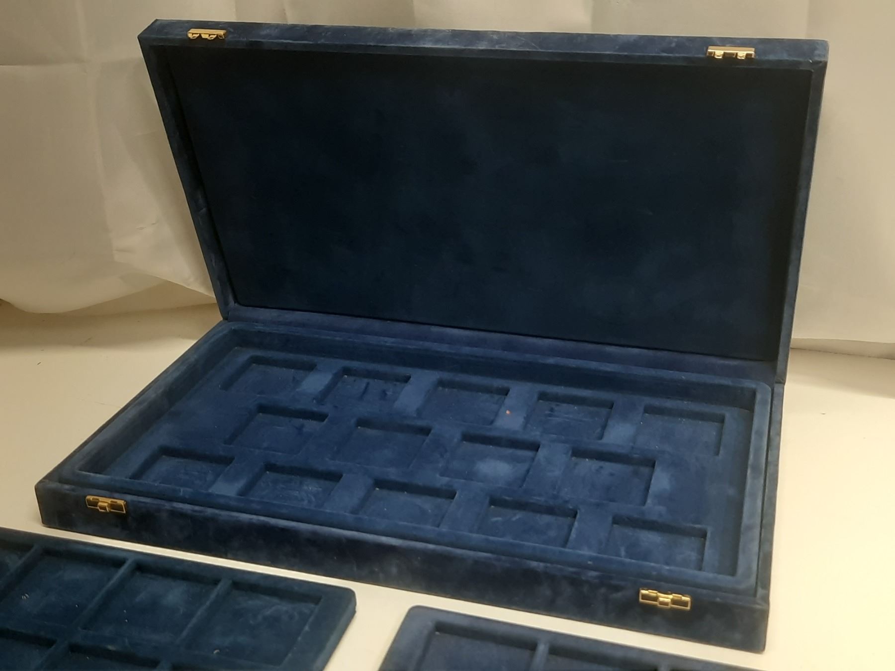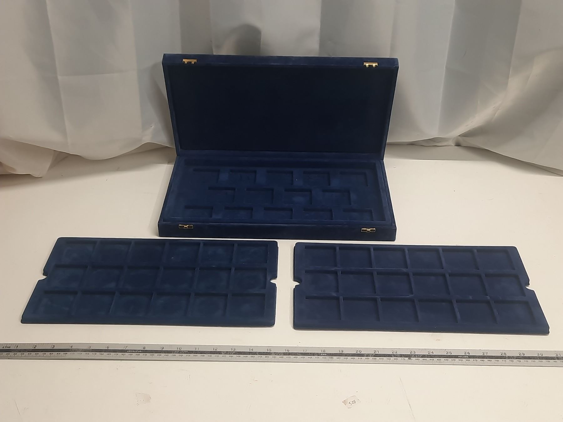Fancy blue case with 3 trays, each holding 18 large coins. Used.