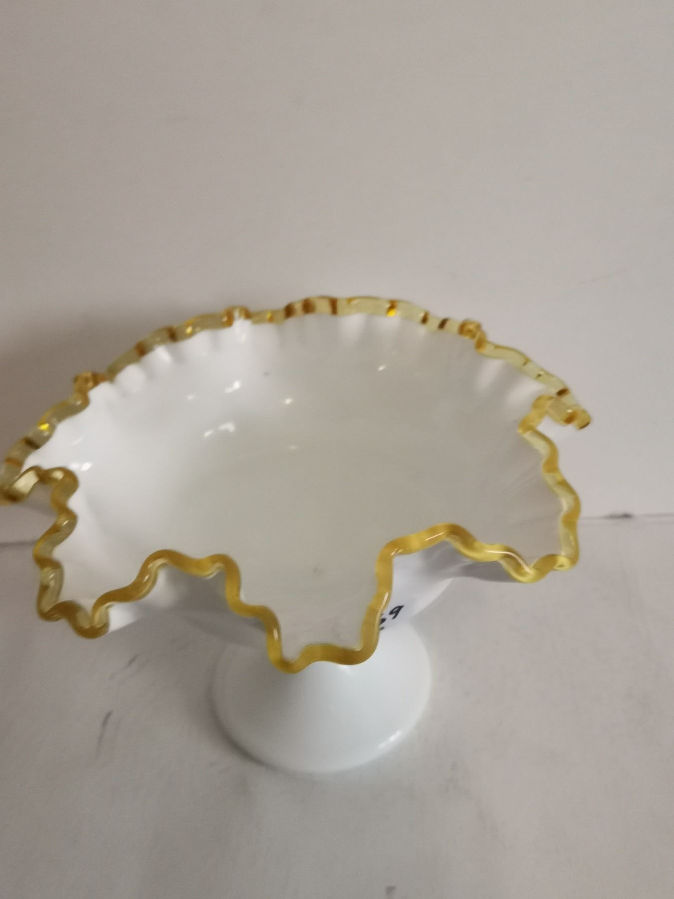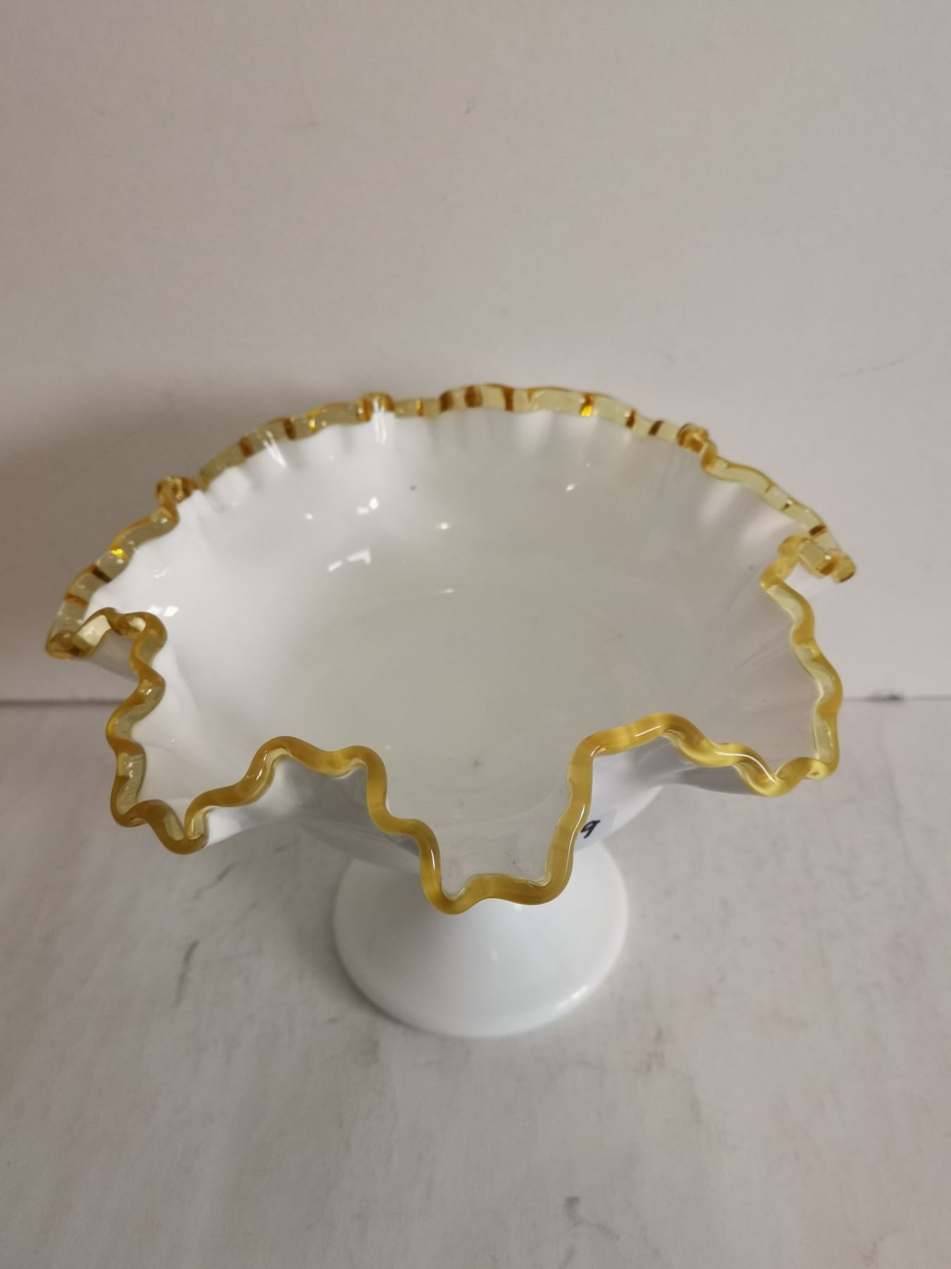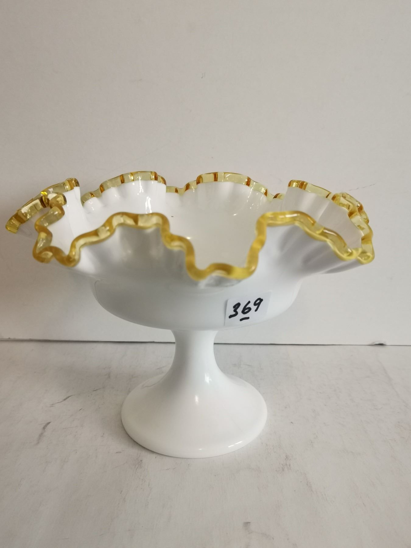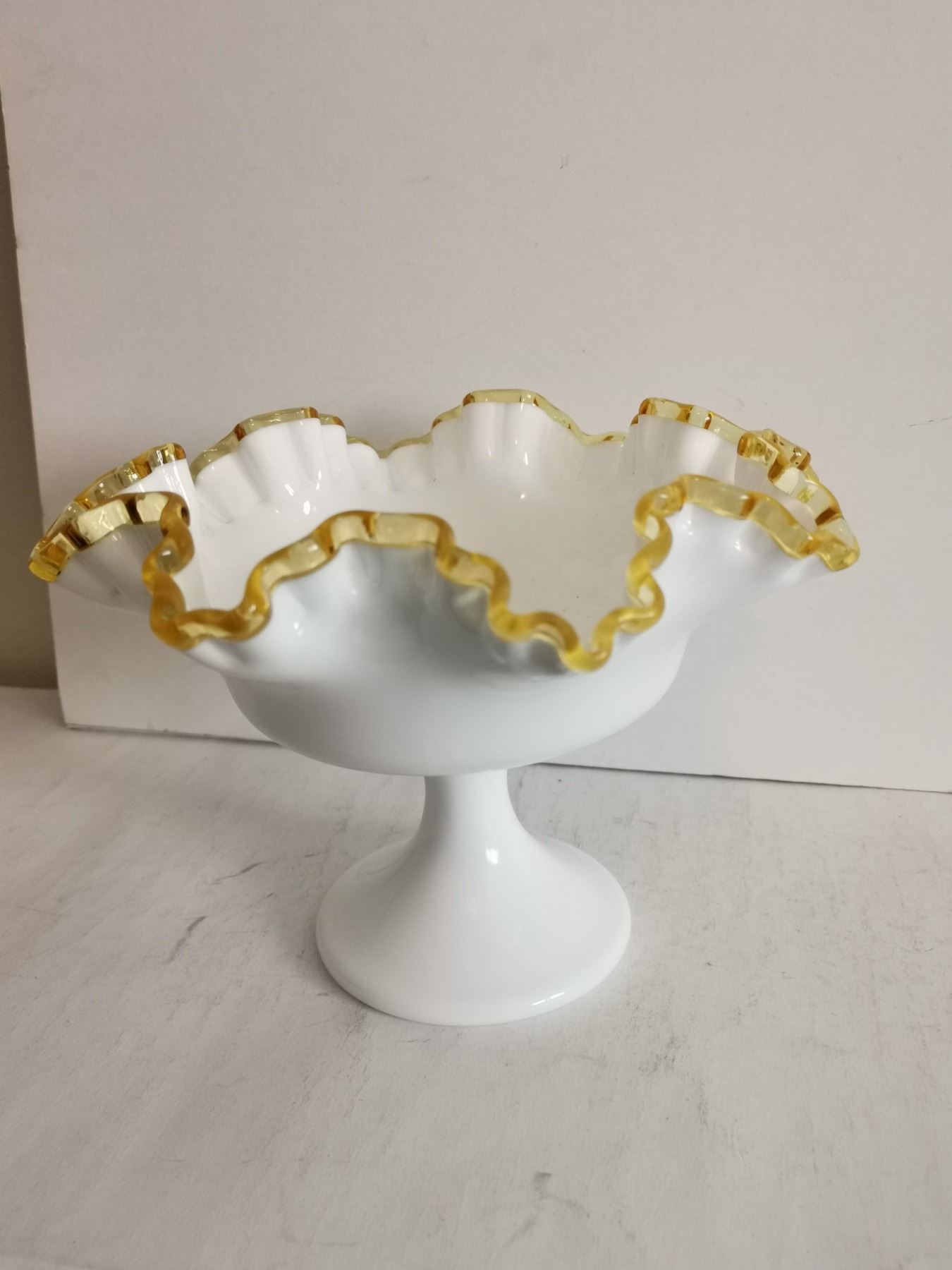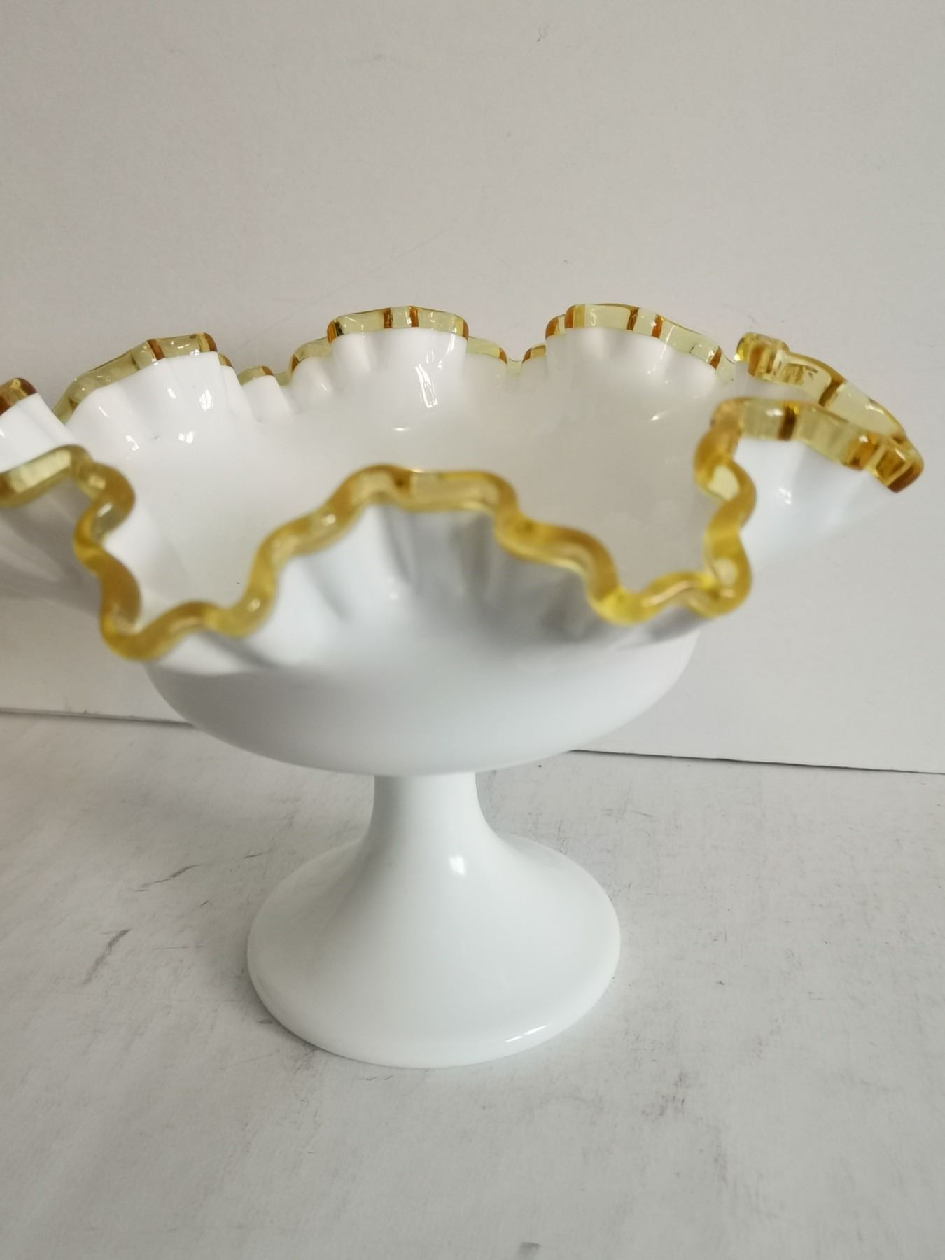 Fenton Milk Glass w/ Gold Crest Footed Candy Dish, 6” Tall