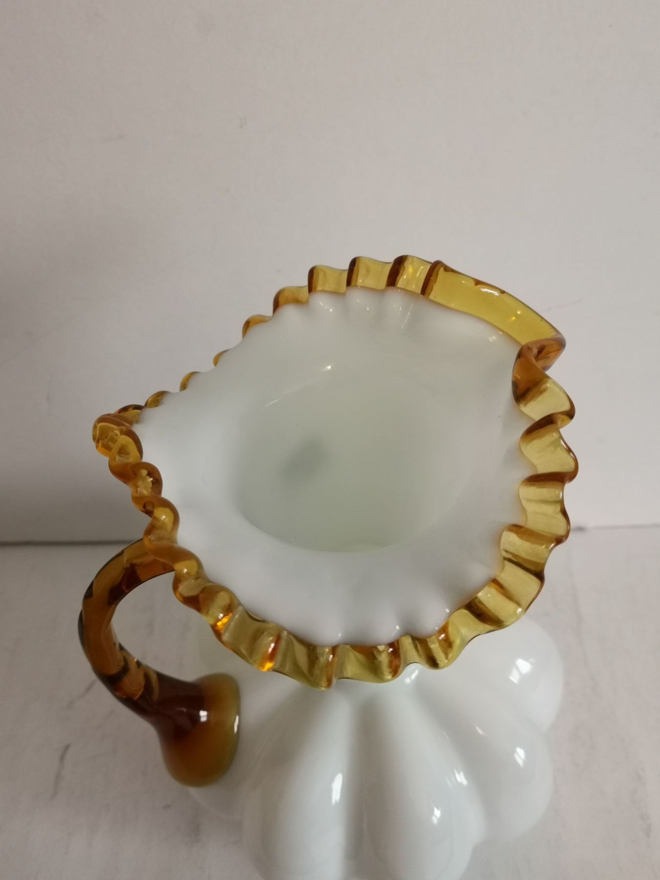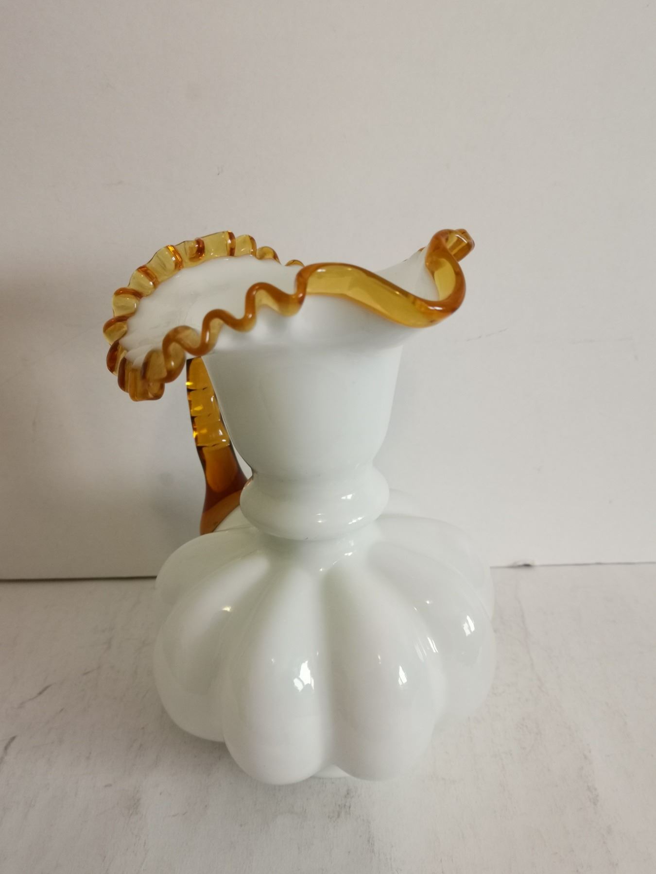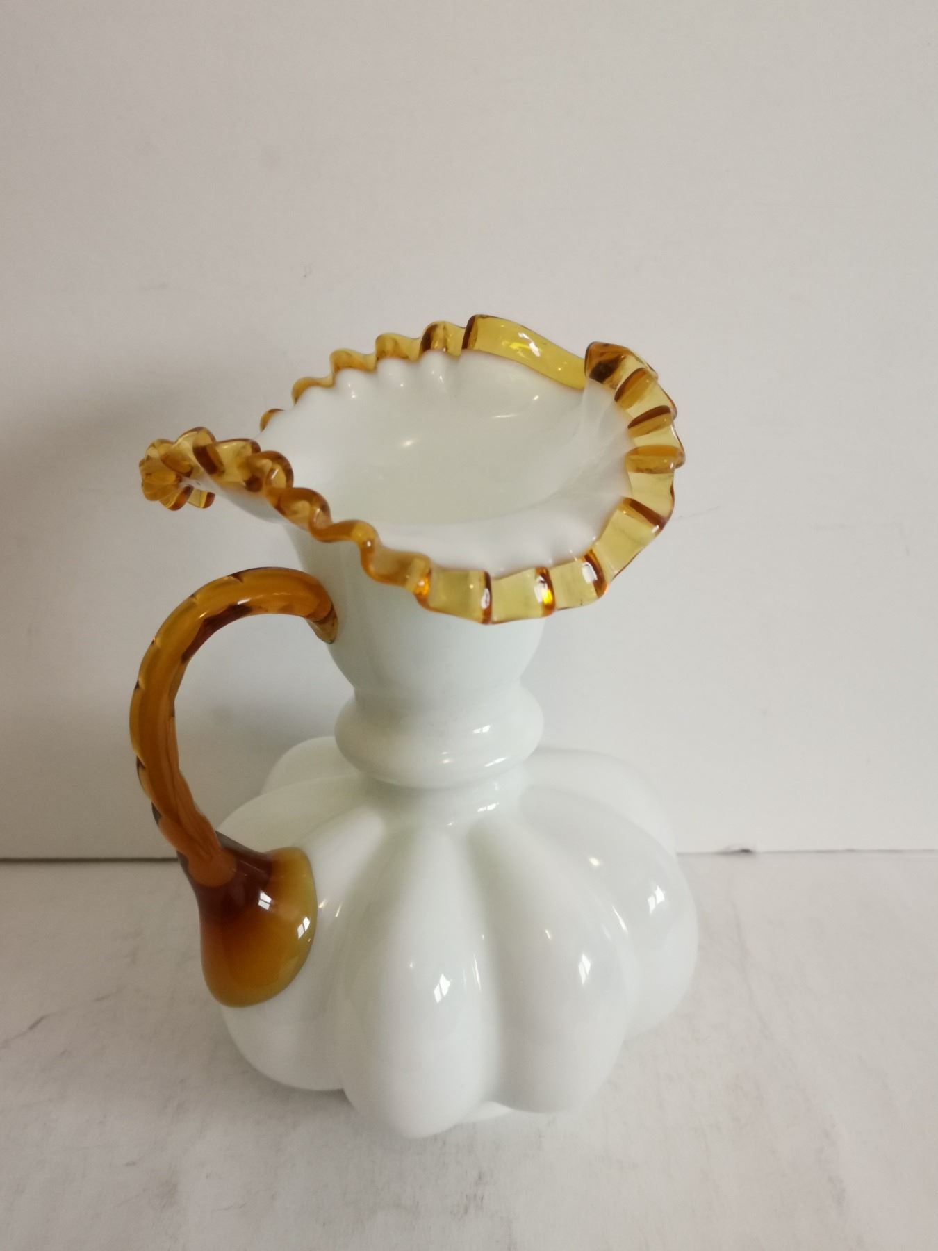 Fenton Milk Glass w/ Gold Crest Pitcher, 8.5”