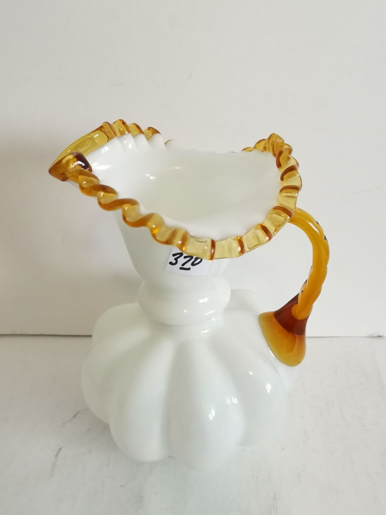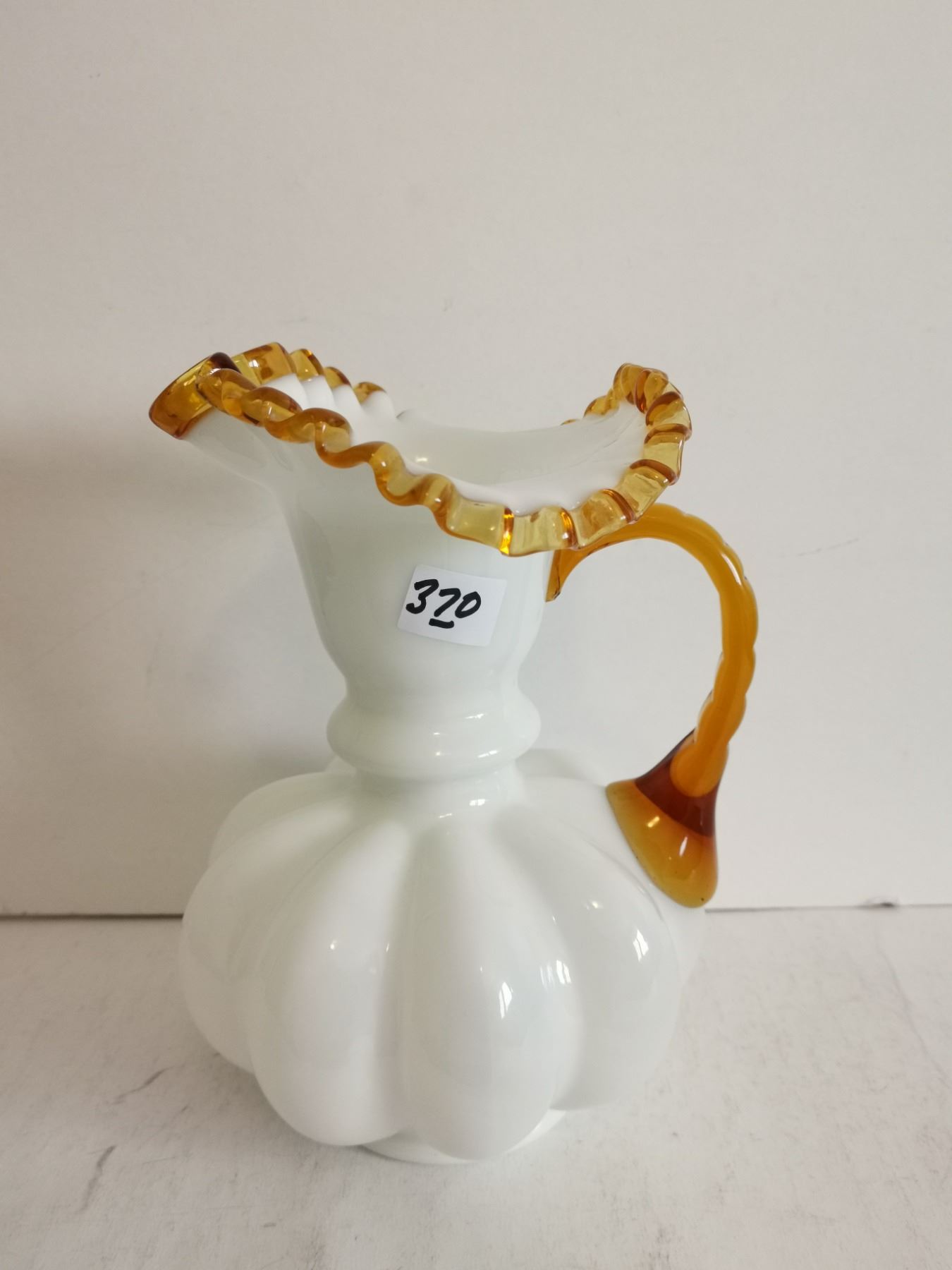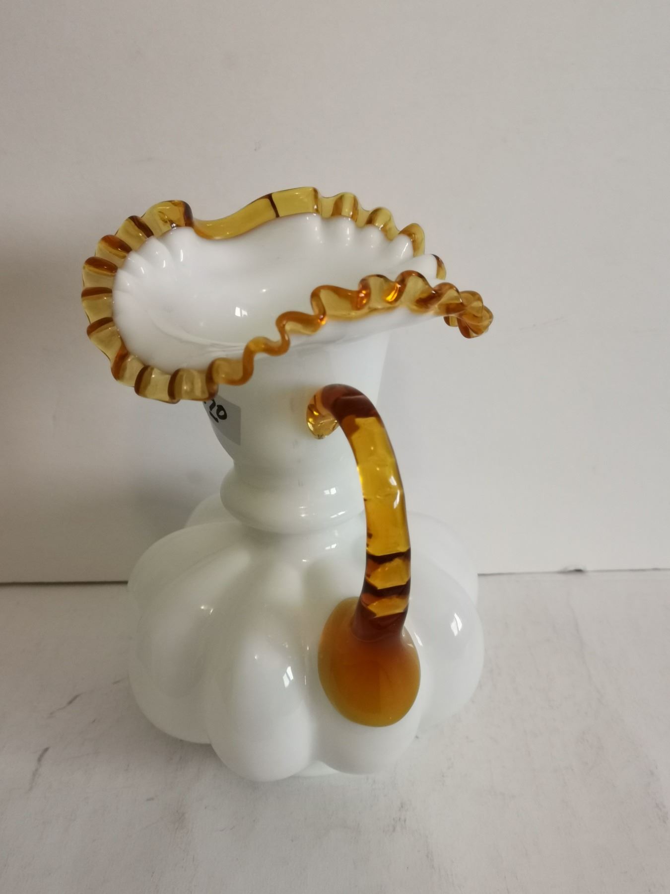 Fenton Milk Glass w/ Gold Crest Pitcher, 8.5”