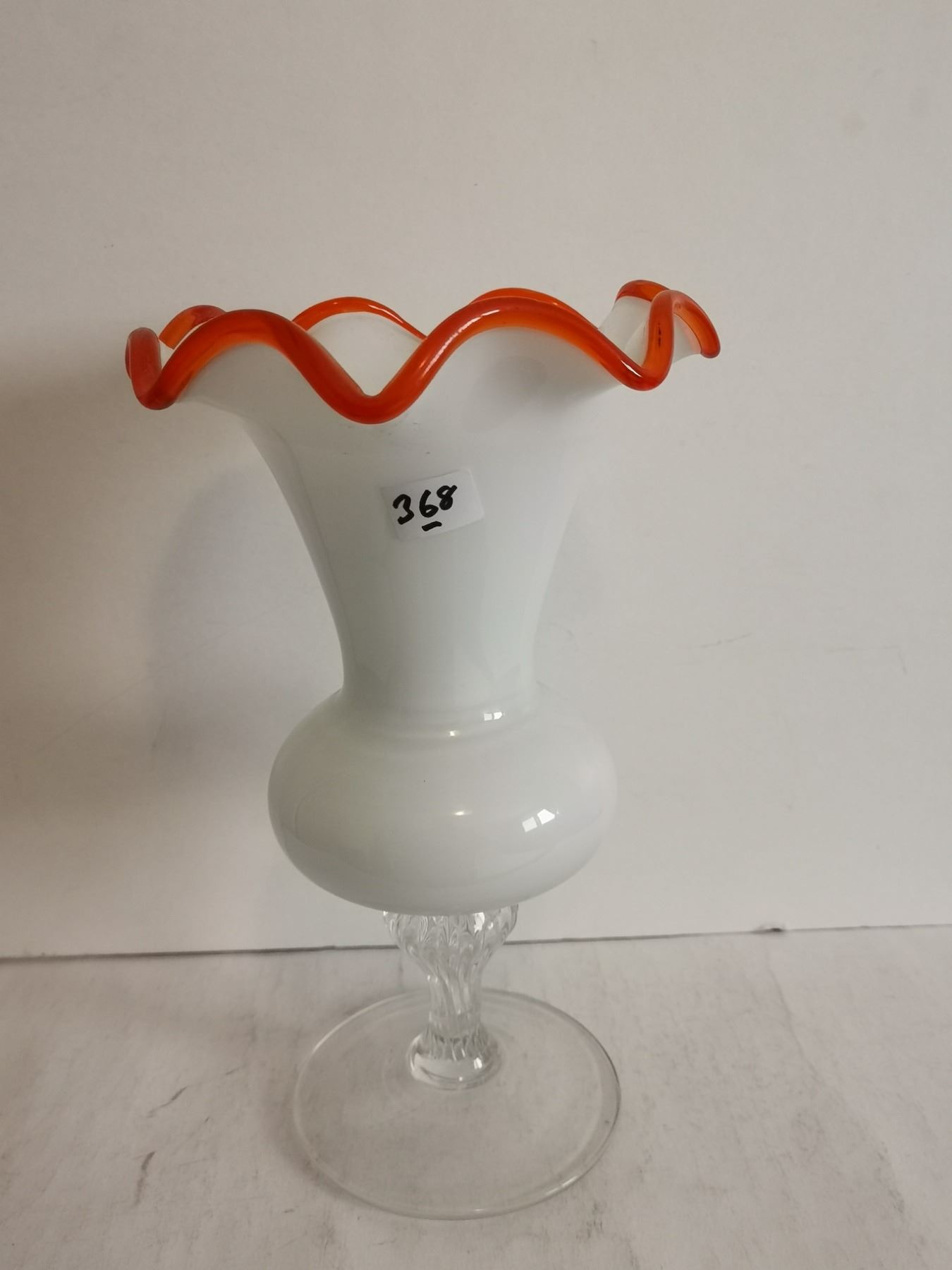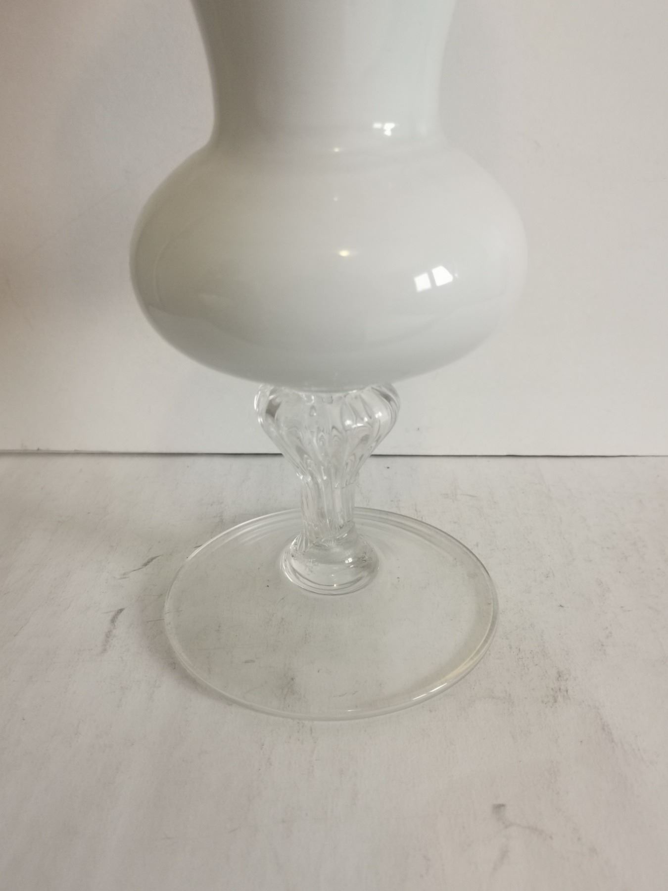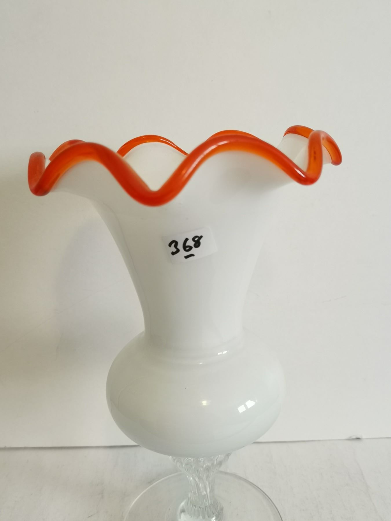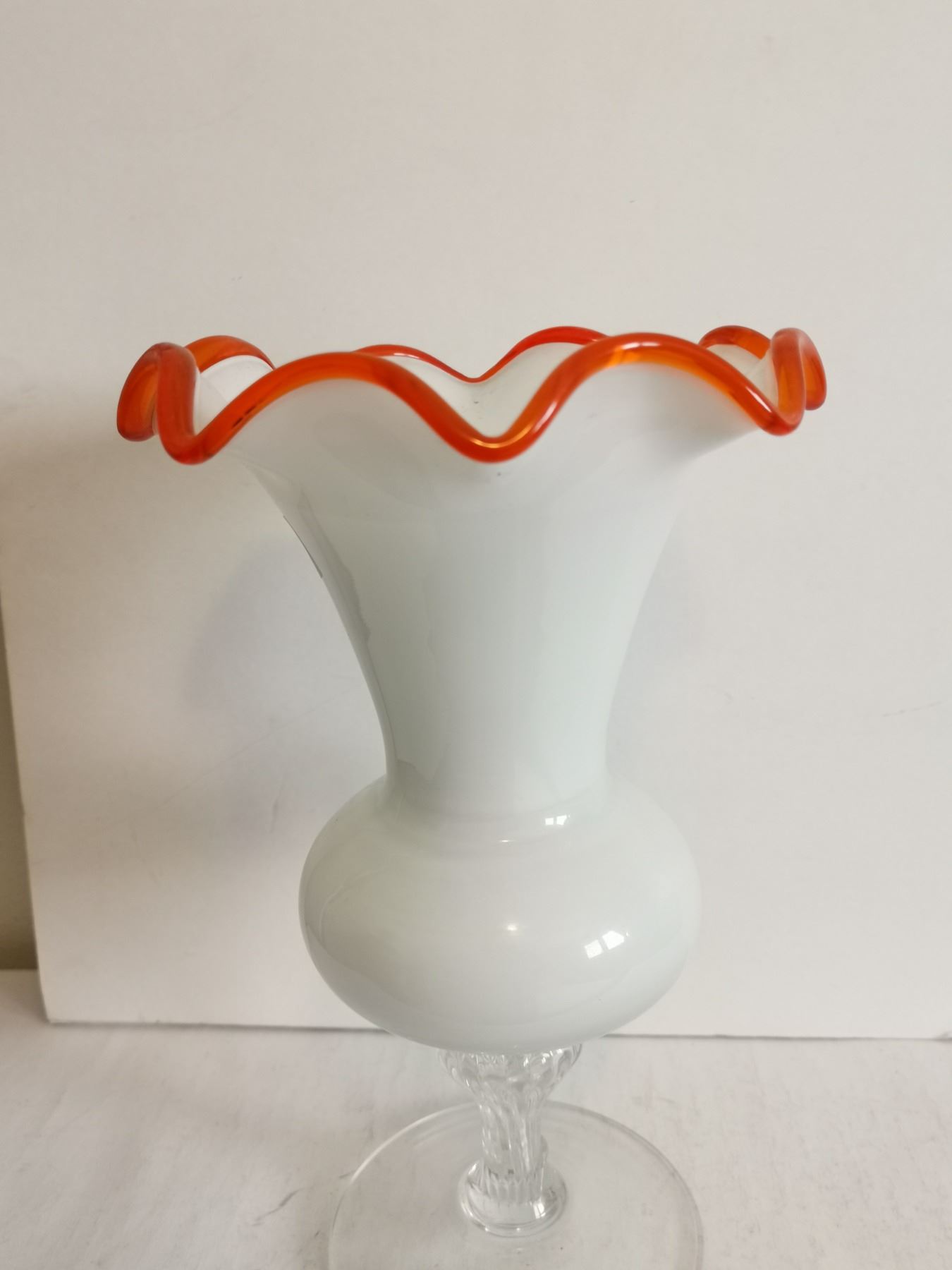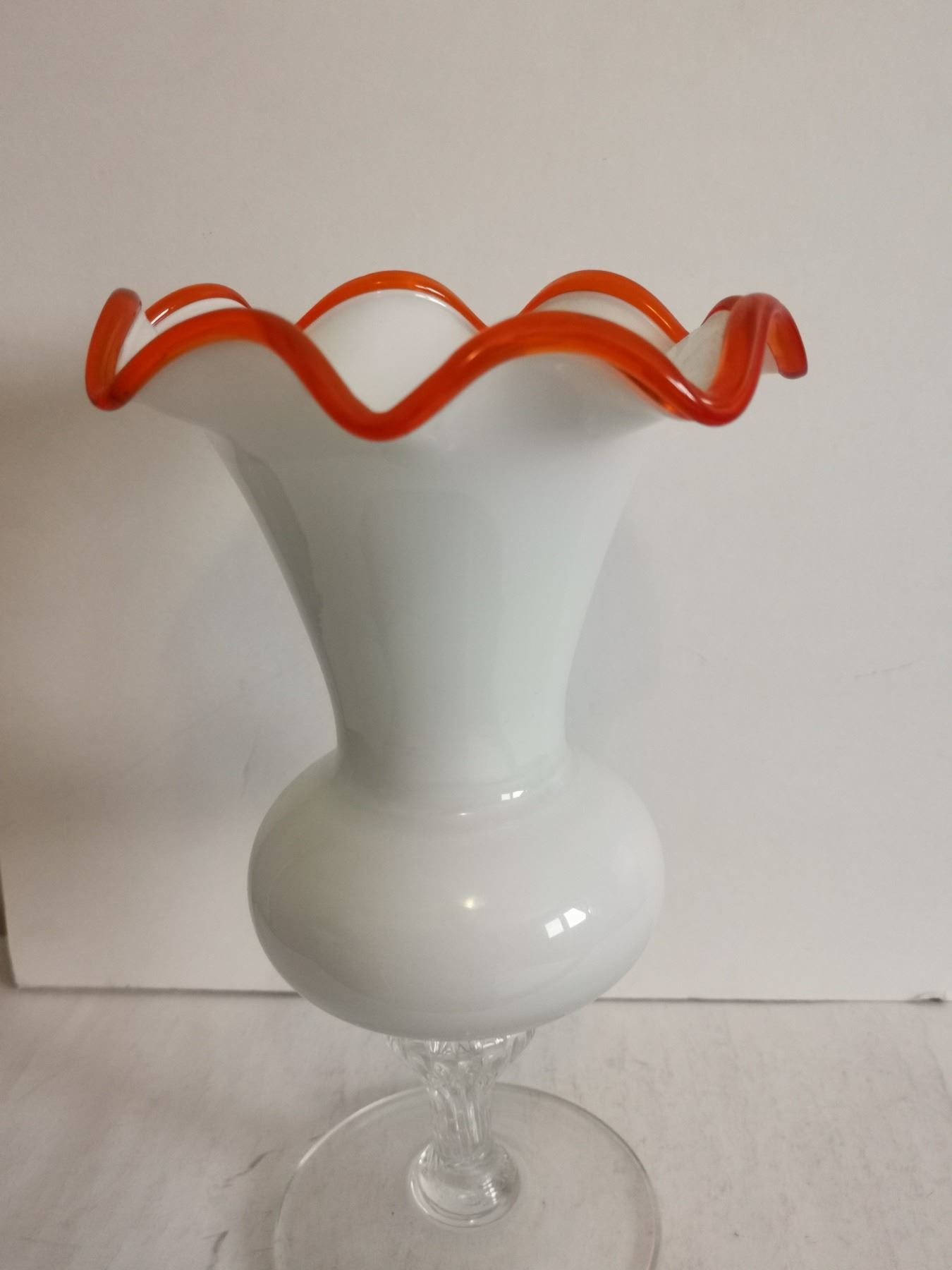 Fenton Milk Glass w/ Red Crest Footed Vase, 11”