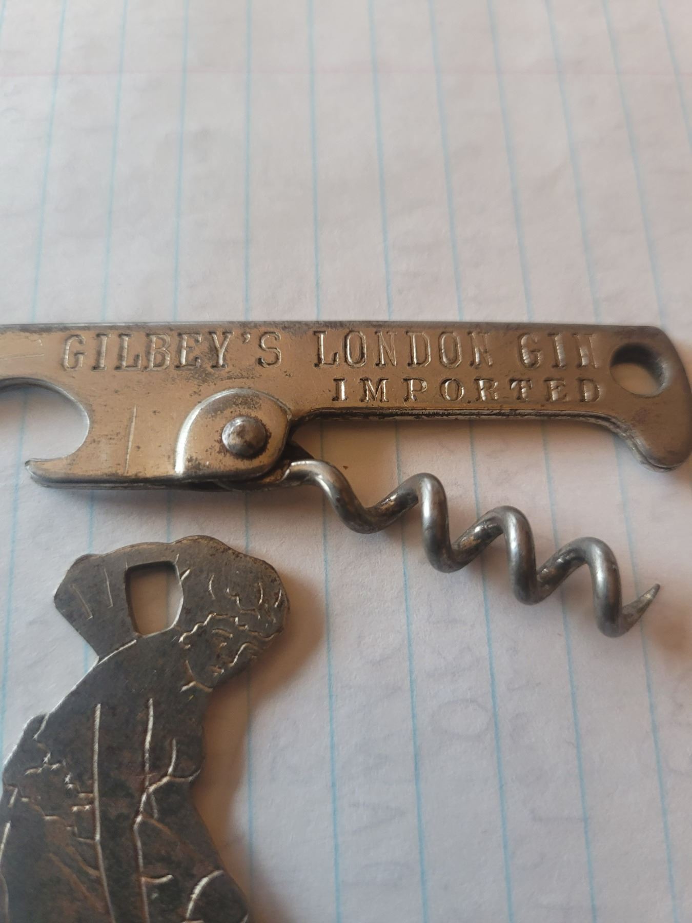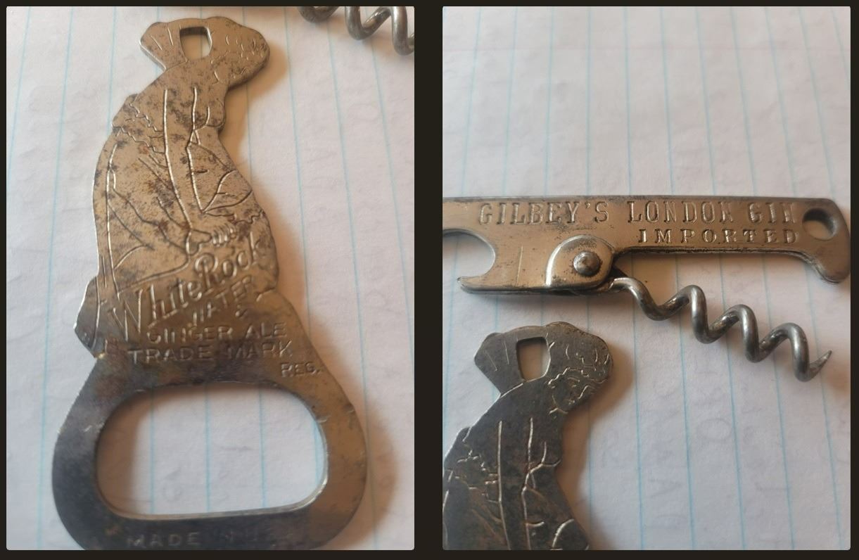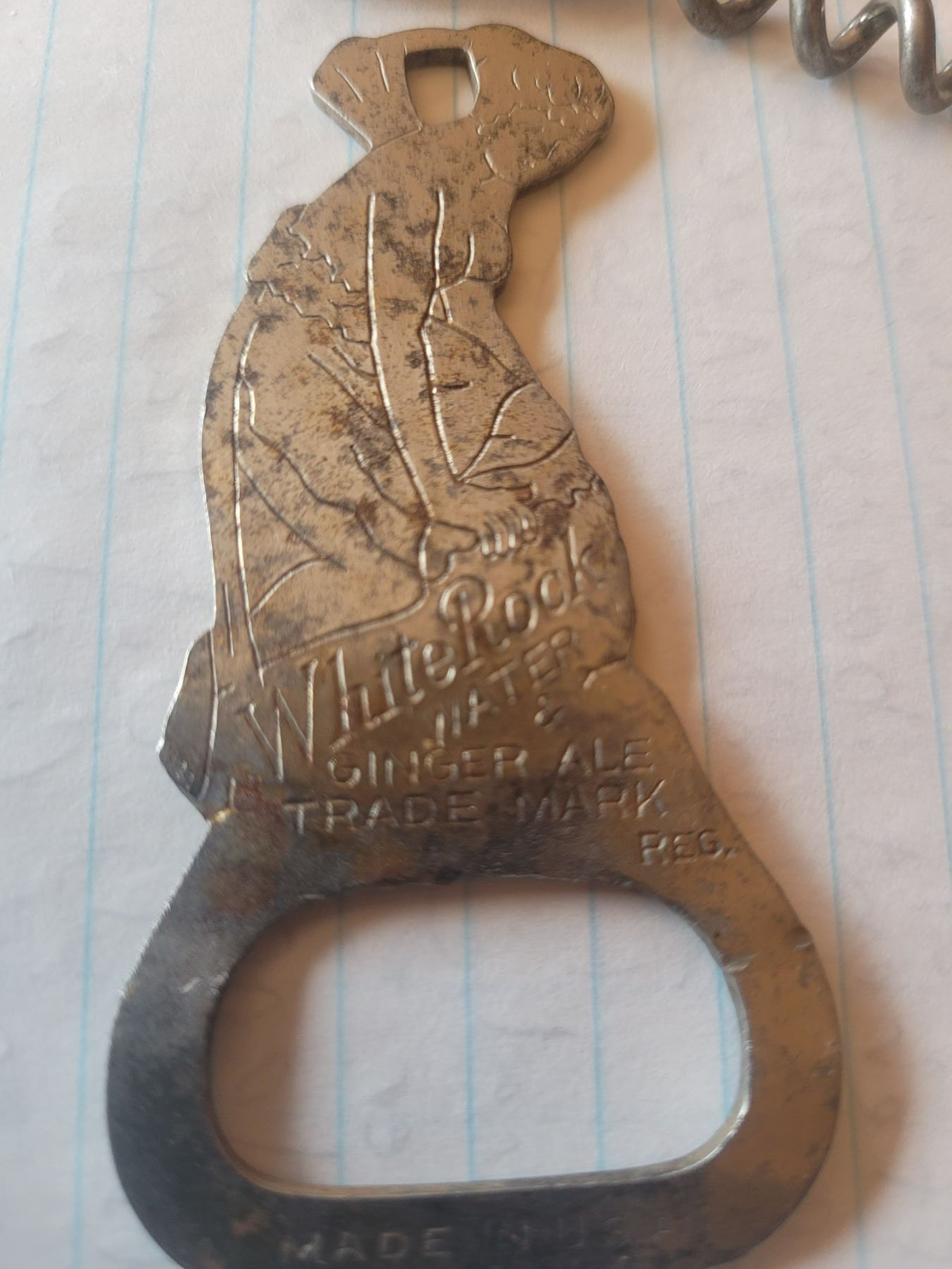 Figural woman (topless) advertising "White rock Water & Ginger Ale" Note the square hole at the top uses to turn up the lanterns of Model T oil Lamps bonus Gibley's Gin opener and corkscrew