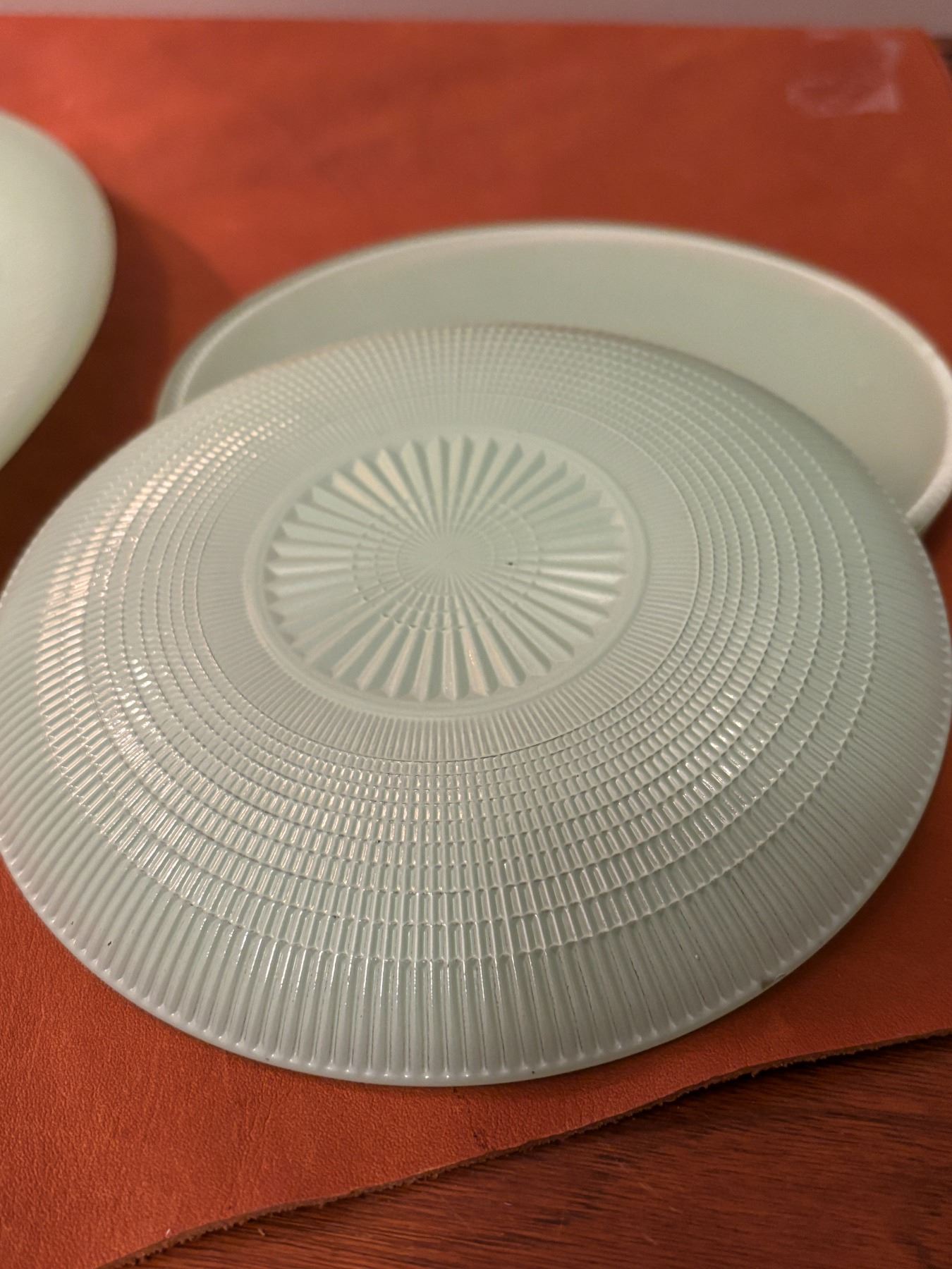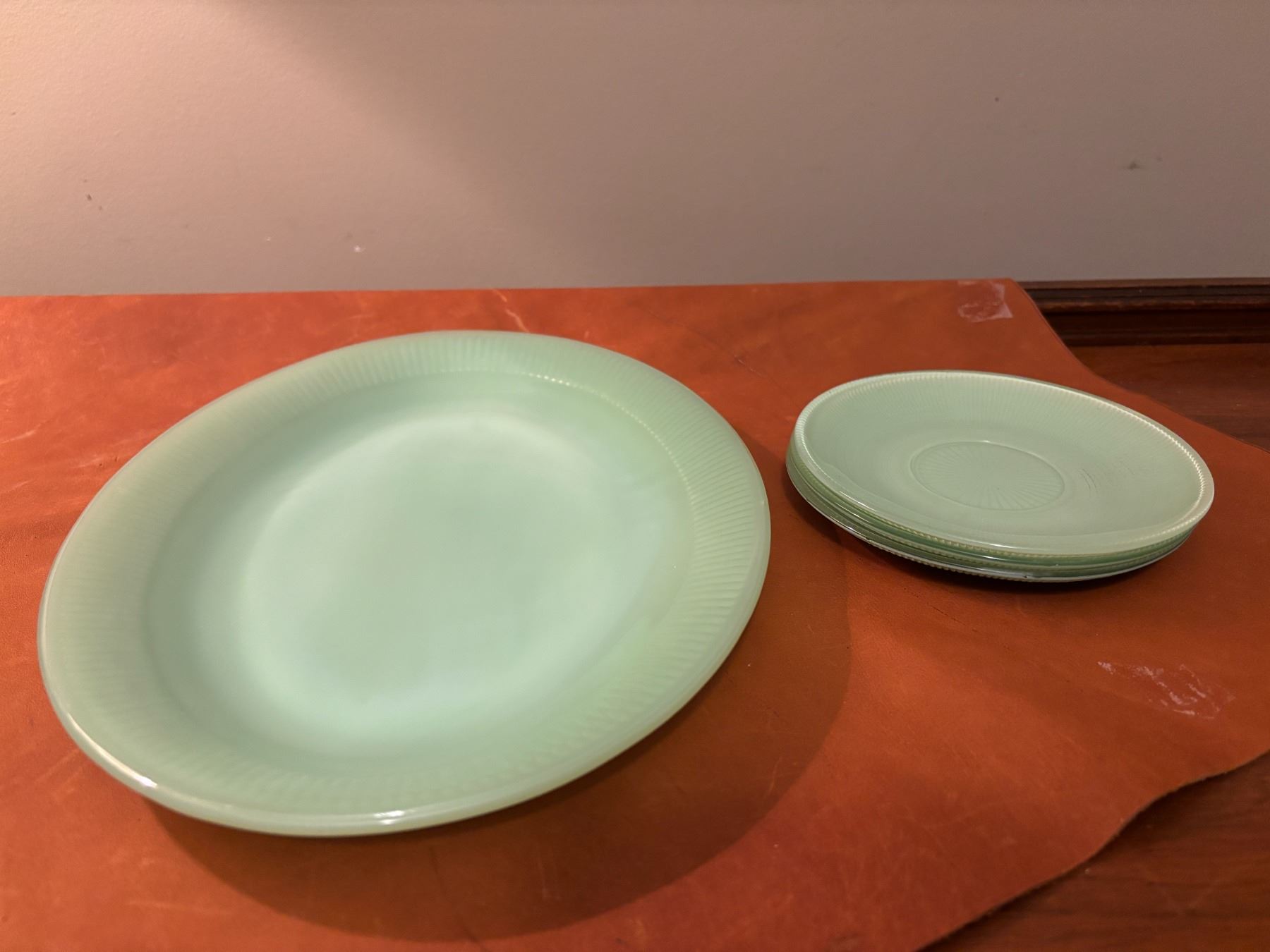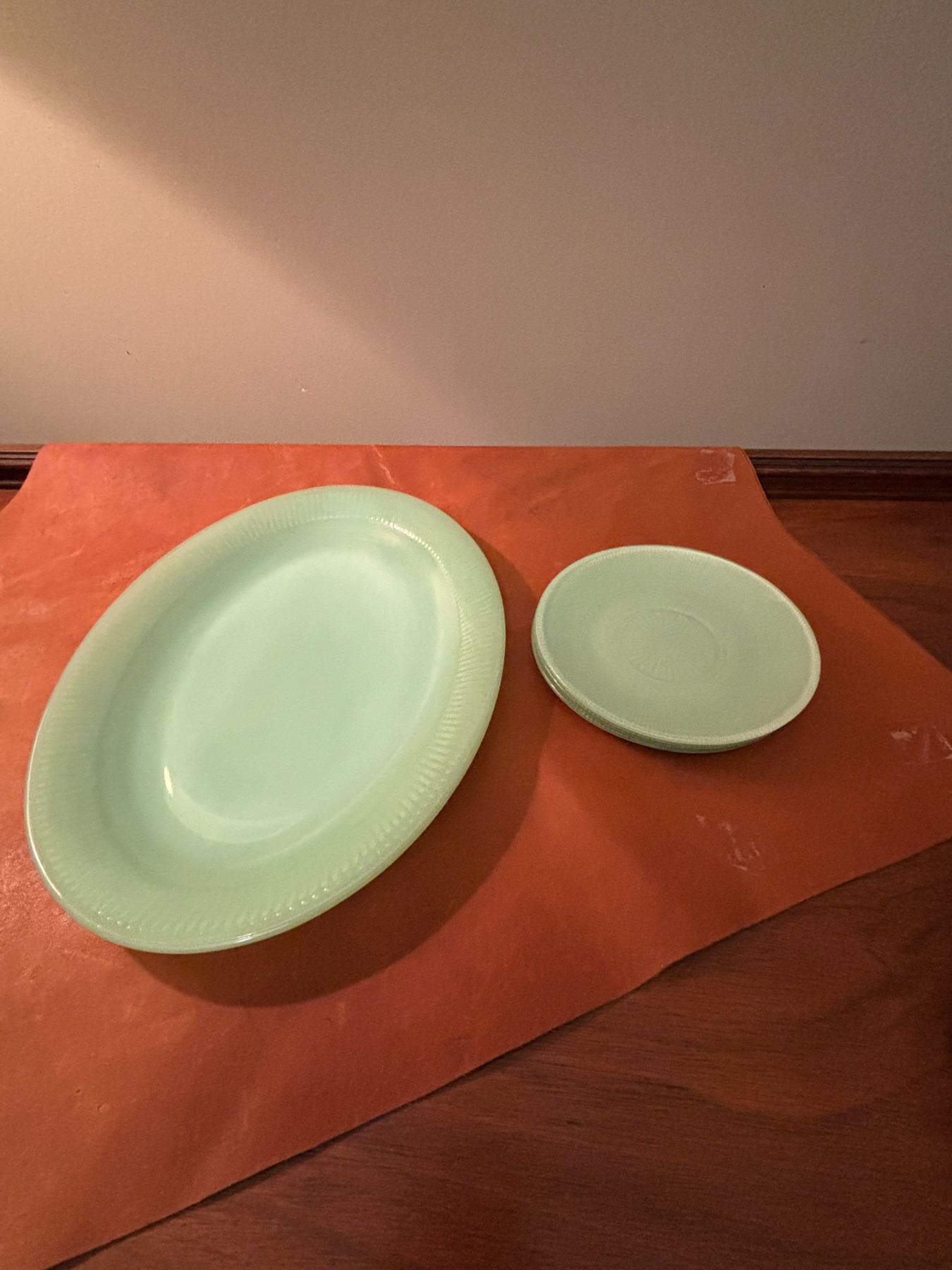 Jadeite platter is 12” long x 9” wide. It is smooth with a ribbed edge. The small plates are 6” across; are smooth on top and backside is textured. No chips/cracks