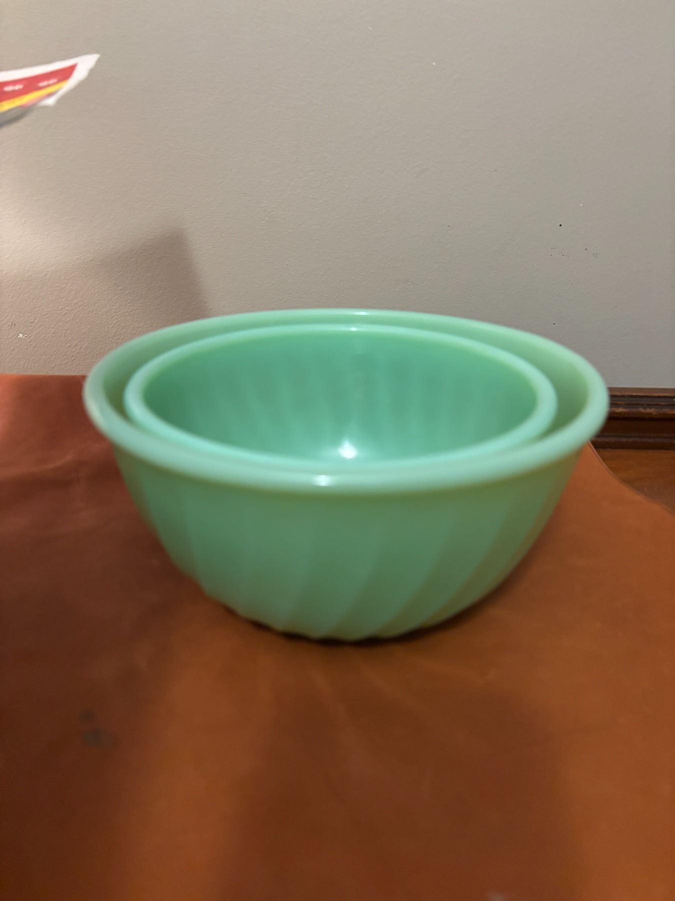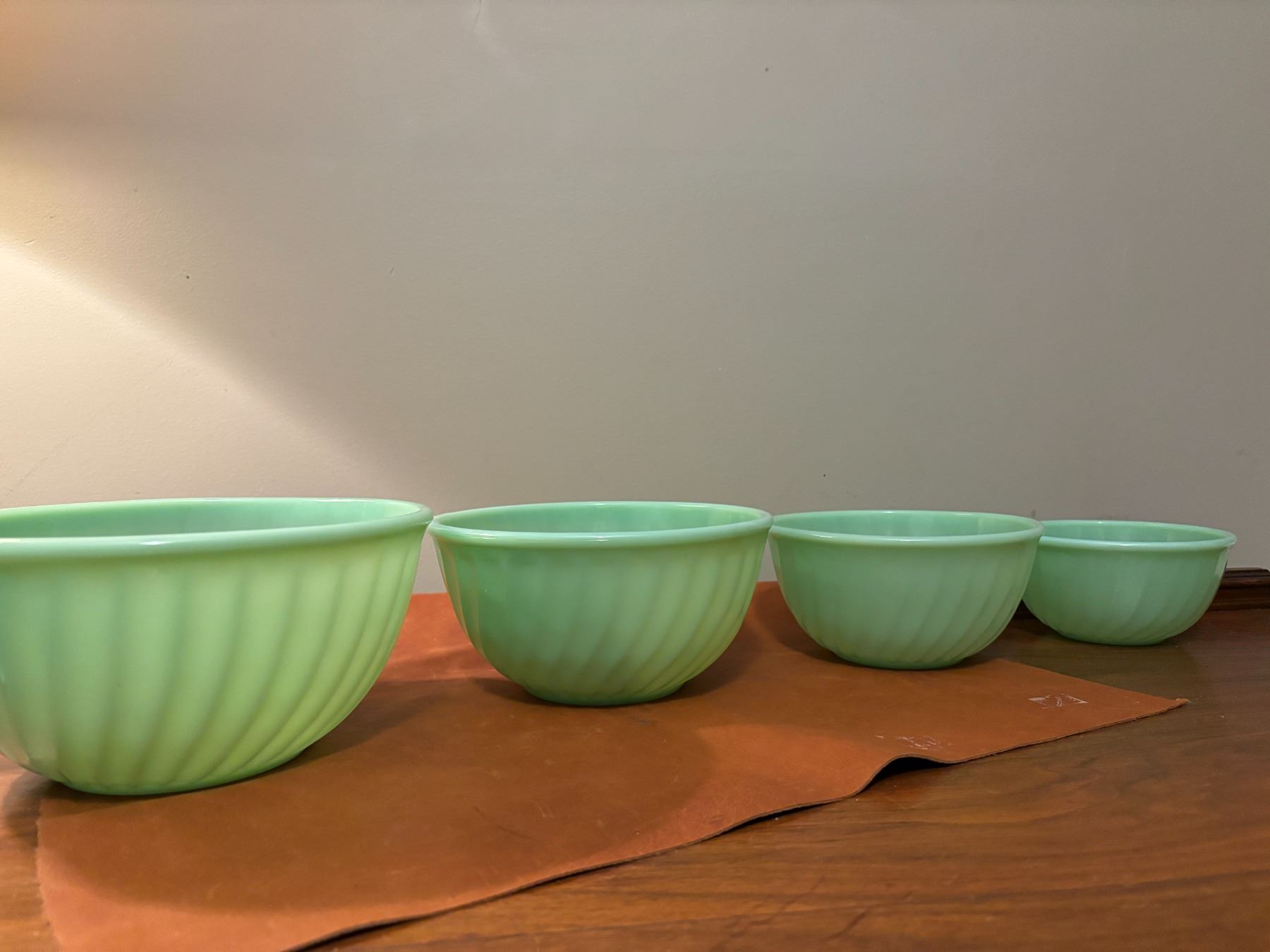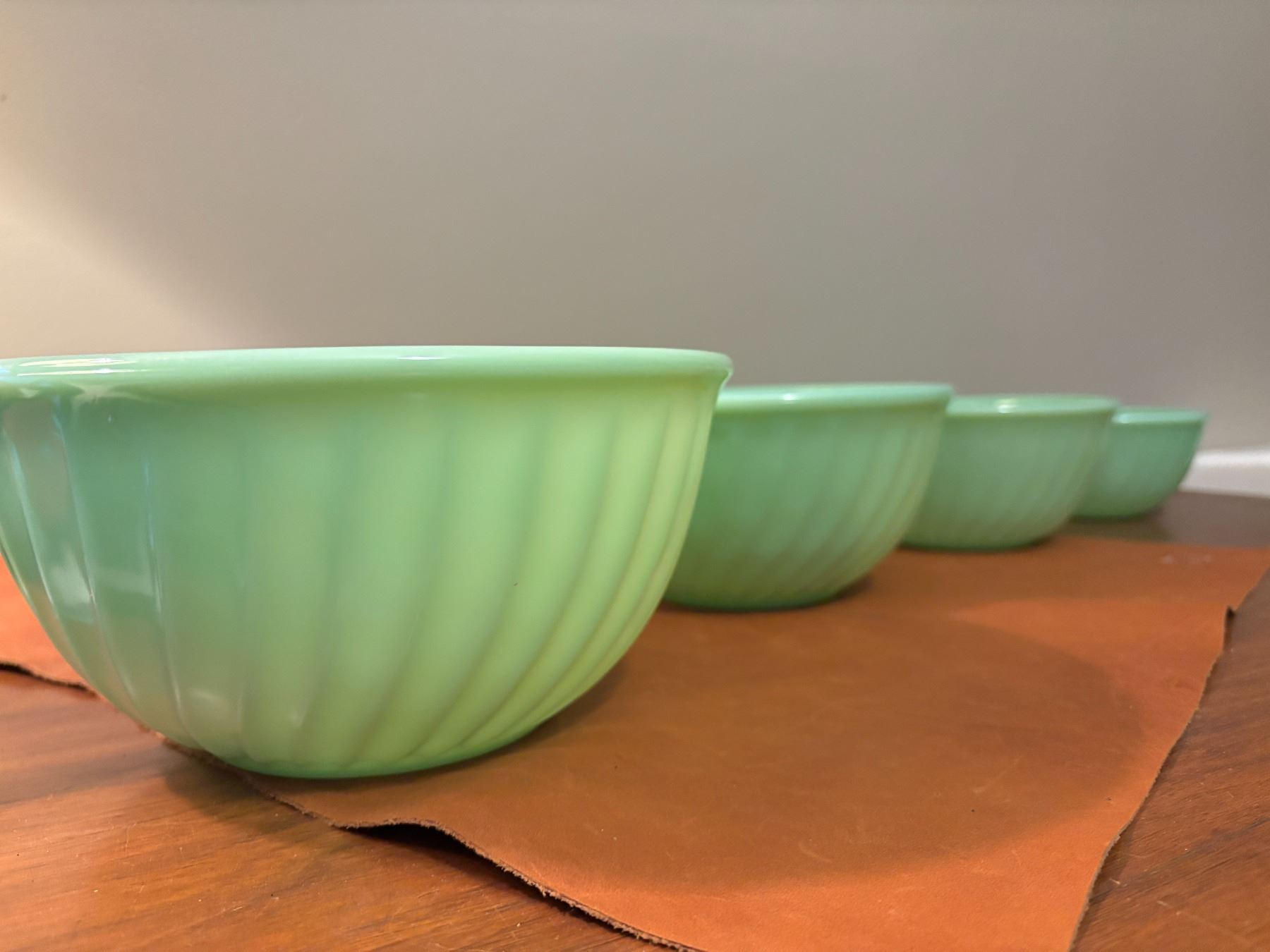 A complete set of the Fire King Jadeite swirl bowls. No chips/cracks/flaws. Hard to find a set! Largest bowl is 9” across.