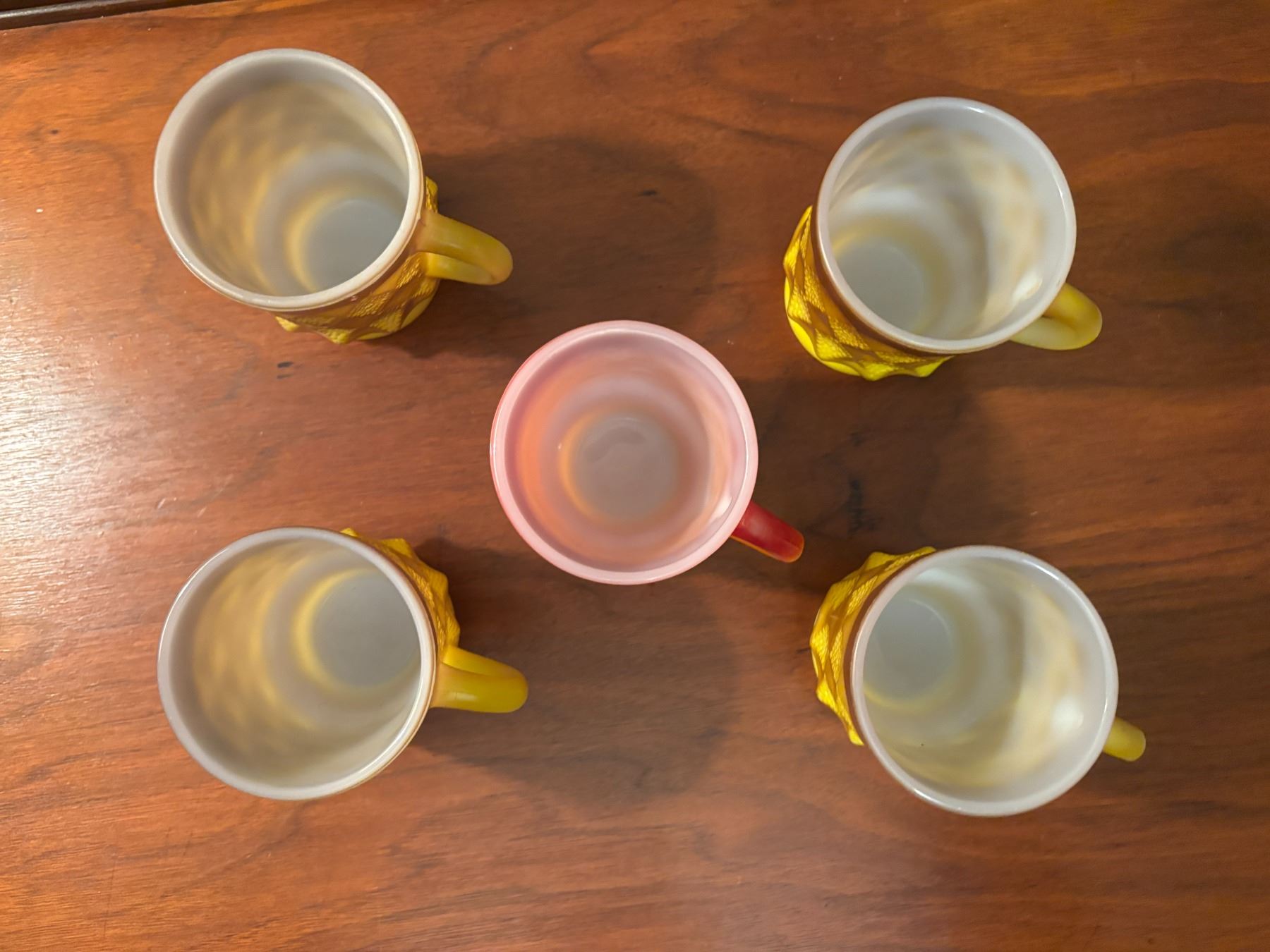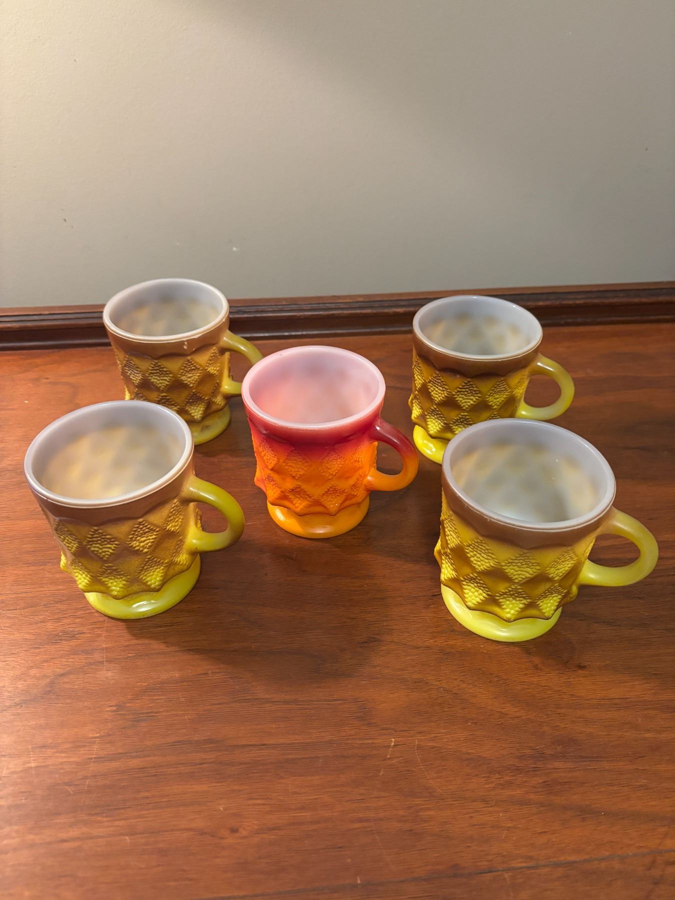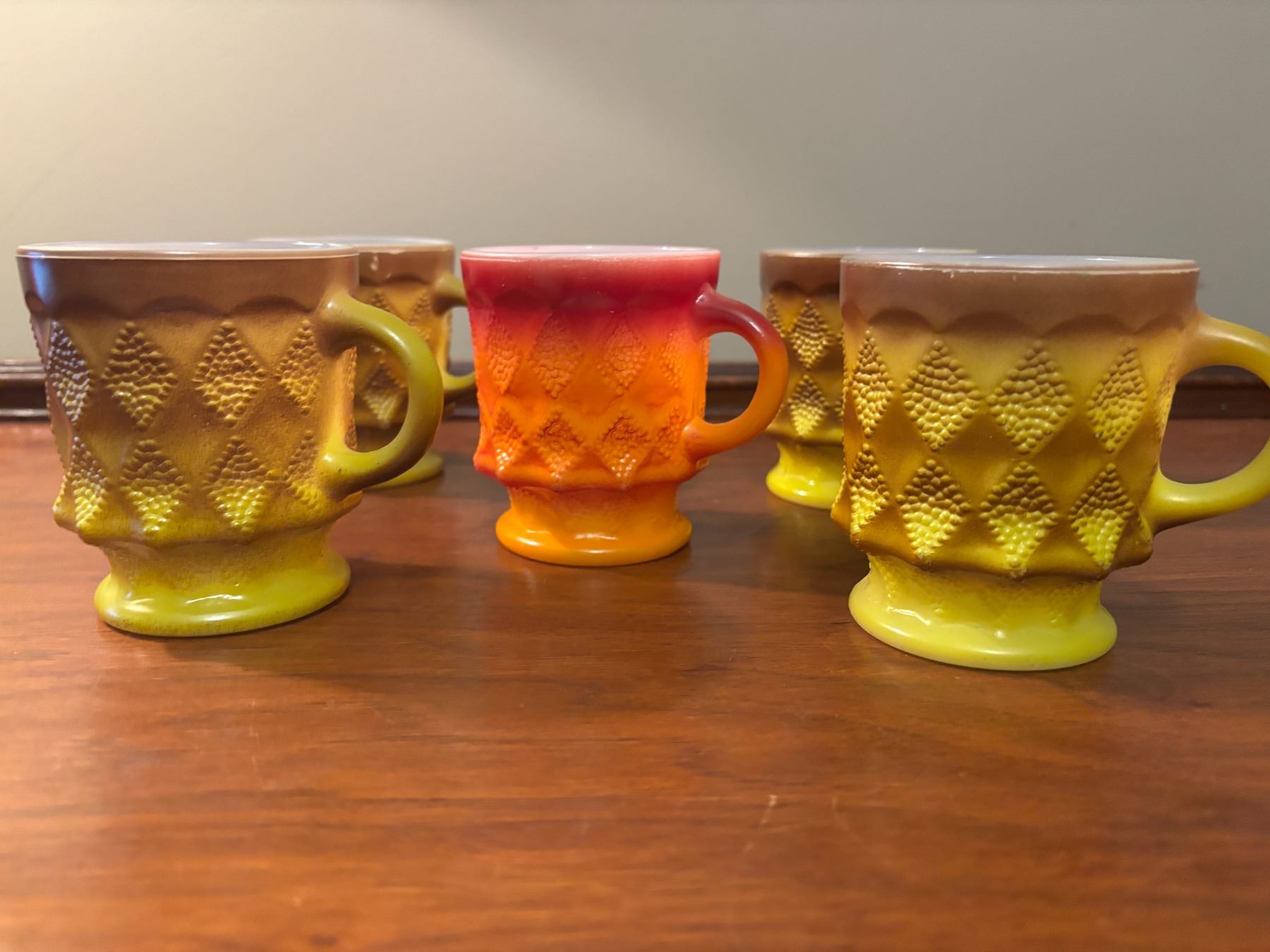 (1) Orange/red mug; (4) yellow/brown mugs. All FireKing brand on bottom, no chips/cracks, paint is excellent, Anchor Hocking