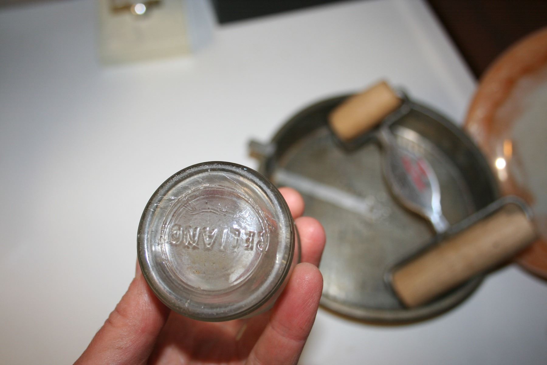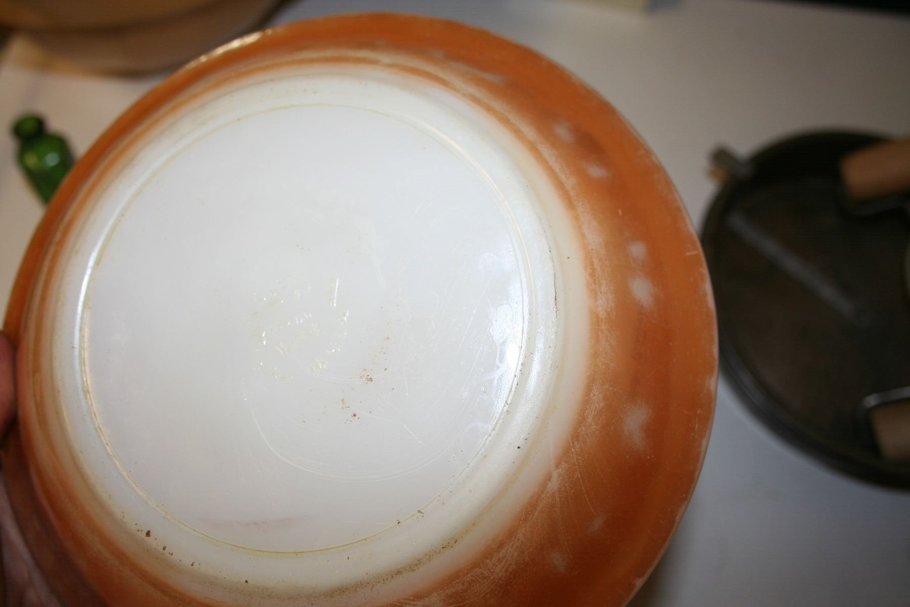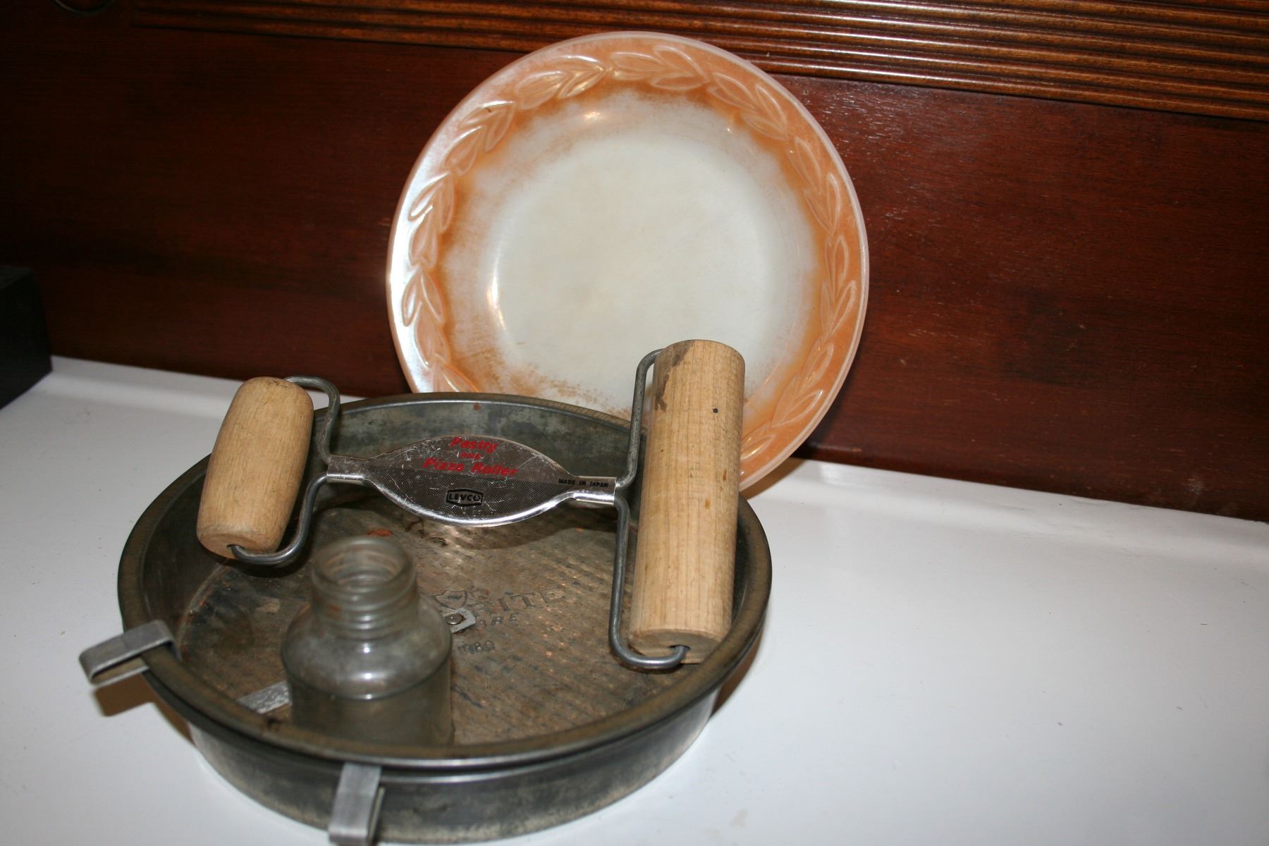 Fire King Oven Ware bowl, 2 Bake RiteTin Ware cake pans, Reliance Bottle, Levco Pasta and Pizza Roller
