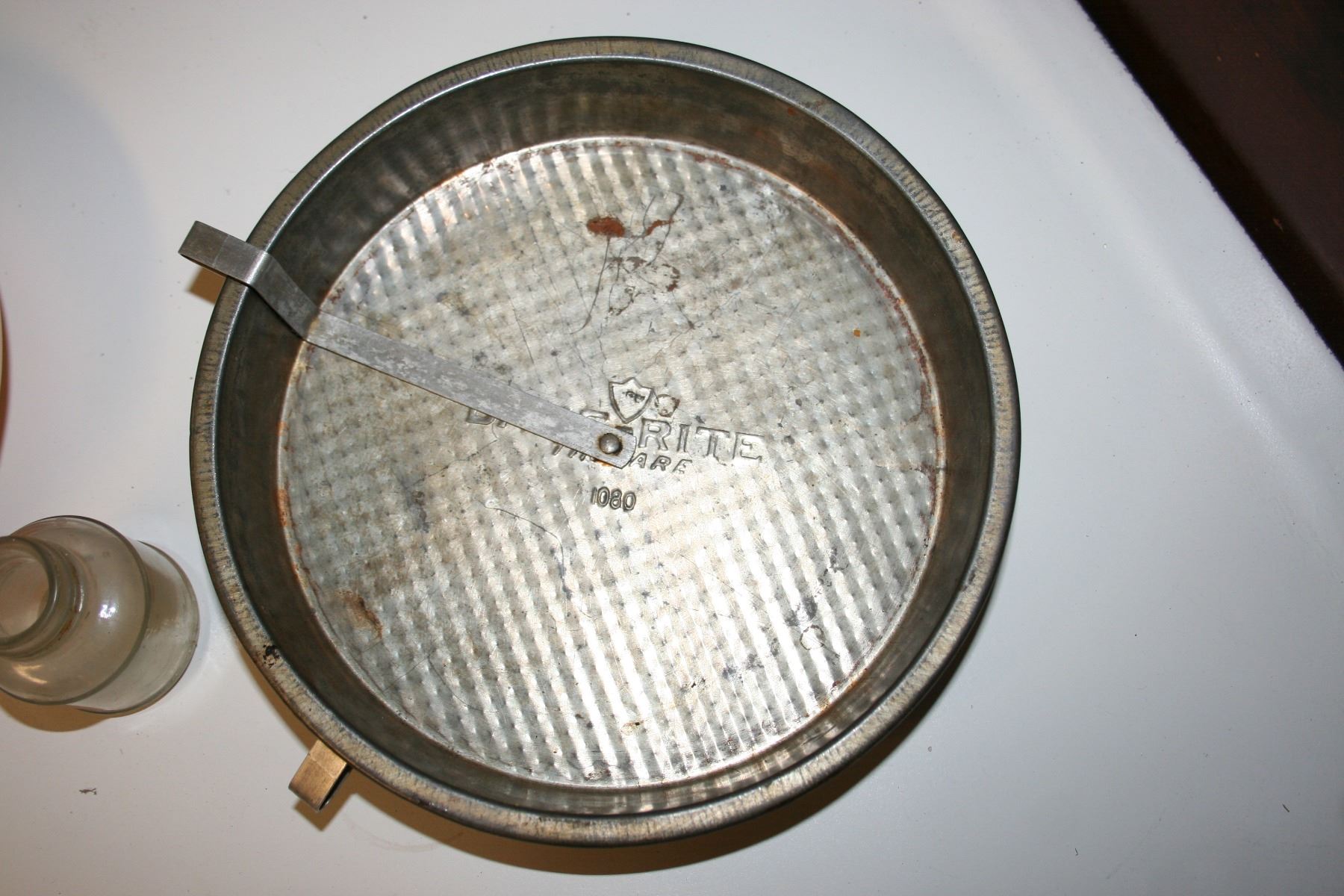 Fire King Oven Ware bowl, 2 Bake RiteTin Ware cake pans, Reliance Bottle, Levco Pasta and Pizza Roll