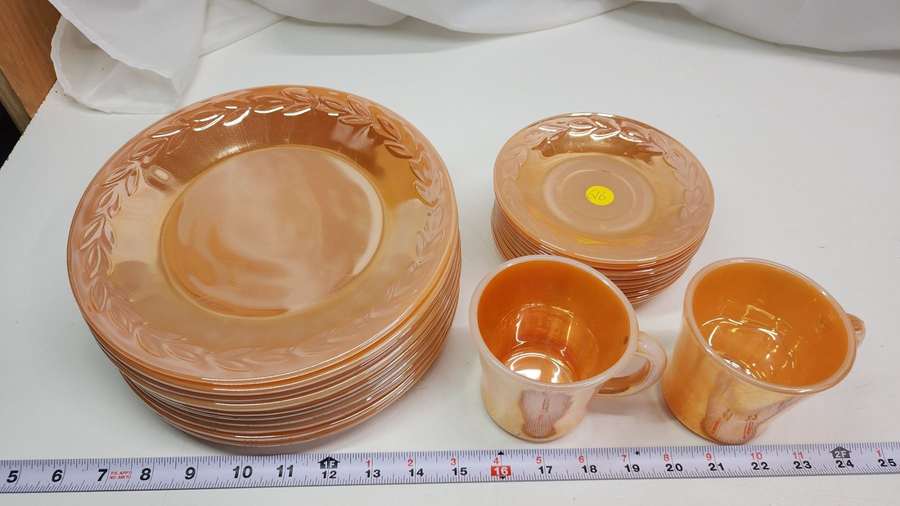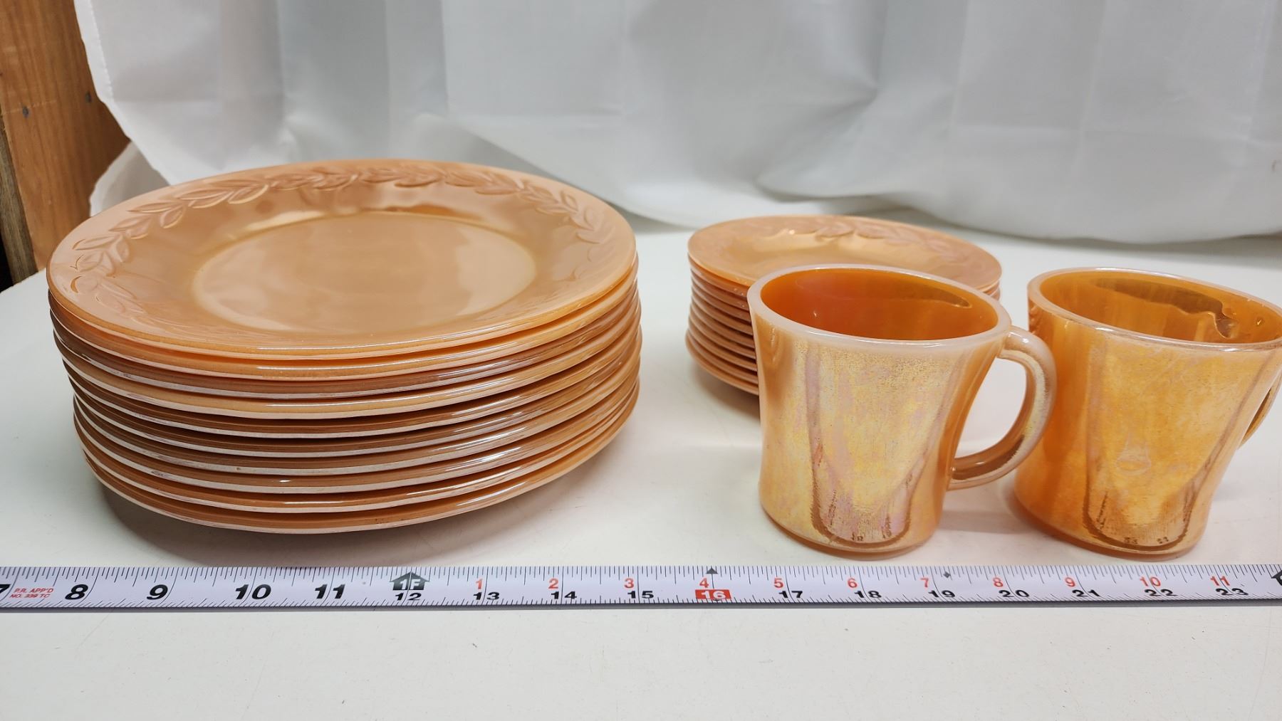"Fire King" Peach lustre - 10 dinner plates, 10 side plates, and 2 cups