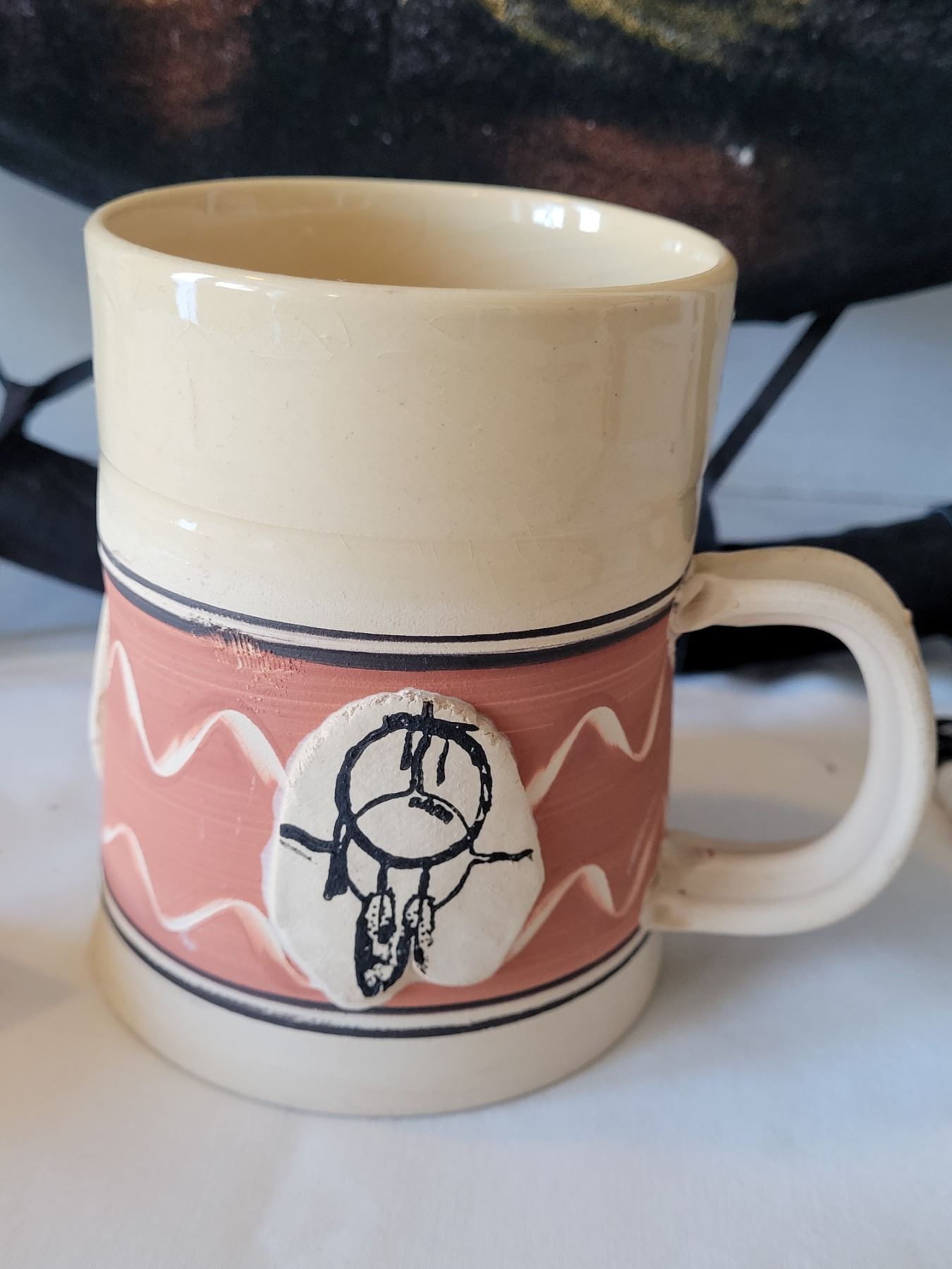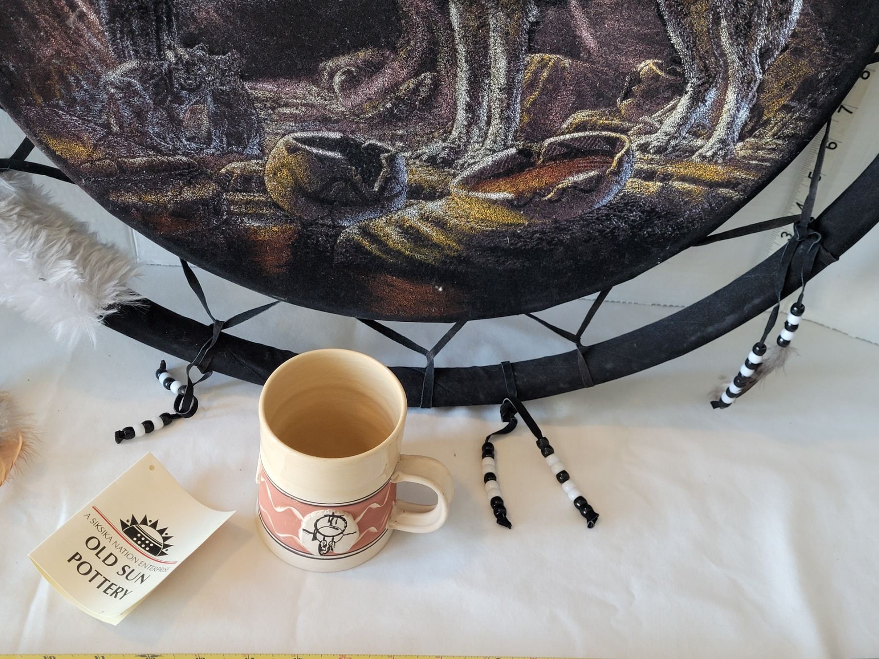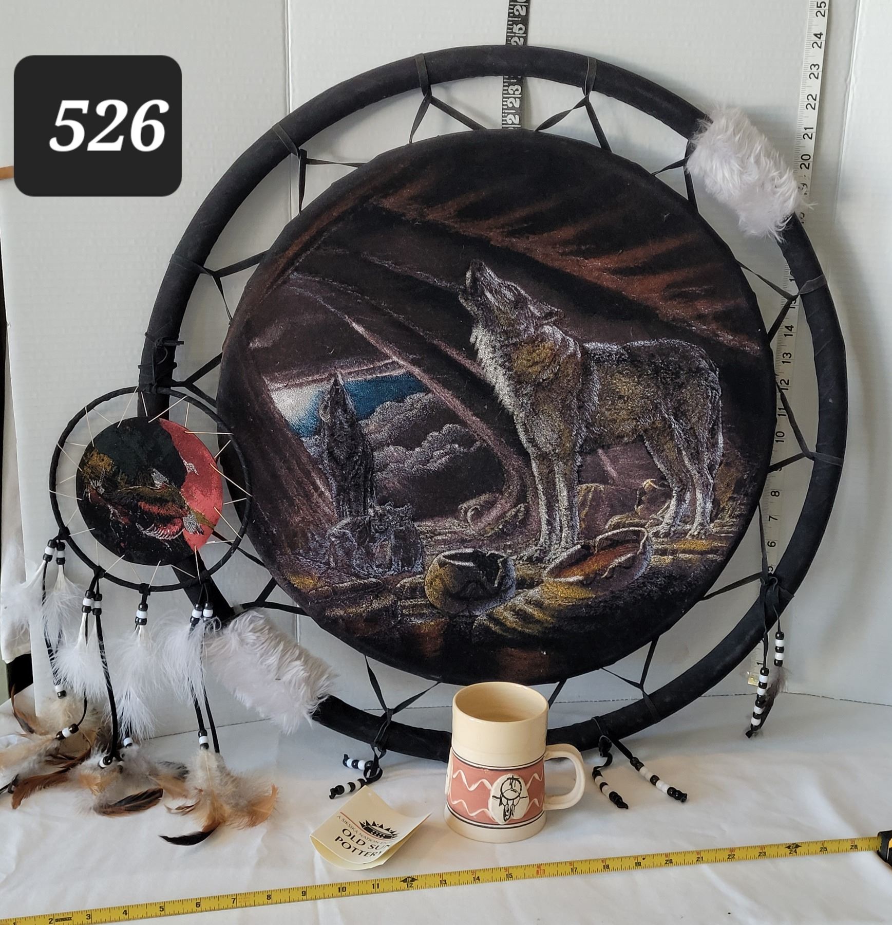 First nation dream catcher. Wolf painted on velvet. Pottery mug hand made by Siksika nation.