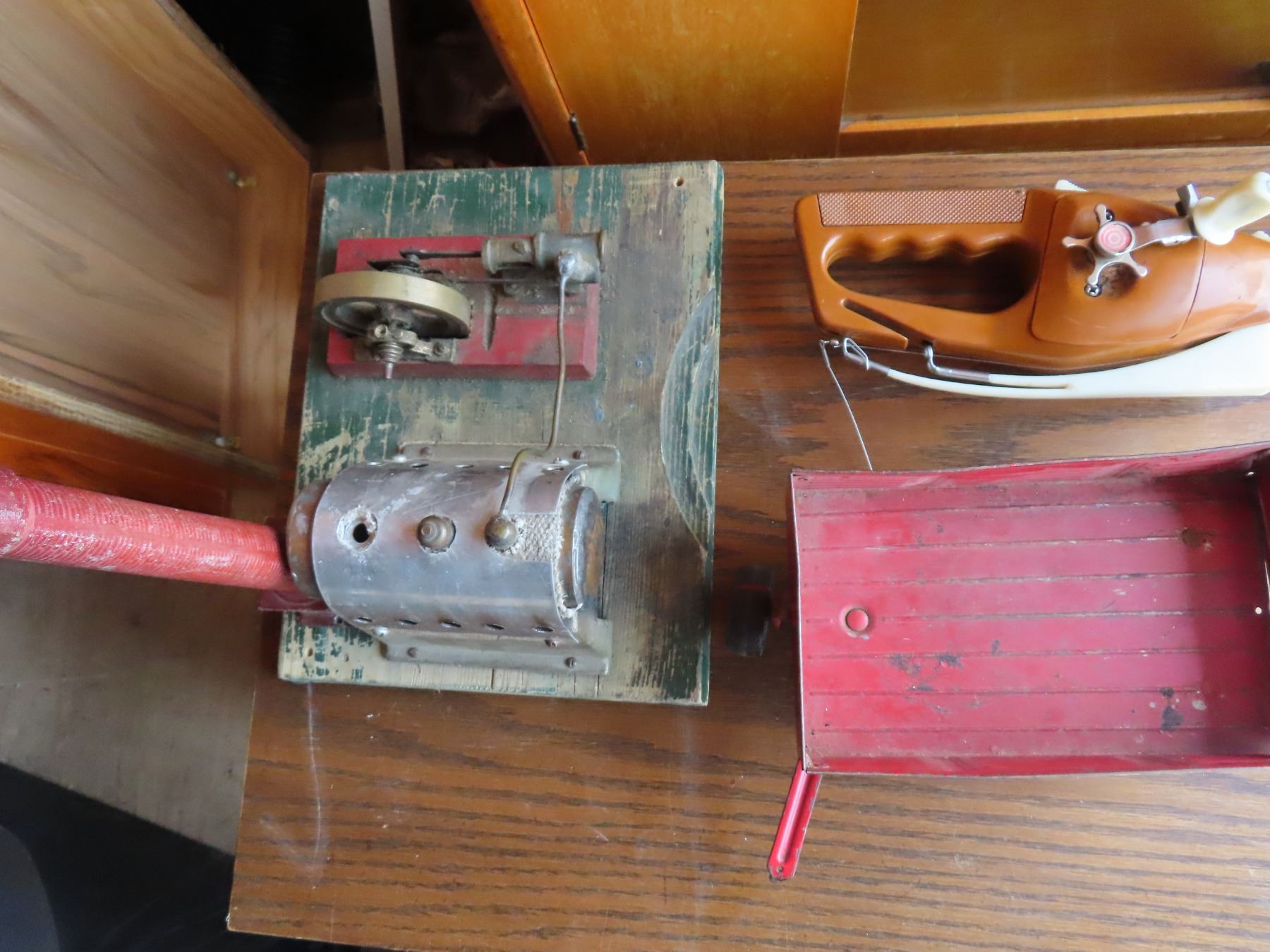 Fishing reel, wagon and vintage wiles co live steam engine toy