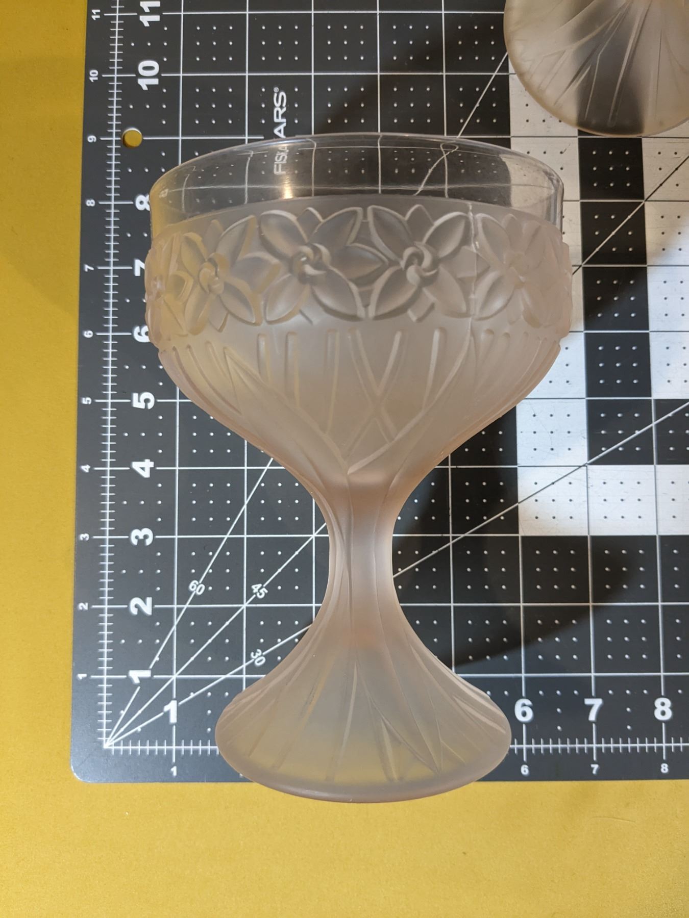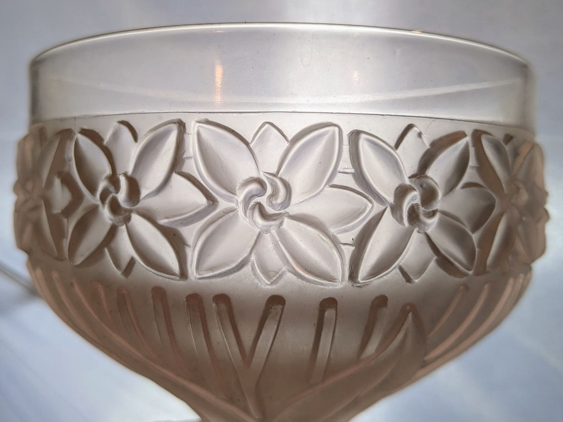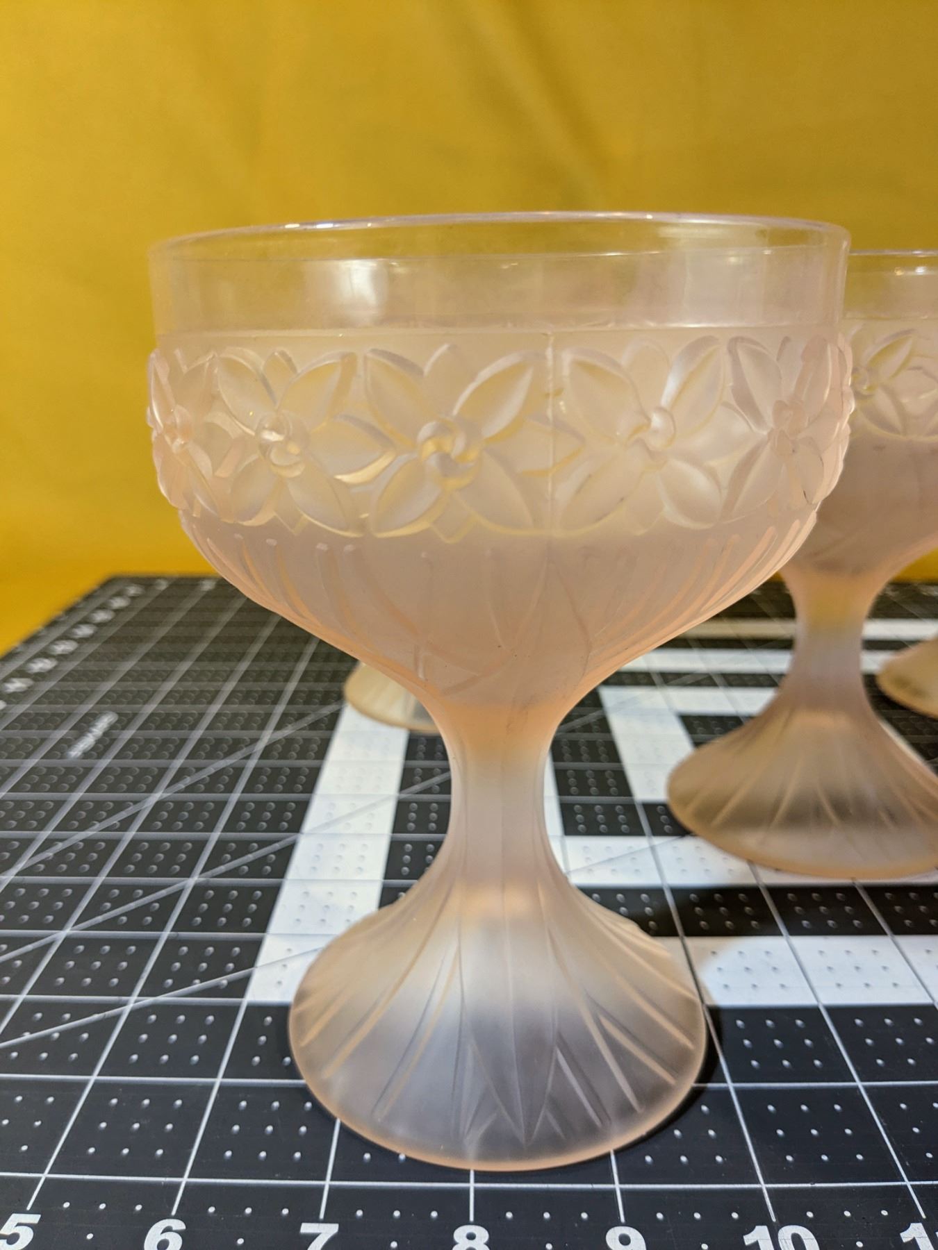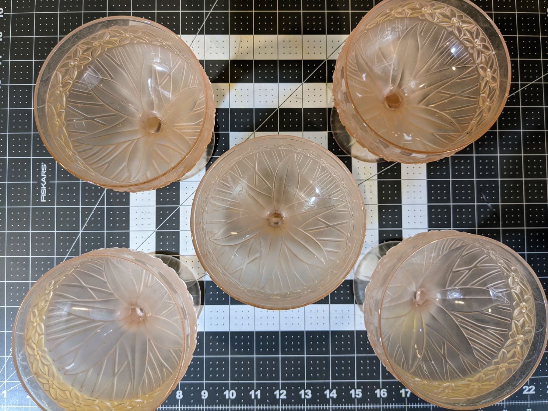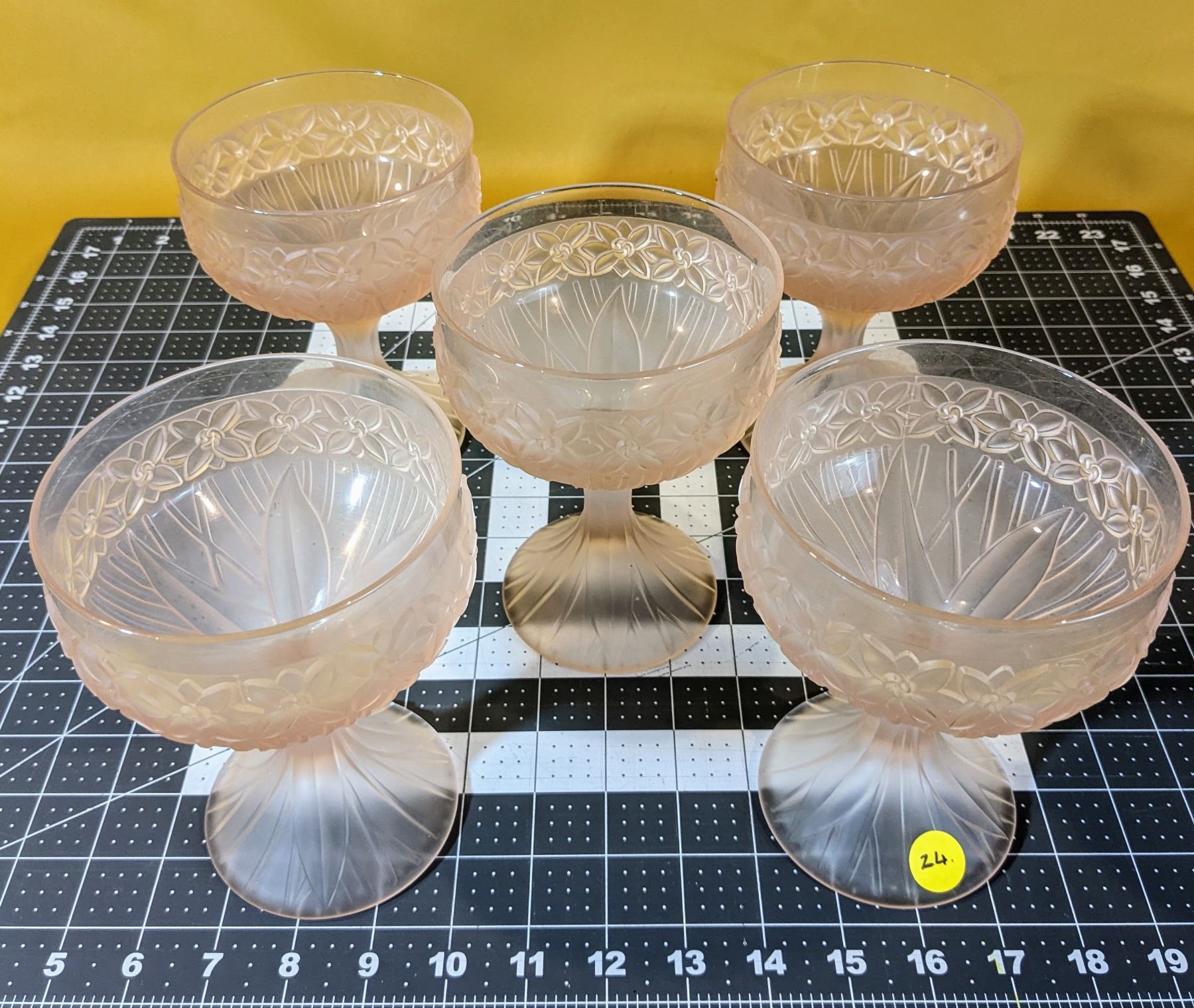 Five pieces of frosted pink glass in excellent condition. Footed dessert bowls.