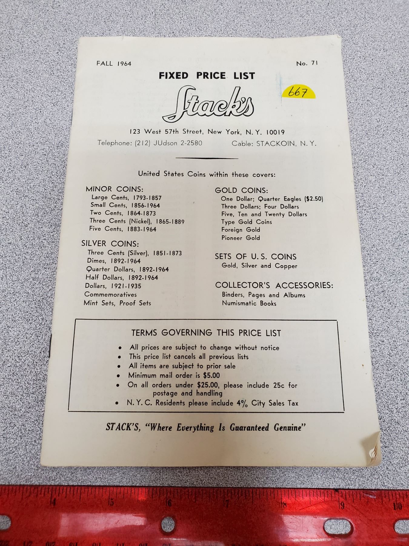 Fixed Price List from Stacks of New York, Fall 1964 edition. Lists the American coins for sale by this important U.S. coin firm.