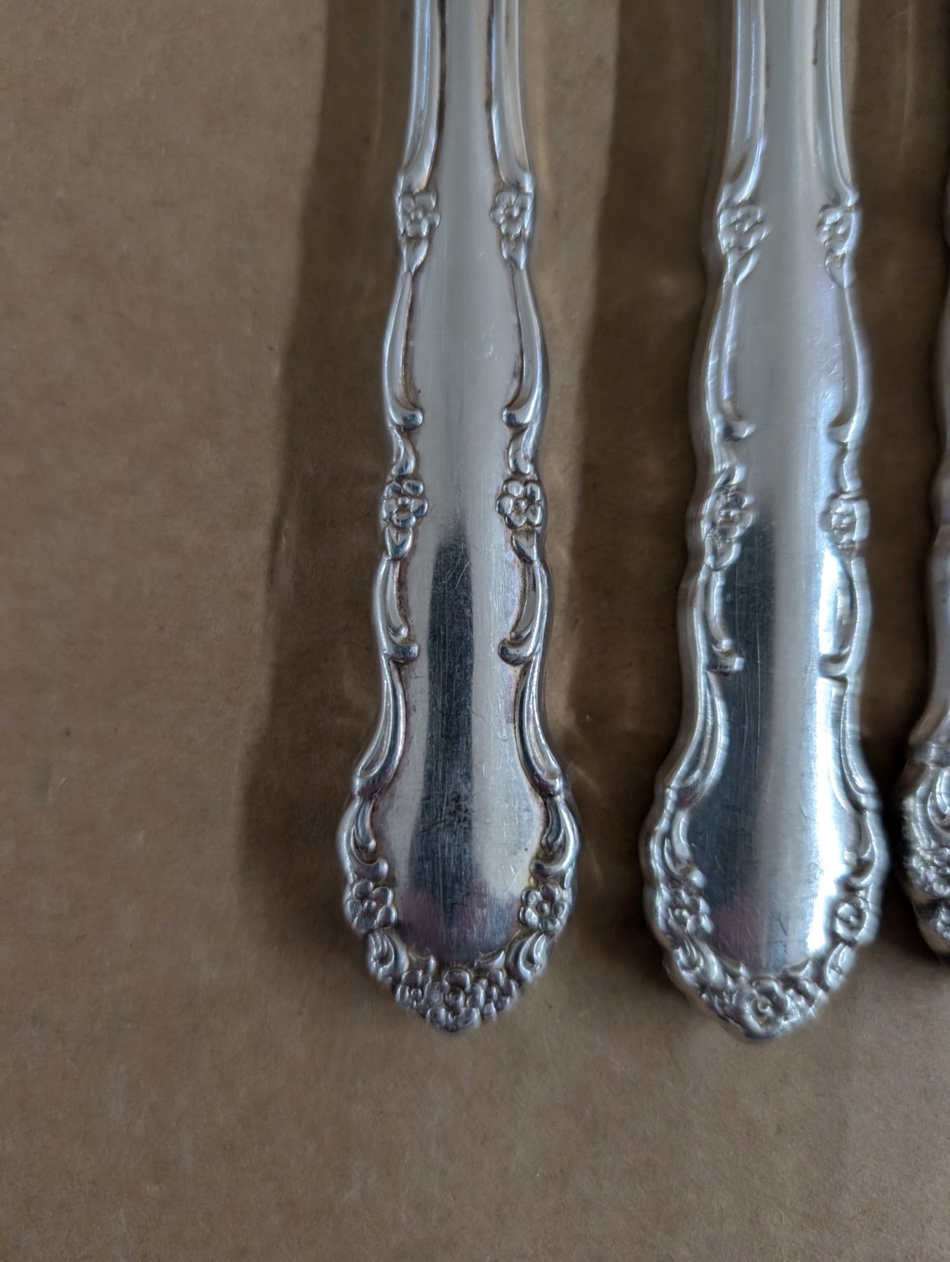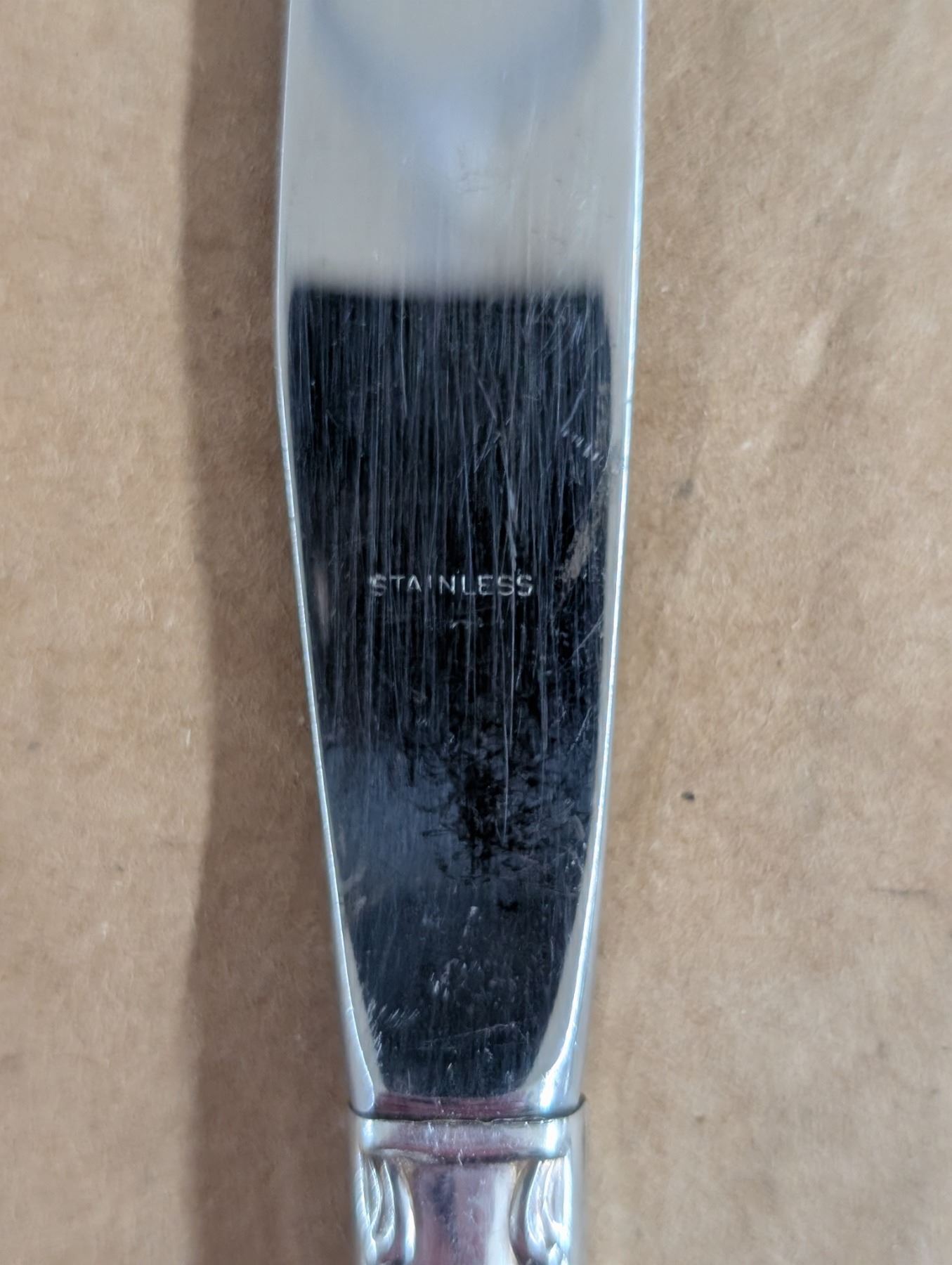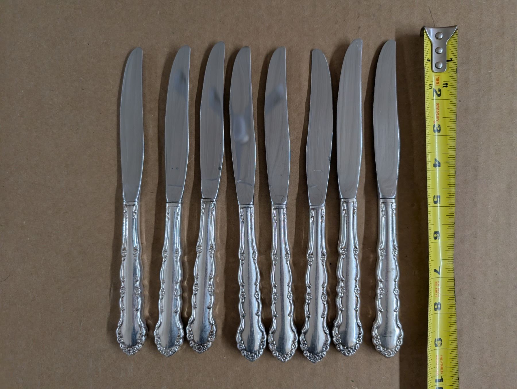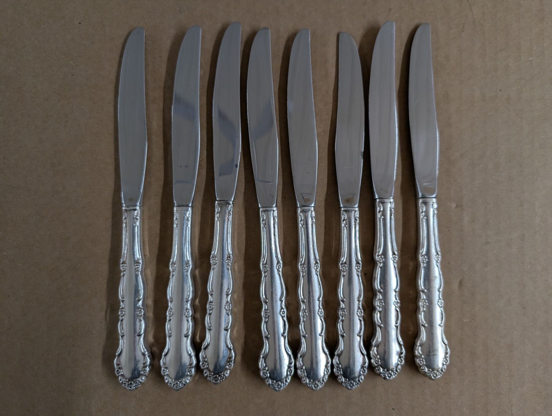 Flirtation Pattern Stainless Steel Dinner Knives - handles might be silver, unverified