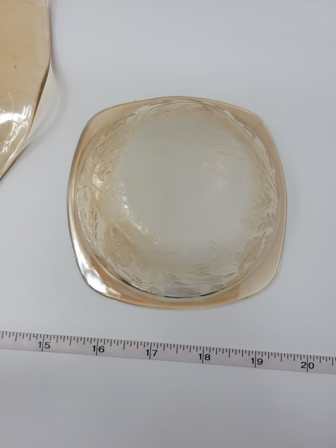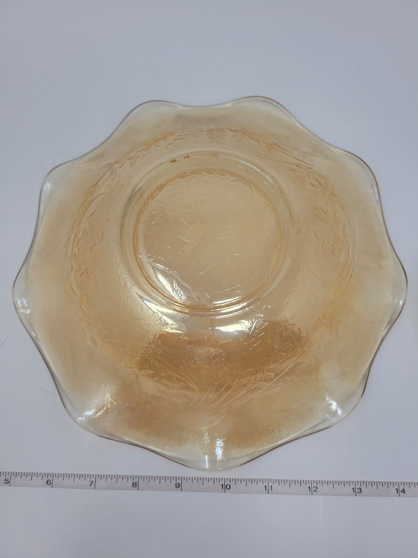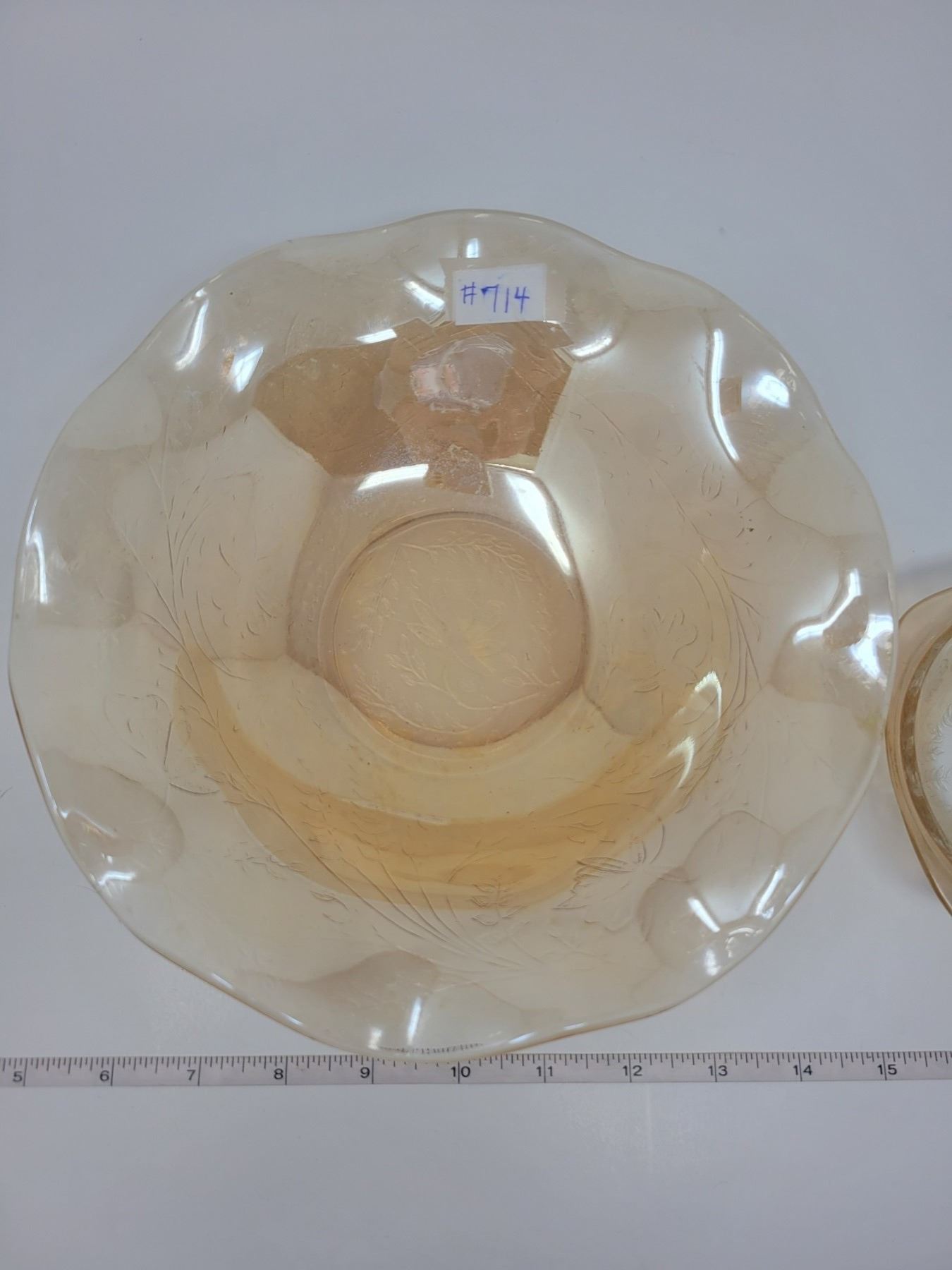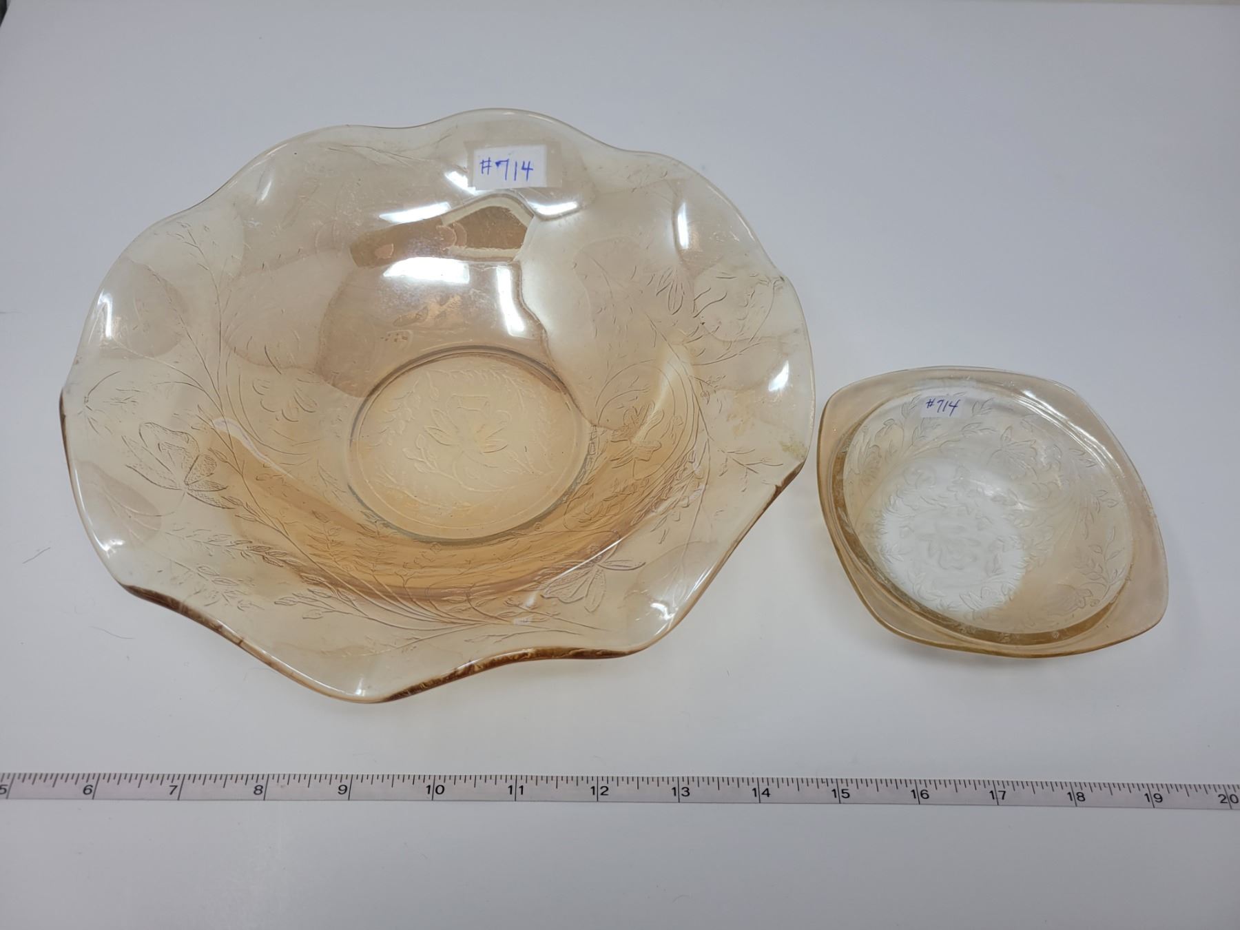 FloraGold ruffled bowl, 11 ½, and 4” berry bowl, Jeanette Glass