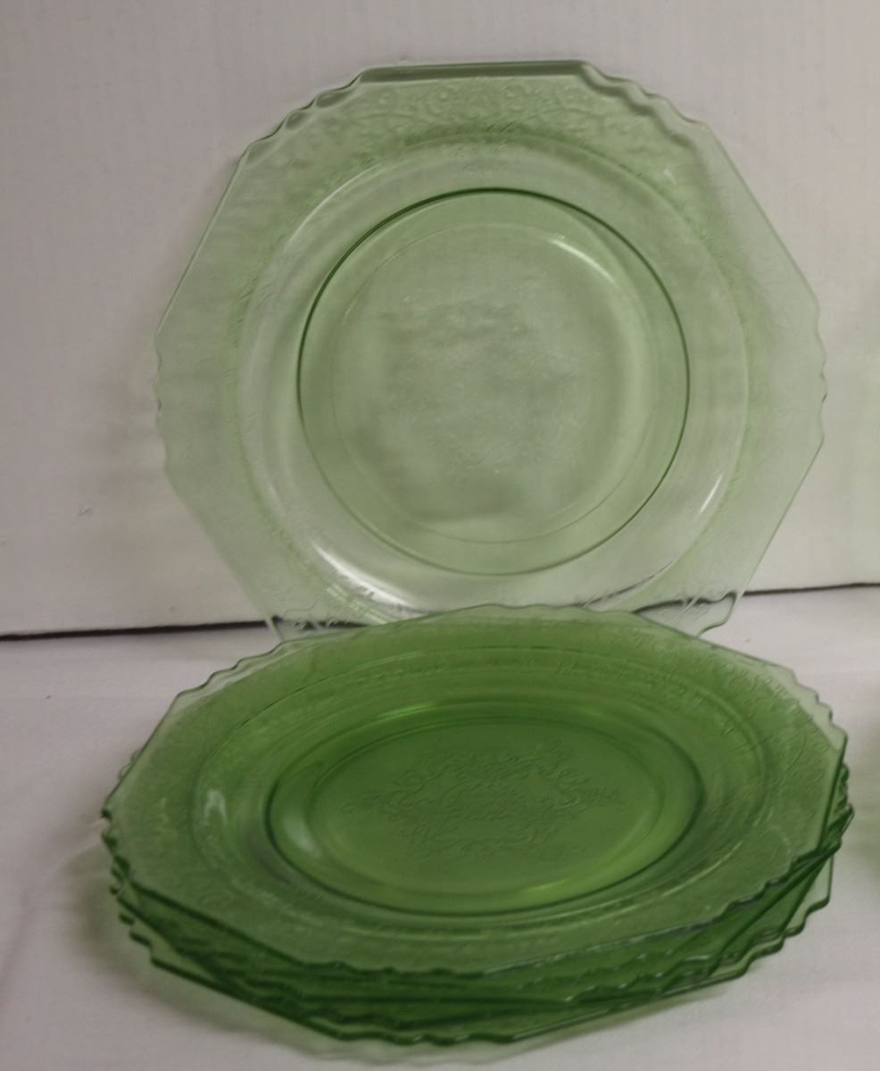 6 green Florentine depression plates