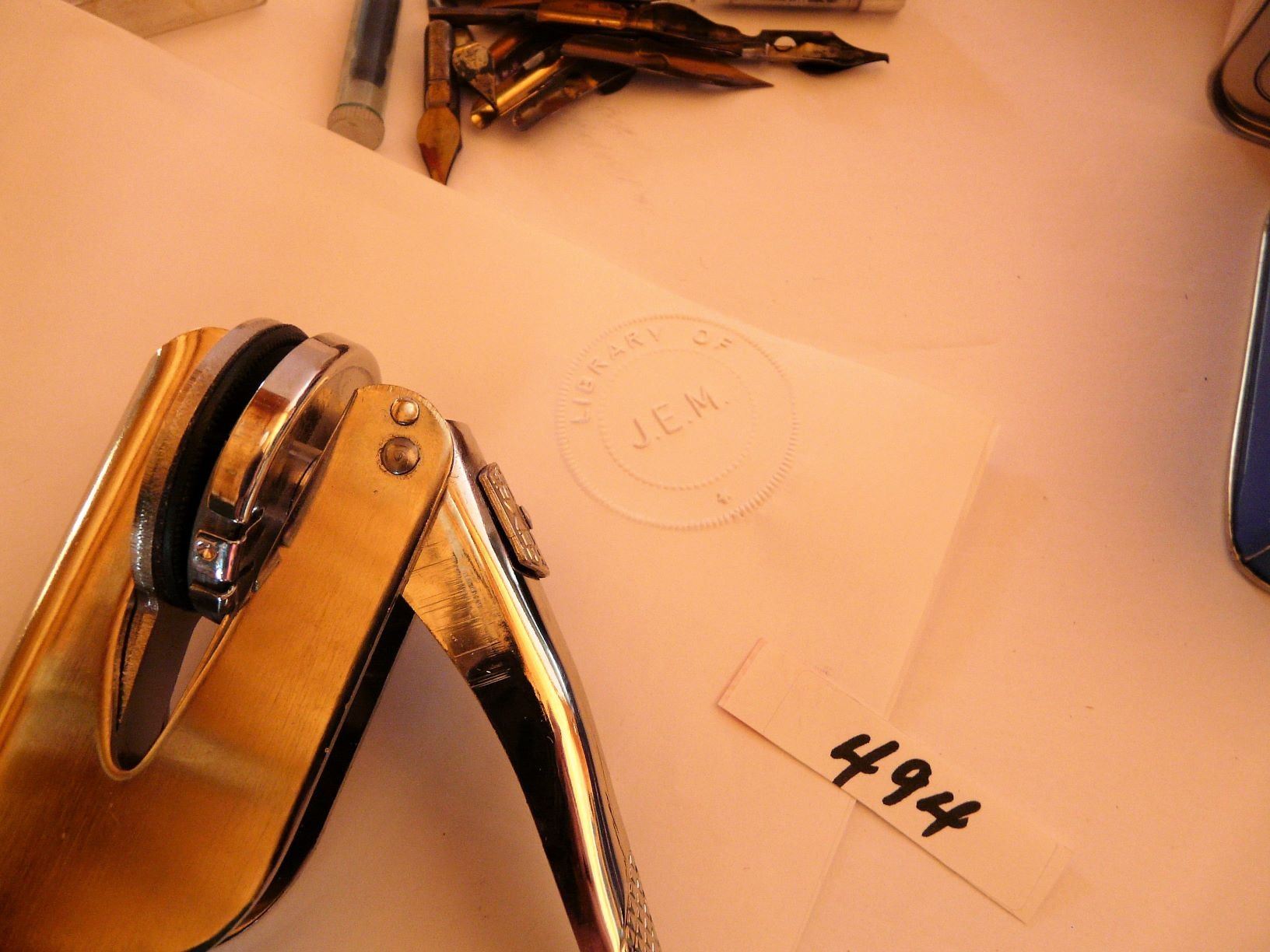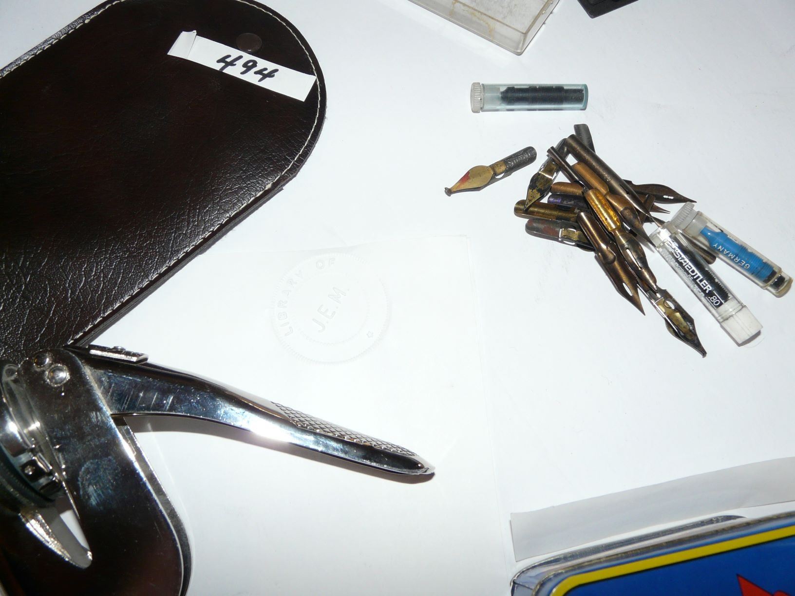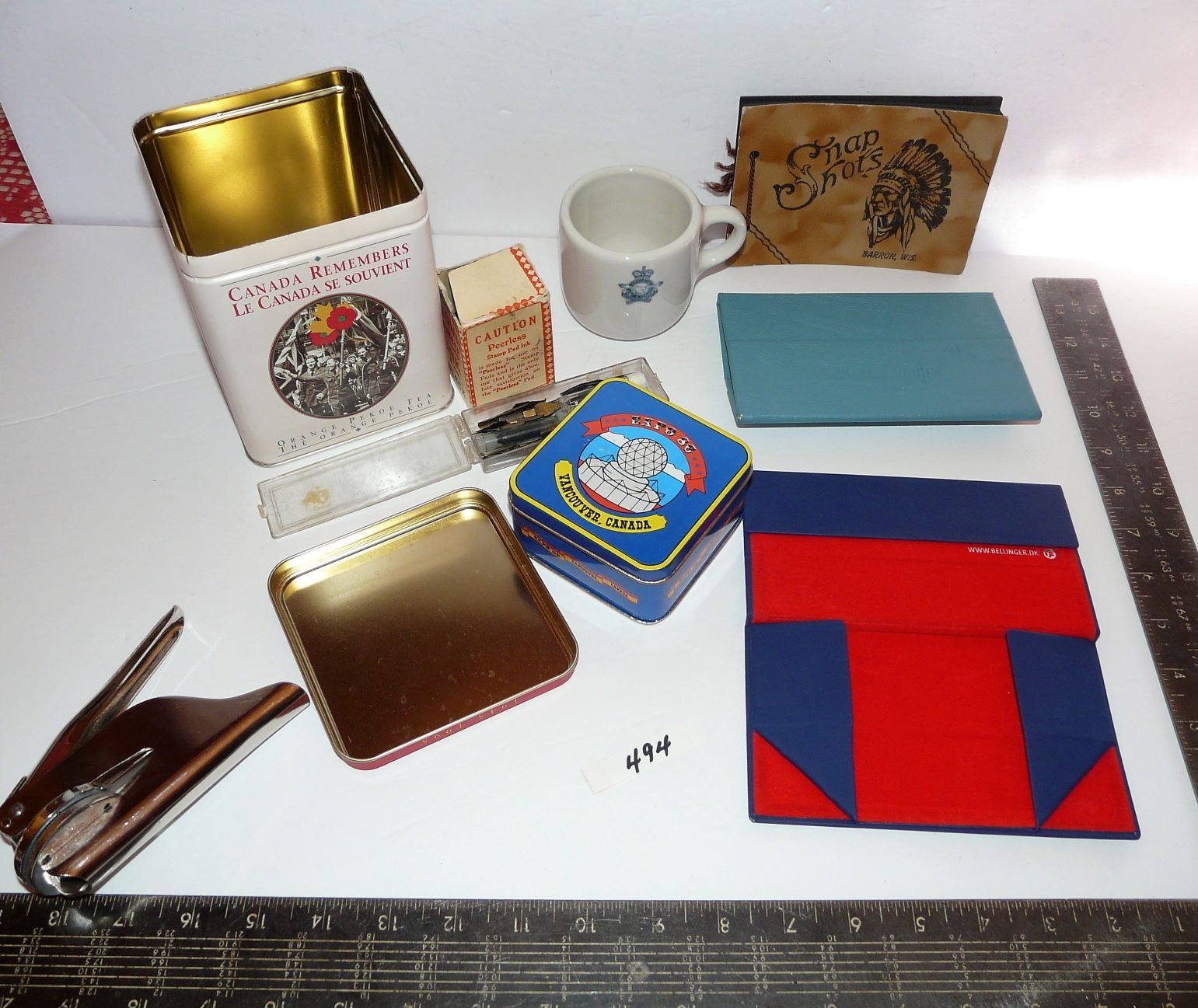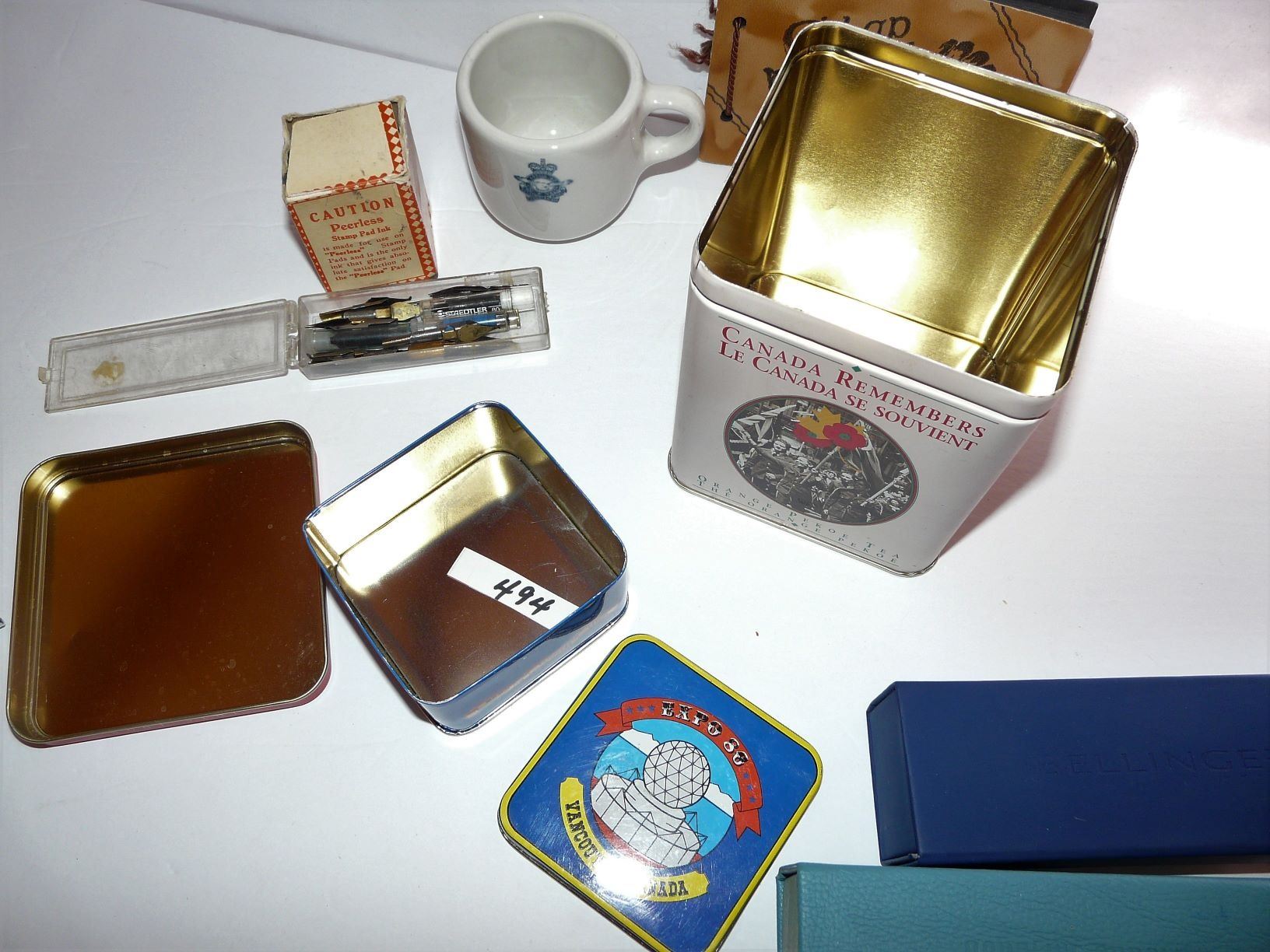 Fold Down Eye Glass Cases, Canada Remembers Tea Tin, Expo '86 Tin, Pen Nibs, Ink Bottle, Military Mug, Photo Album, Personalized Book Seal (J.E.M.) With Case