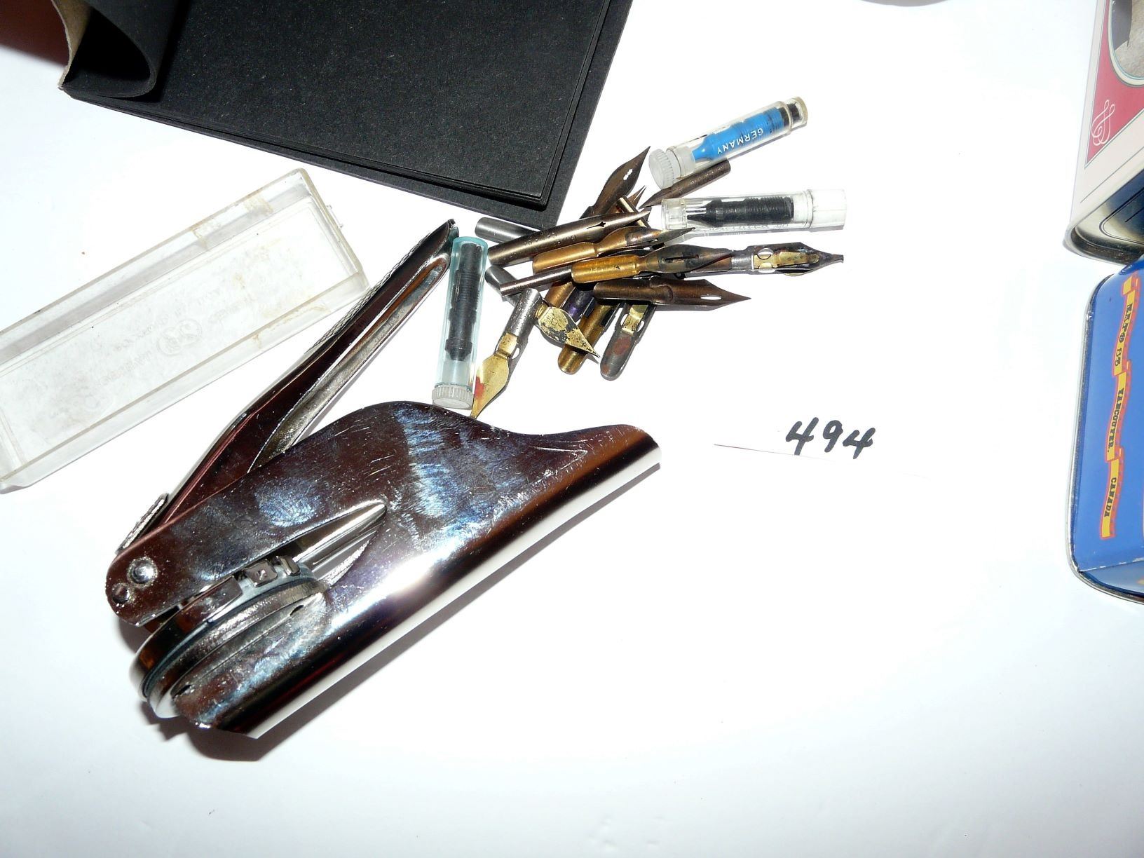 Fold Down Eye Glass Cases, Canada Remembers Tea Tin, Expo '86 Tin, Pen Nibs, Ink Bottle, Military Mu