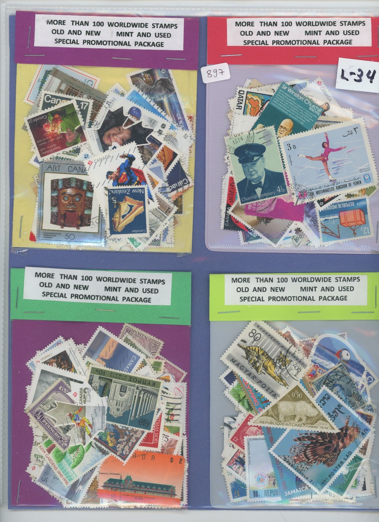 Four 100 stamp packages - Canadian, U.S. and Worldwide - nice assortment