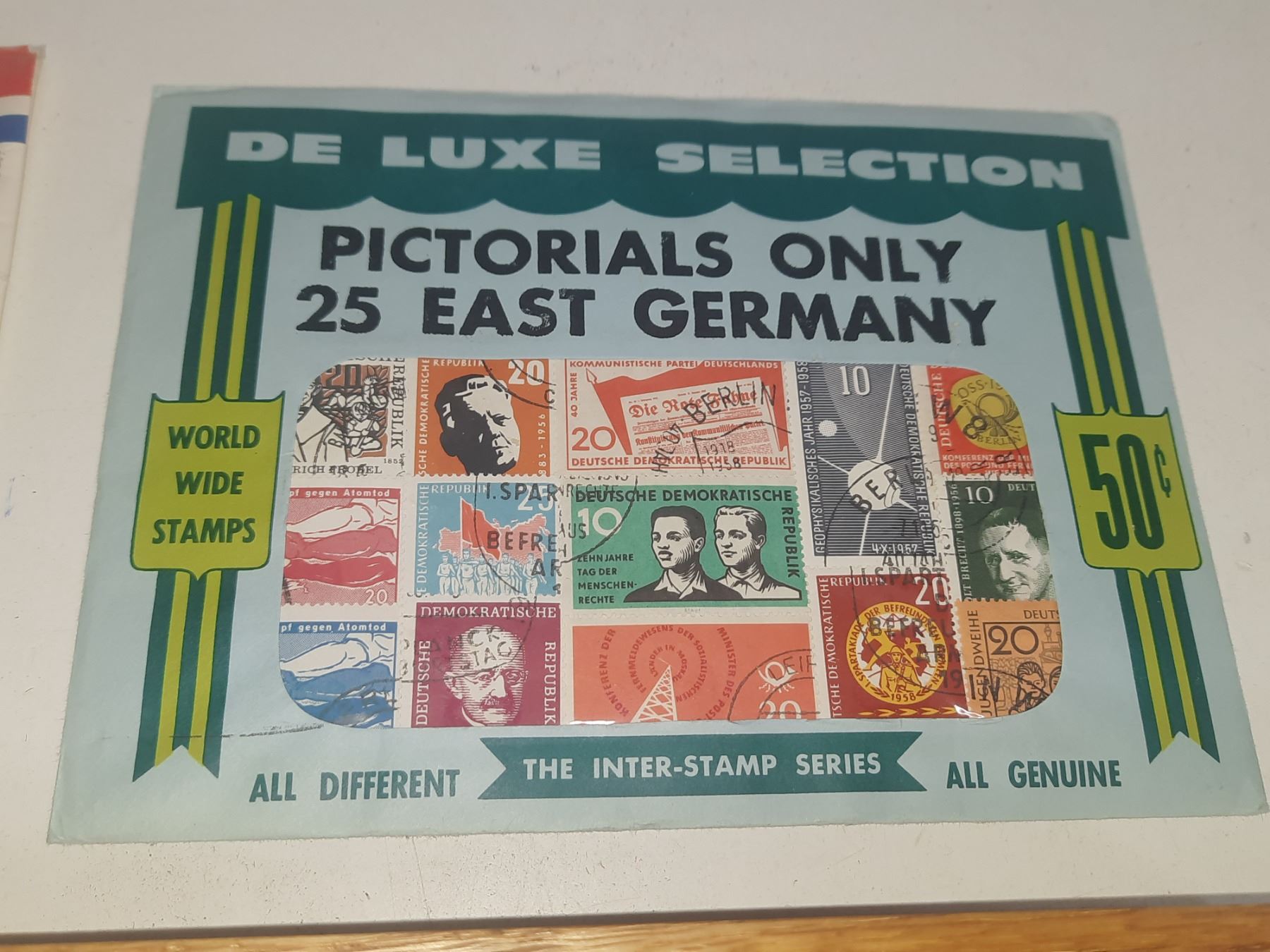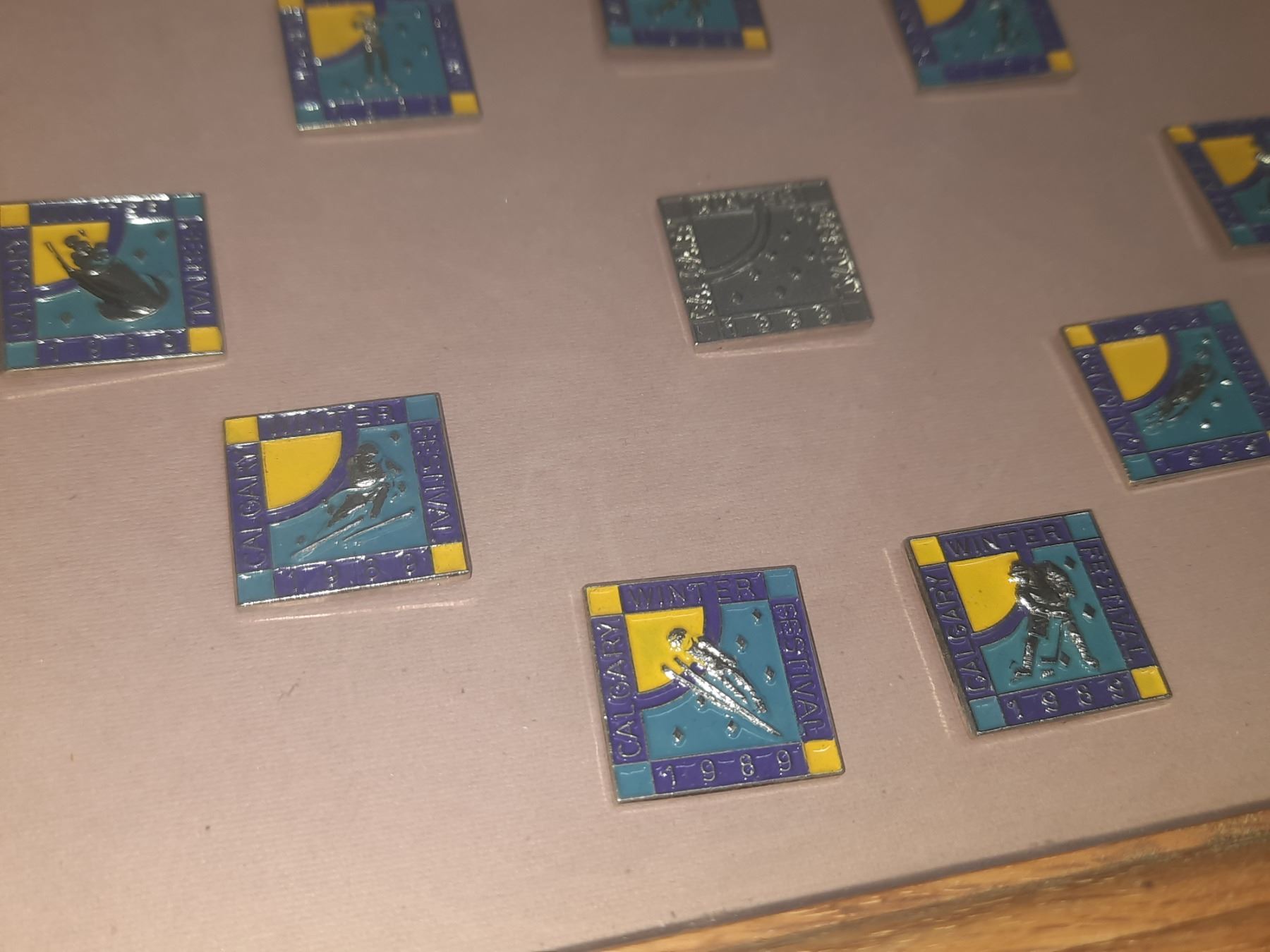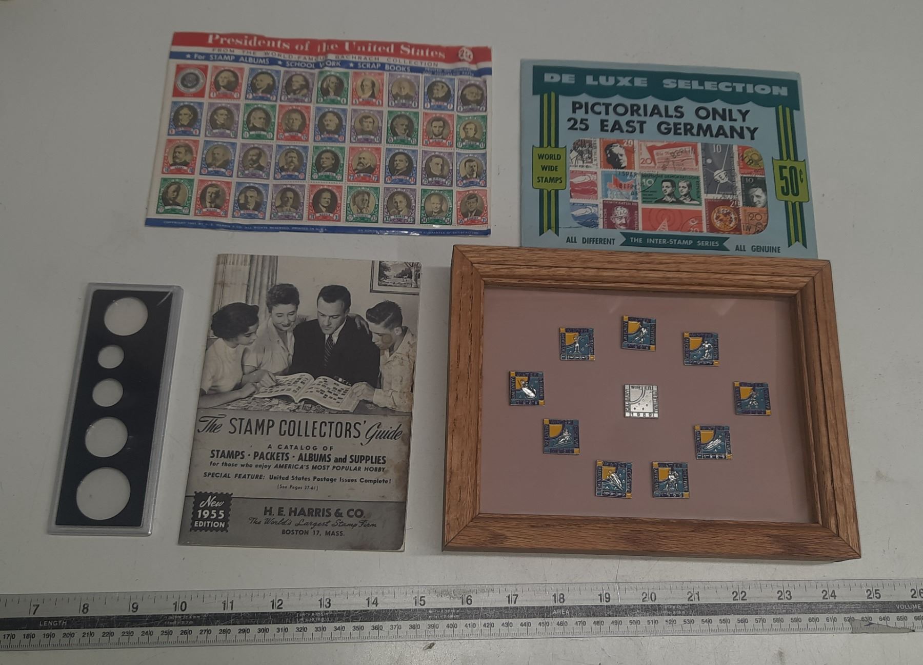 Framed Set of Ten 1989 Calgary Winter Festival Pins, The Stamp Collector's Guide, 25 East Germany Pictorials Only, Presidents of the United States Stamps and Coin Plastic Holder for 1920's.