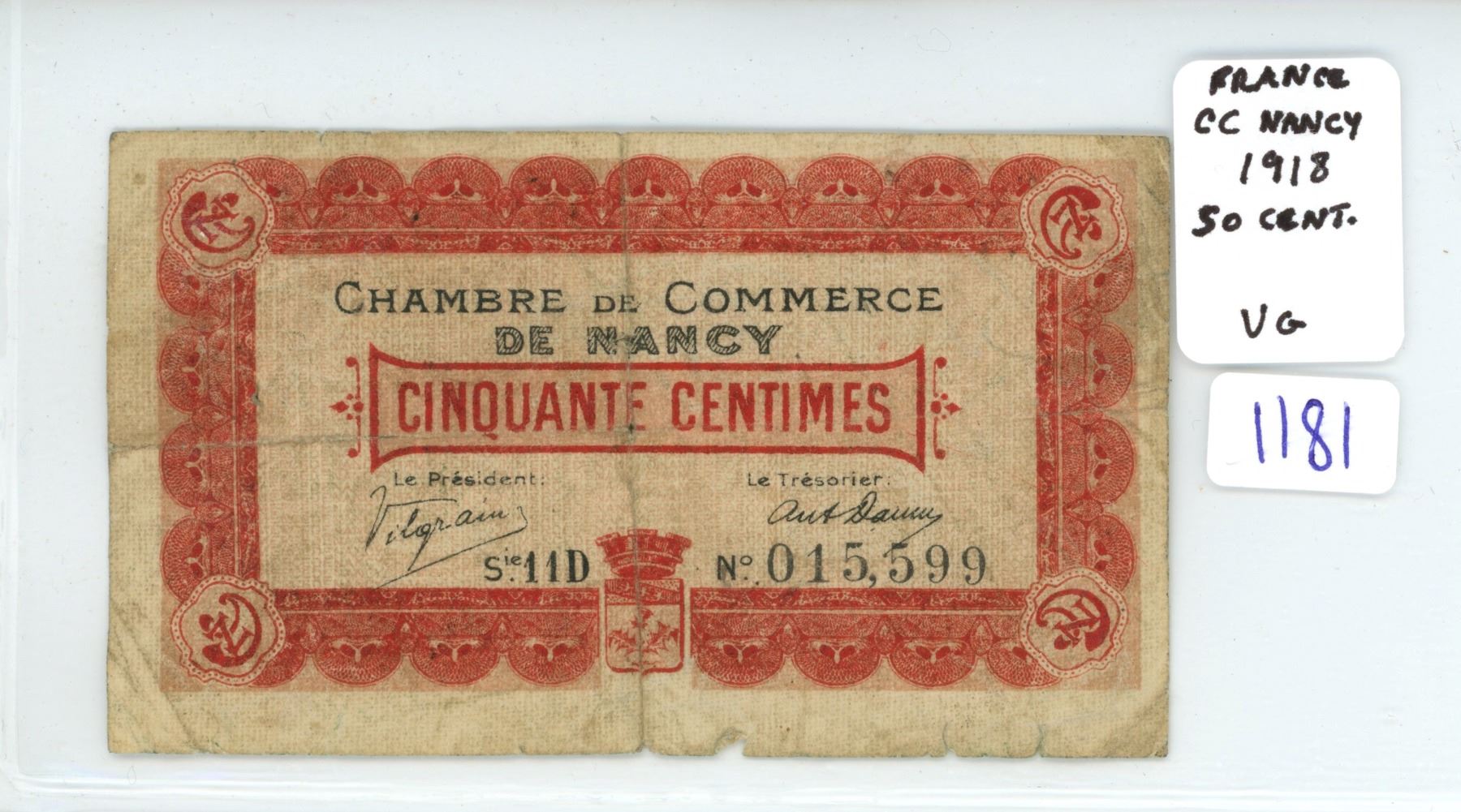 France. 1918 Chamber of Commerce of Nancy 50 Centimes. Necessity Money. VG.