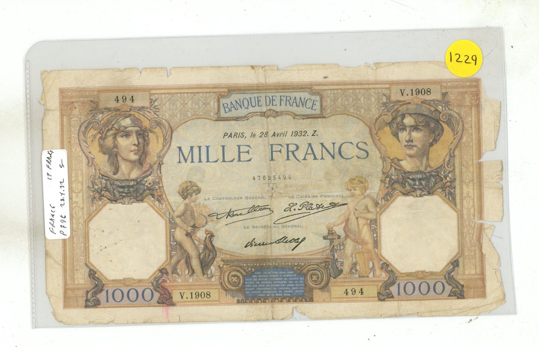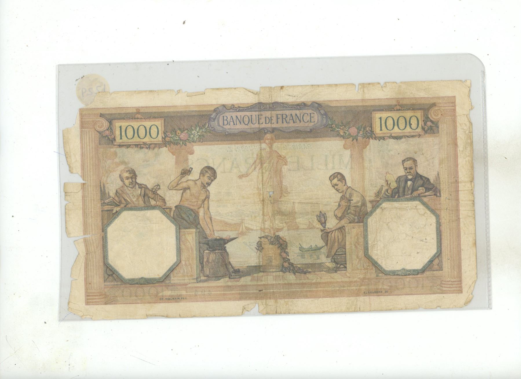 France. 1932 1000 Francs. VG with tears and pieces missing.