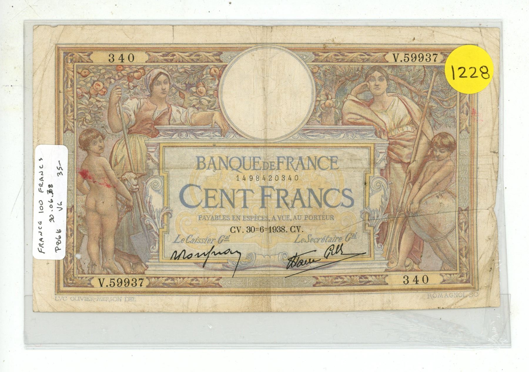 France. 1938 100 Francs. VG.