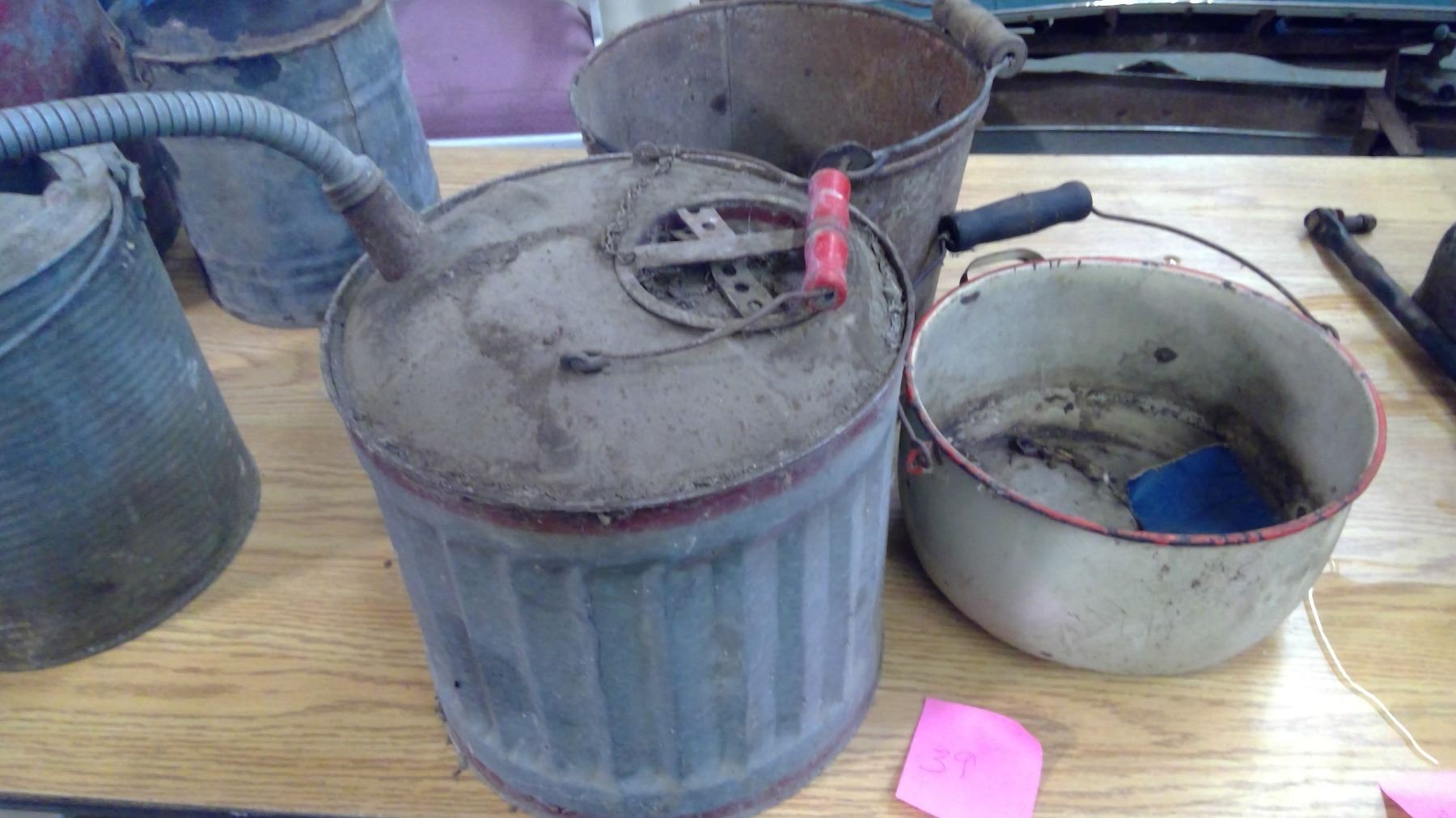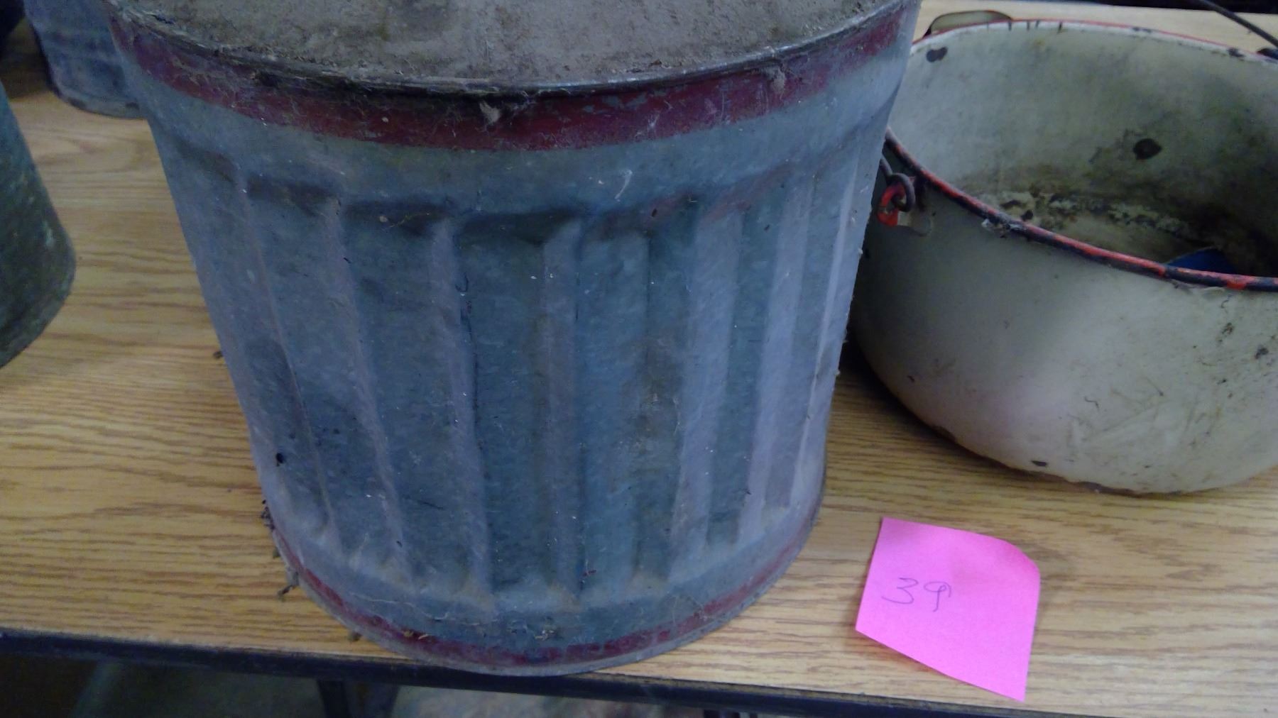 GALVANIZED RED BAND FUEL PAIL GARDEN SPRINKLER (INCOMPLETE) & PAIL & COOKING POT