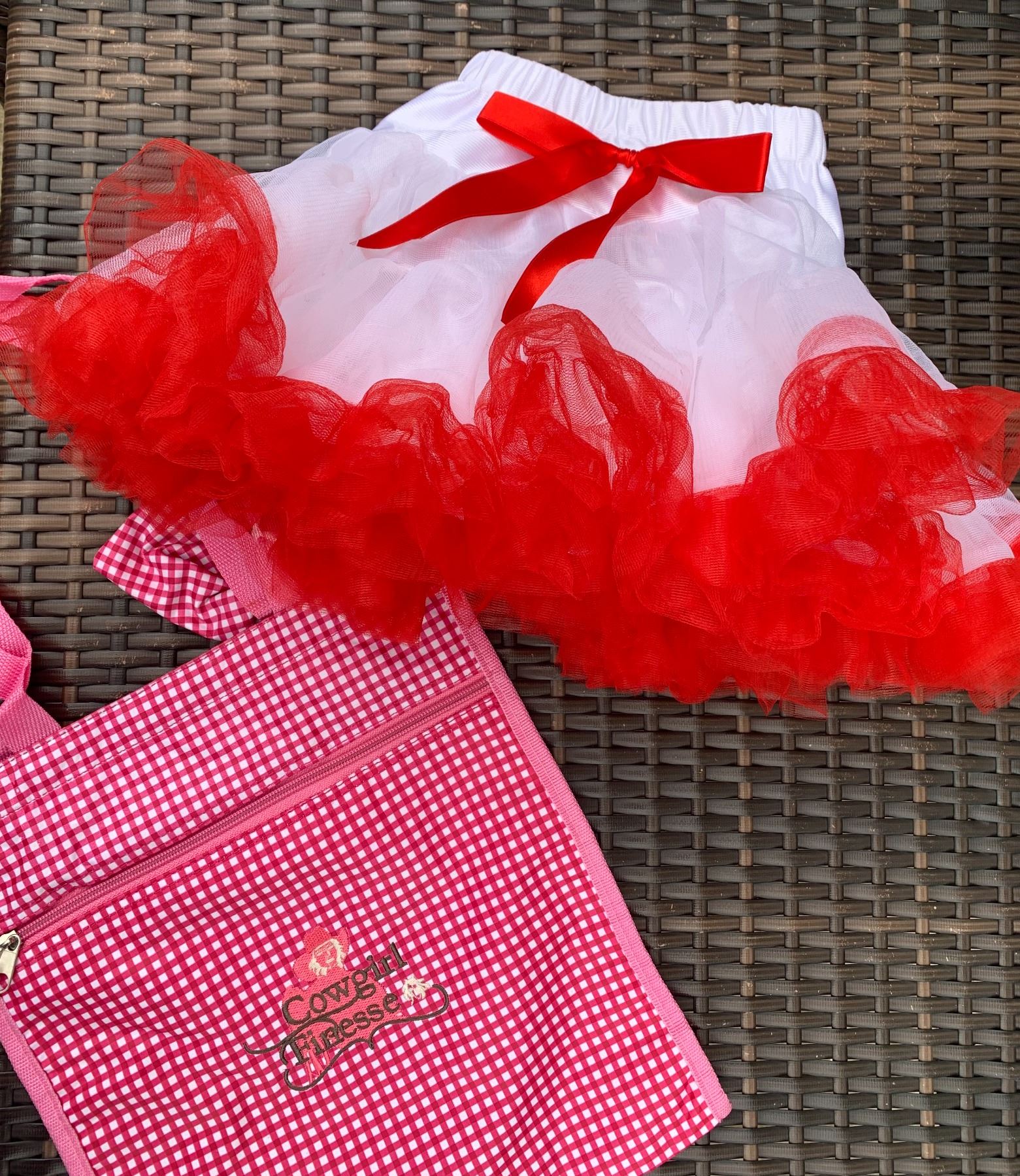 GIRLS WHITE TUTU SKIRT WITH RED RUFFLE SIZE 3T/COWGIRL FINESSE TOTE BAG!!