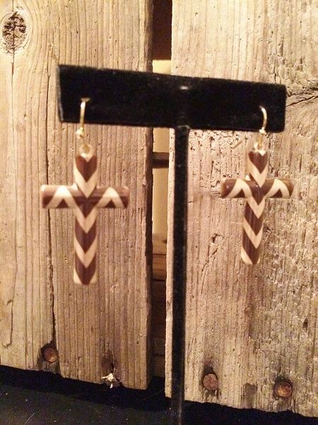 GOLD AND BROWN CHEVRON CROSS EARRINGS-1.75" L x 1" W