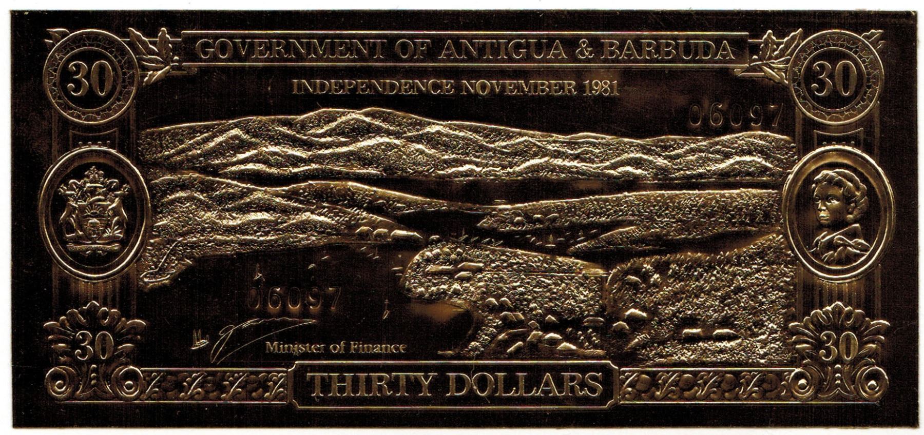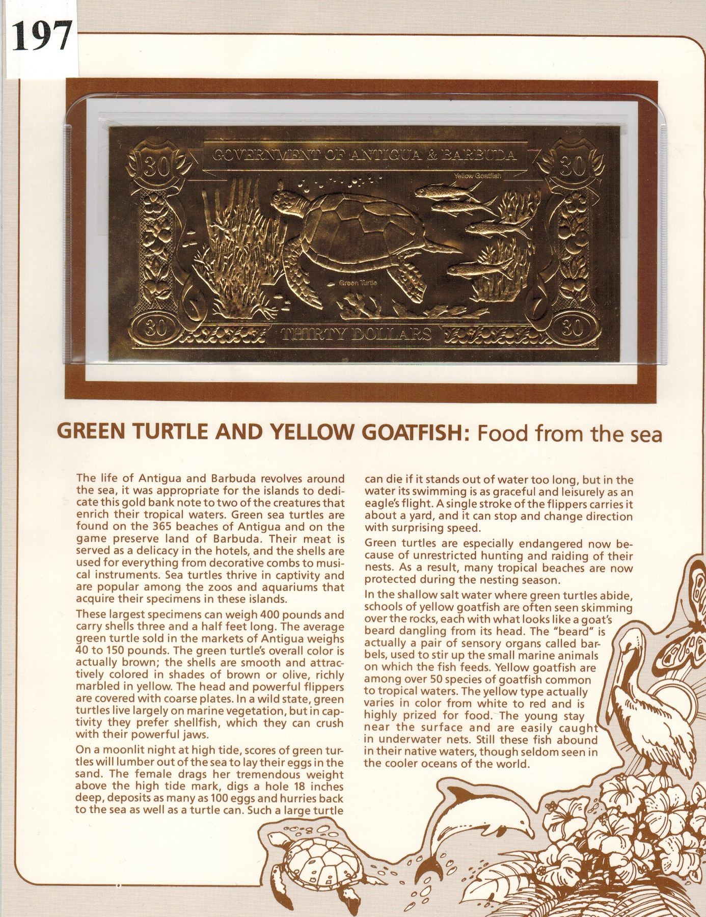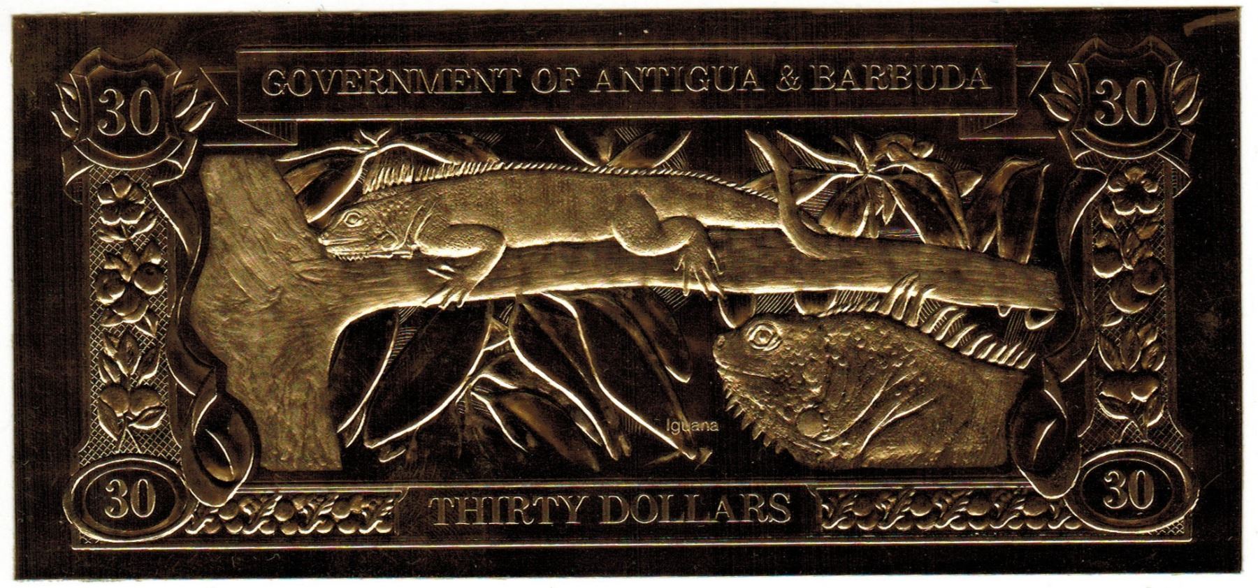 GOLD BANK NOTE - ANTIGUA & BARBUDA - GREEN TURTLE & GOATFISH - 30 DOLLARS - LEGAL TENDER