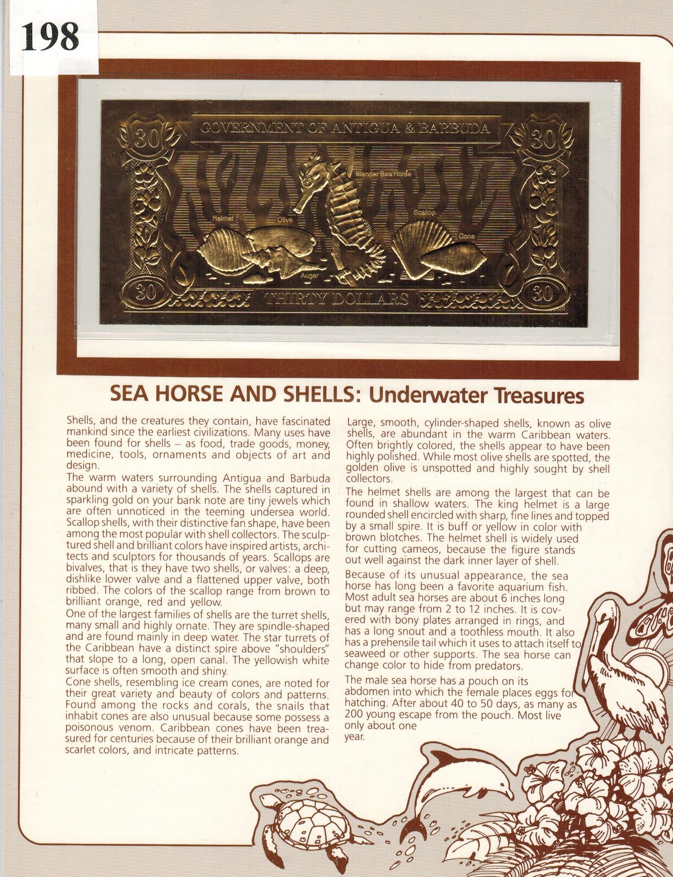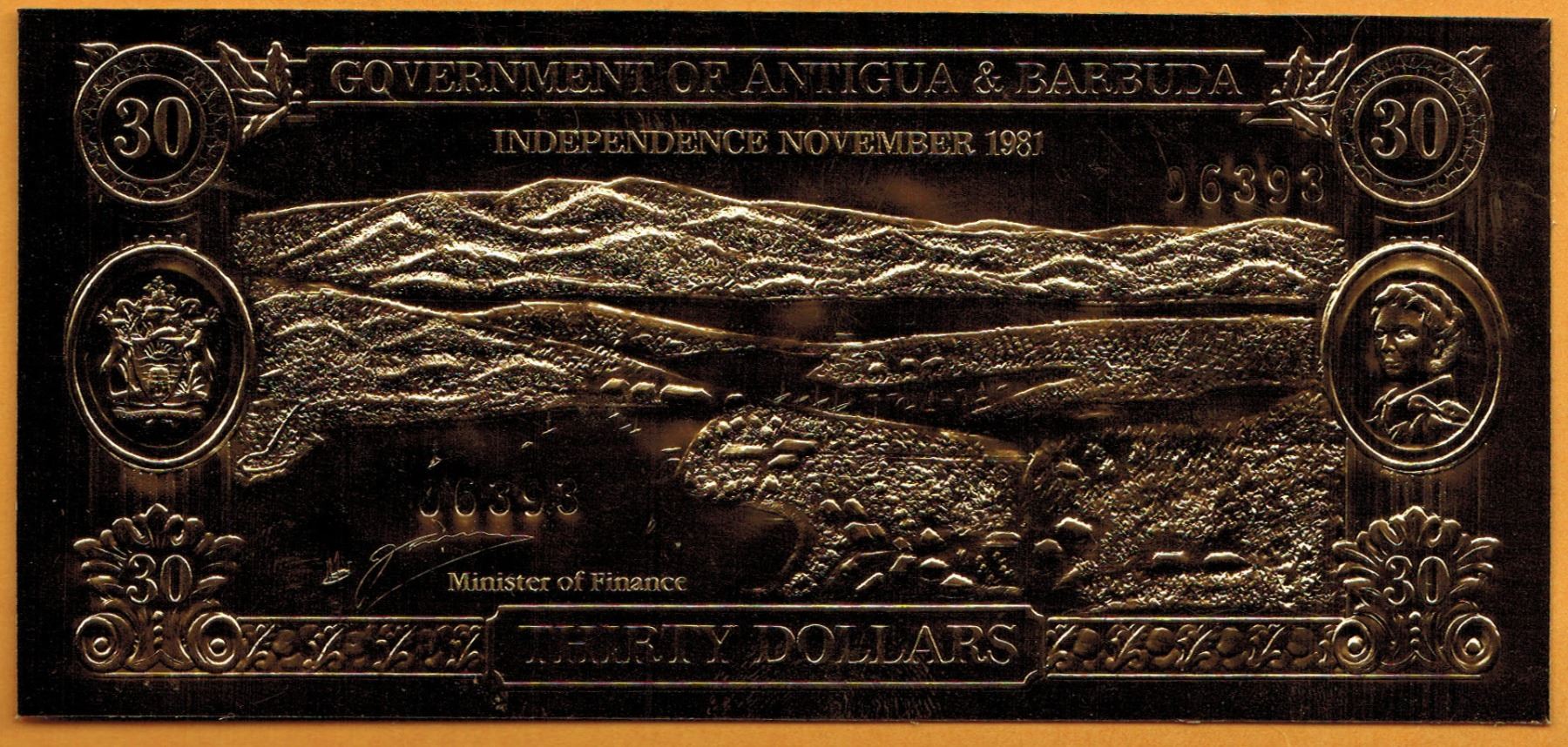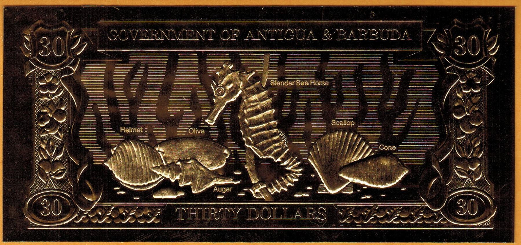 GOLD BANK NOTE - ANTIGUA & BARBUDA - SEA HORSE & SHELLS - 30 DOLLARS - LEGAL TENDER