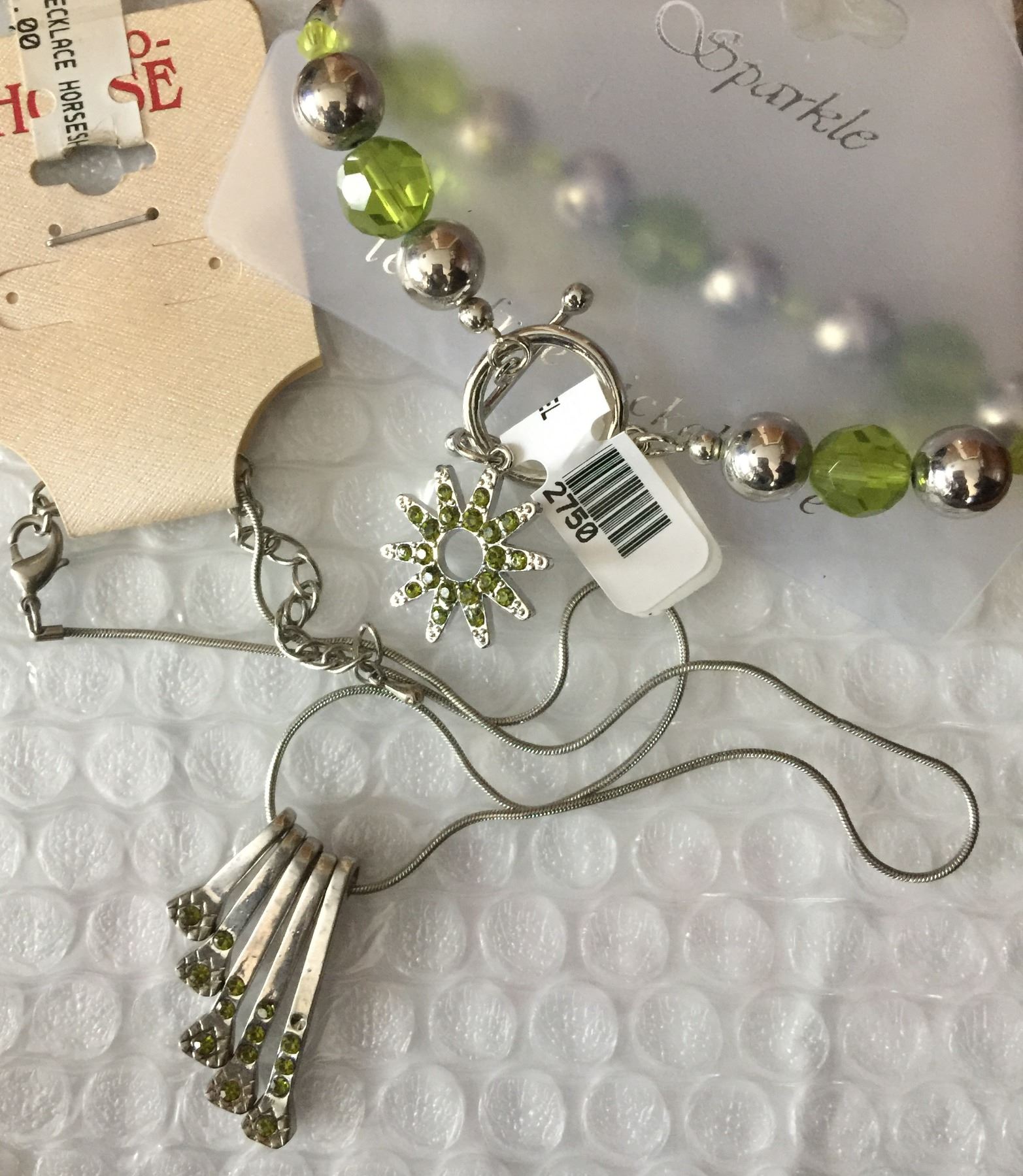 GREEN CRYSTAL SPUR ROWEL CHARM BRACELET/HORSEHOE NAIL NECKLACE/NICKEL FREE