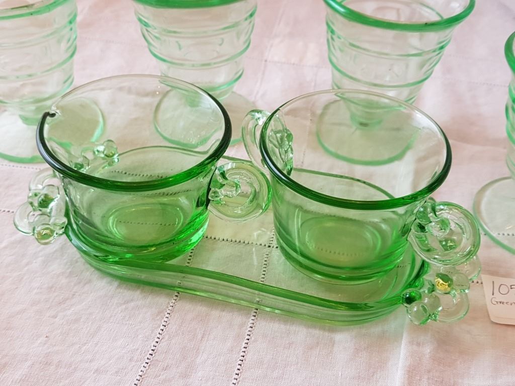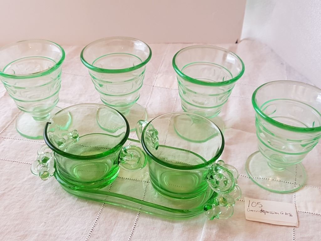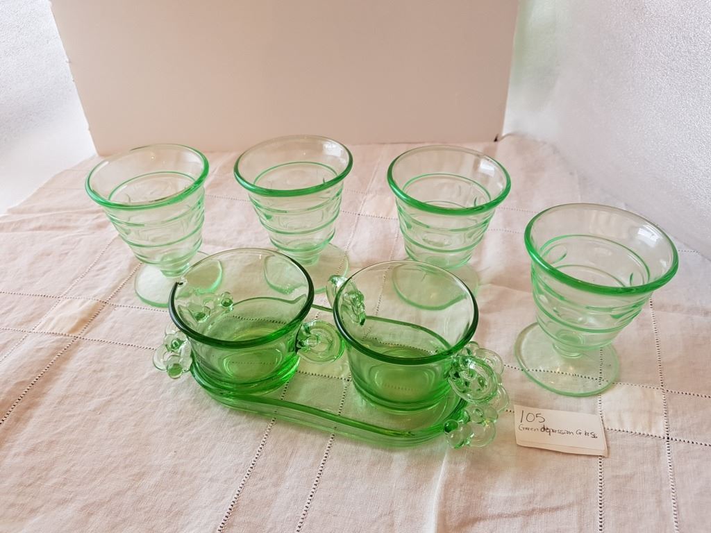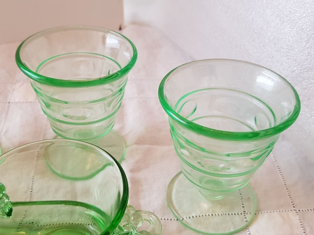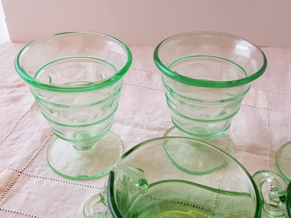 GREEN DEPRESSION GLASS, (CREAM, SUGAR, 4 DESSERT CUPS)