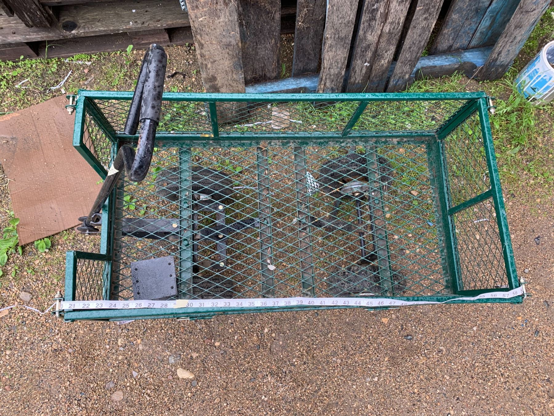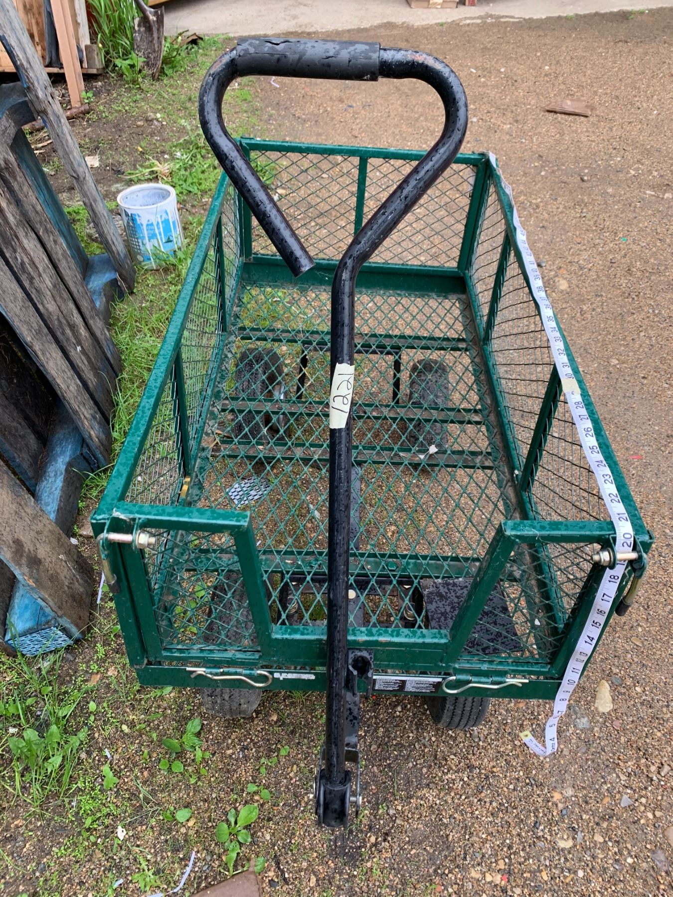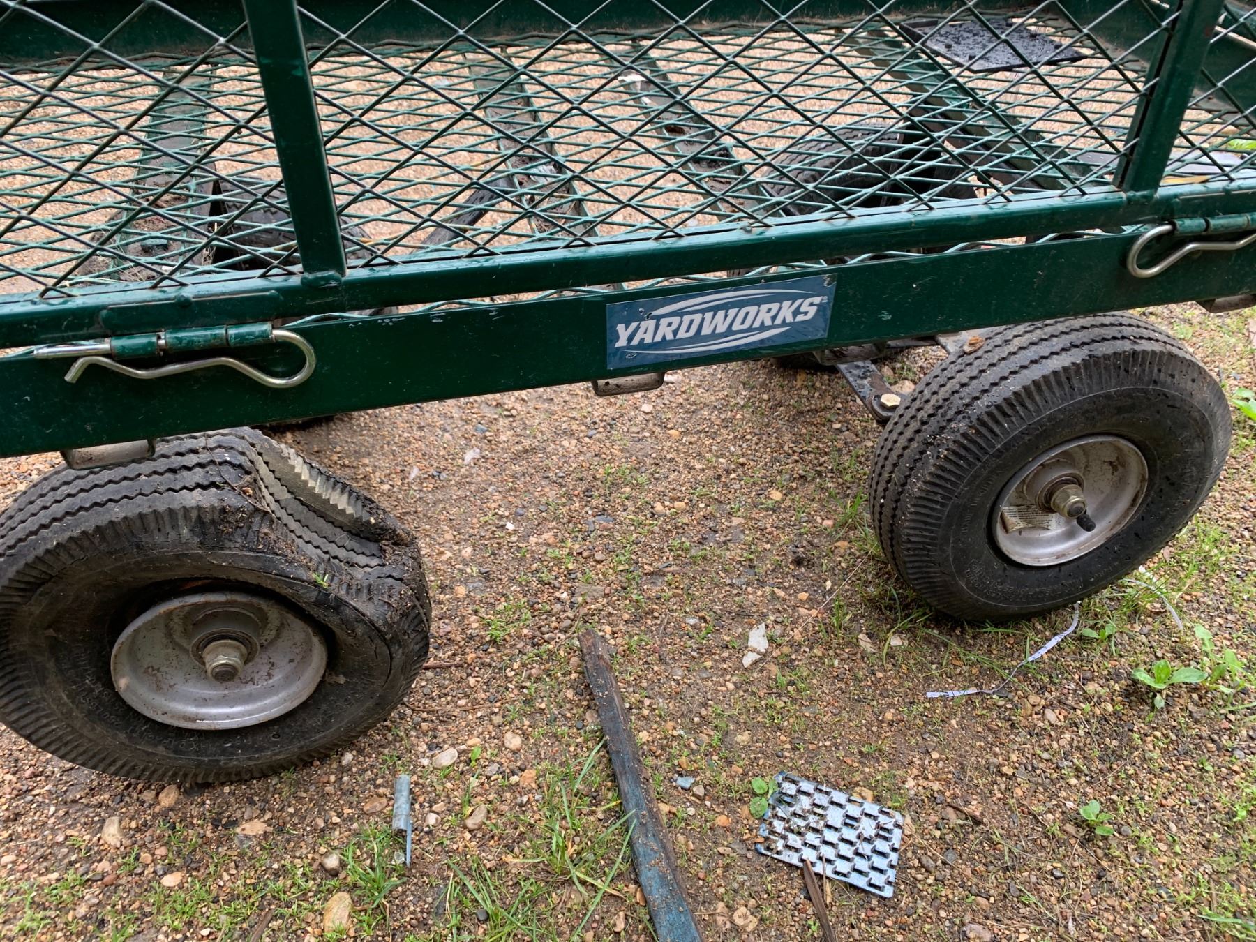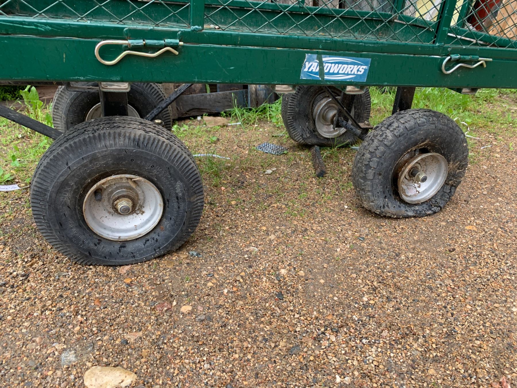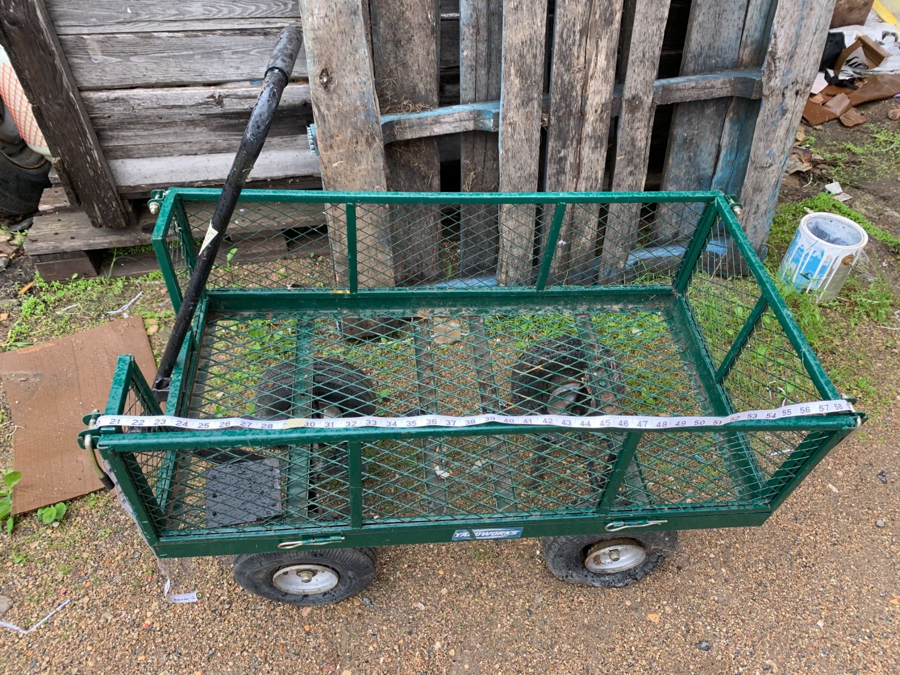 GREEN METAL YARDWOK WAGON W/ RUBBER WHEELS (WHEELS NEED TO BE REPLACED/FILLED WITH AIR)