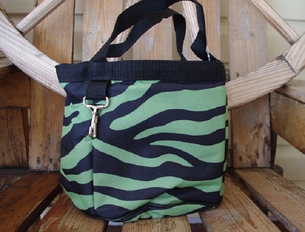 GROOMING CADDY.perfect size for all your finishing show products/2 handles/Compartment to organize bottles and brushes/Green and black zebra print
