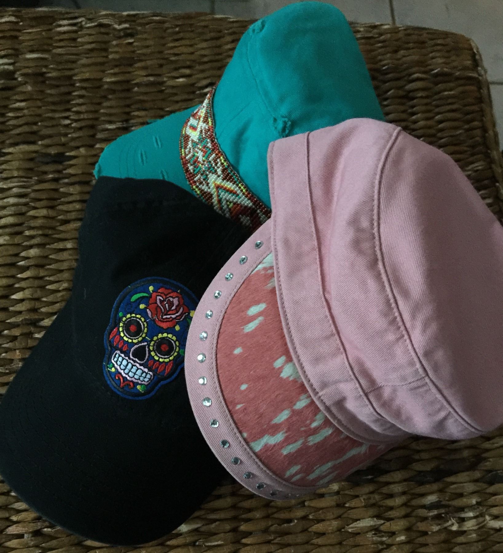GROUP OF 3 HATS/TURQ BEADED CADET HAT,BLACK SUGAR SKULL BASEBALL CAP,PINK HAIR ON HIDE BHW CADET HAT/ALL HAVE ADJUSTABLE STRAP