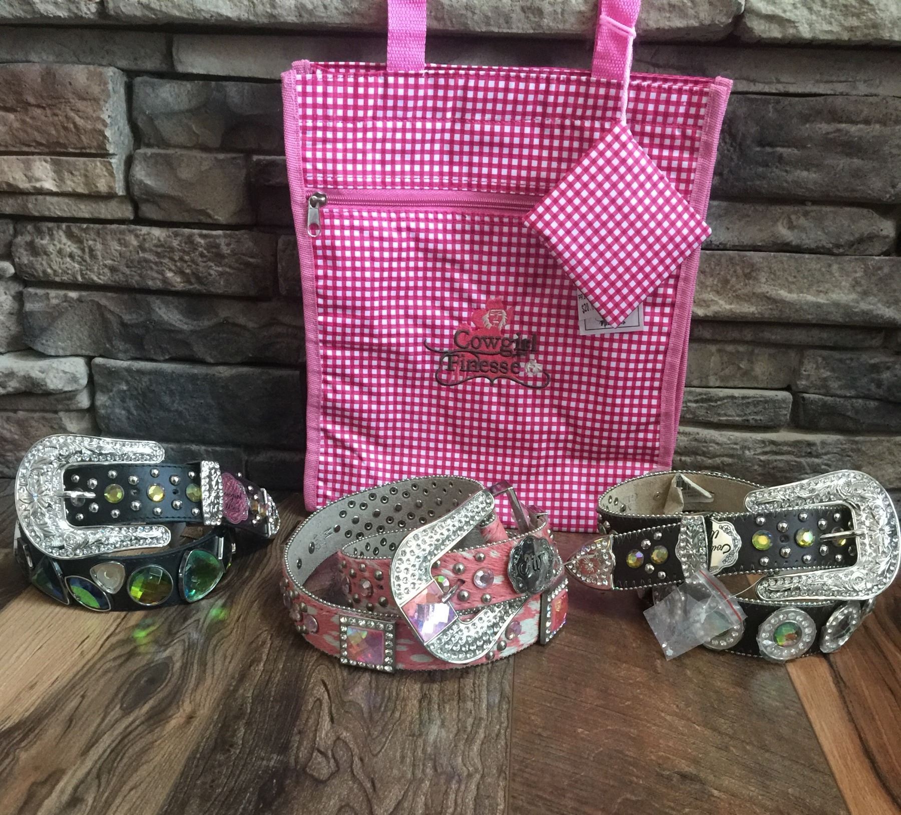 GROUP OF 3 WESTERN BLING BELTS PLUS A COWGIRL FINESS TOTE BAG*BELT MAY HAVE DEFECTS IN SOME STONES B