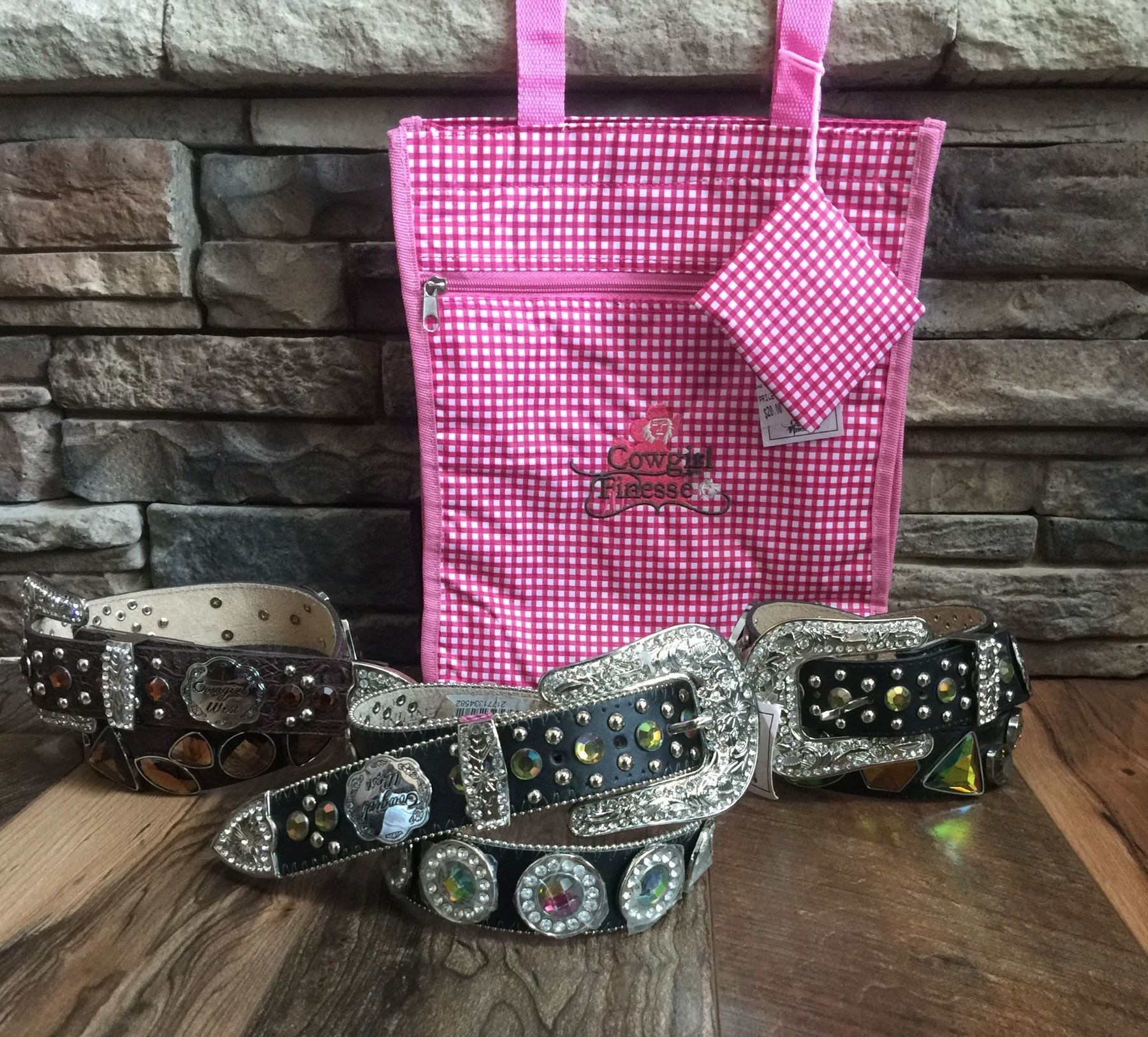 GROUP OF 3 WESTERN BLING BELTS PLUS A COWGIRL FINESS TOTE BAG*BELT MAY HAVE DEFECTS IN SOME STONES B