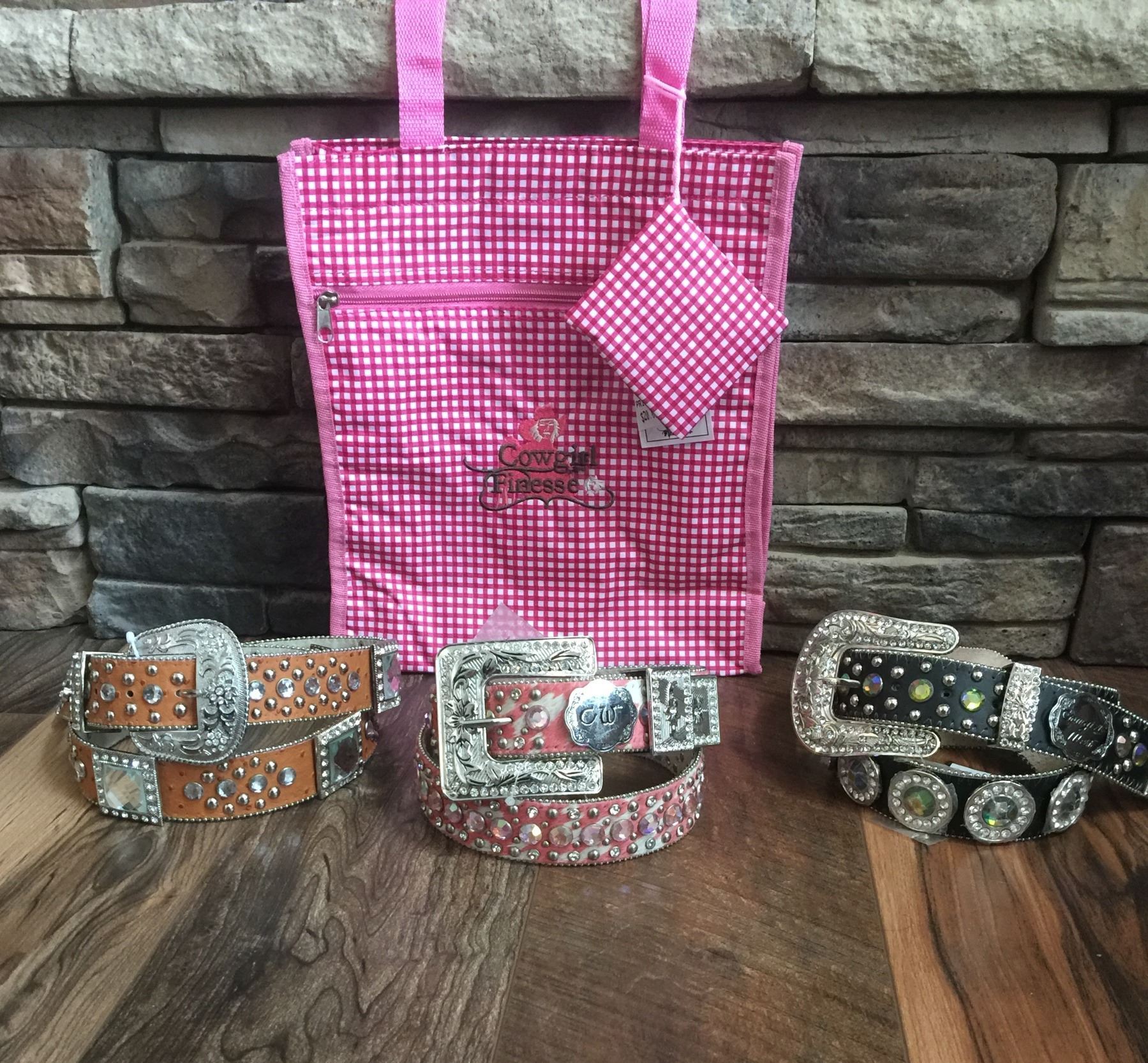 GROUP OF 3 WESTERN BLING BELTS PLUS A COWGIRL FINESS TOTE BAG*BELT MAY HAVE DEFECTS IN SOME STONES B