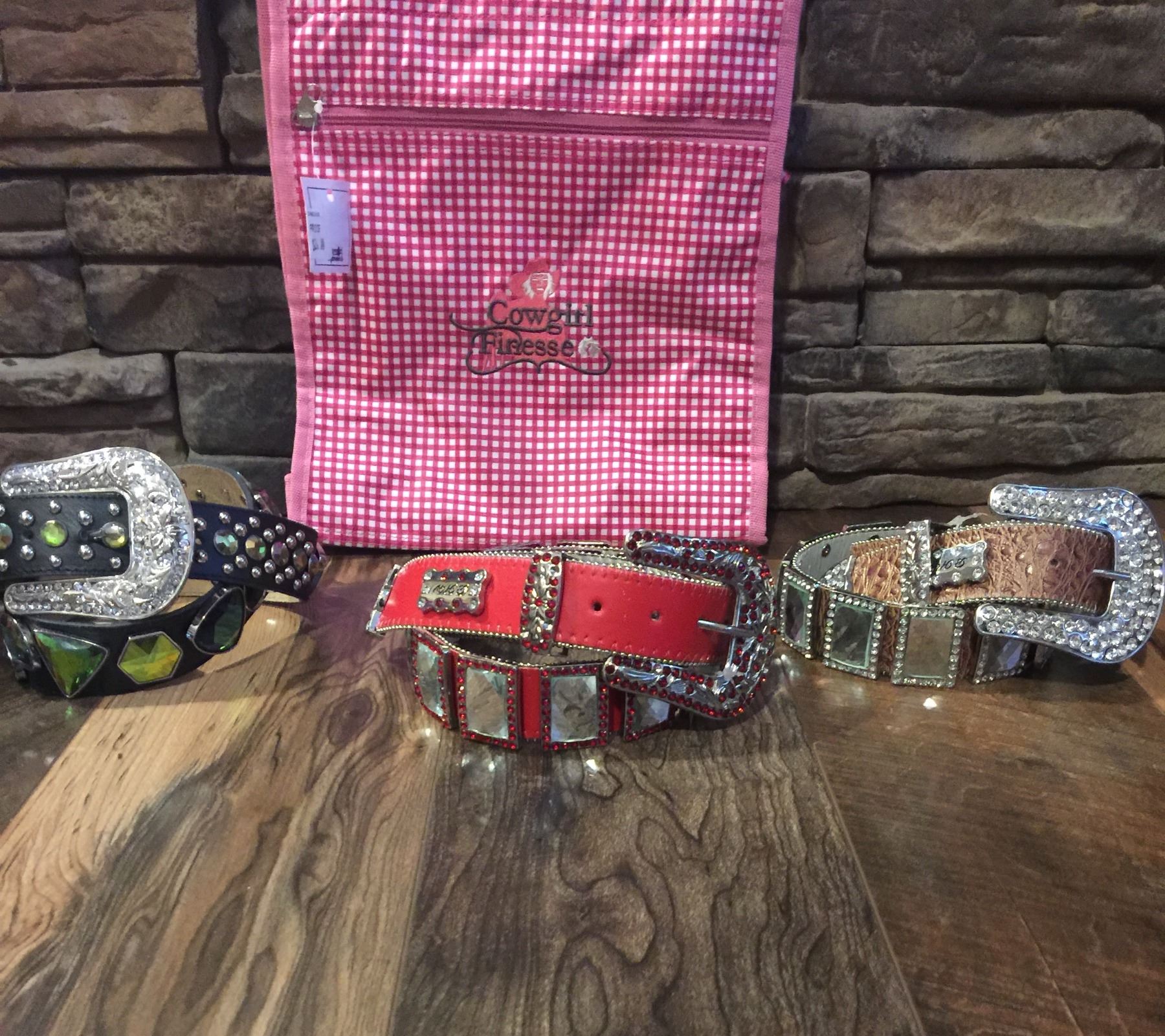 GROUP OF 3 WESTERN BLING BELTS PLUS A COWGIRL FINESS TOTE BAG*BELT MAY HAVE DEFECTS IN SOME STONES B