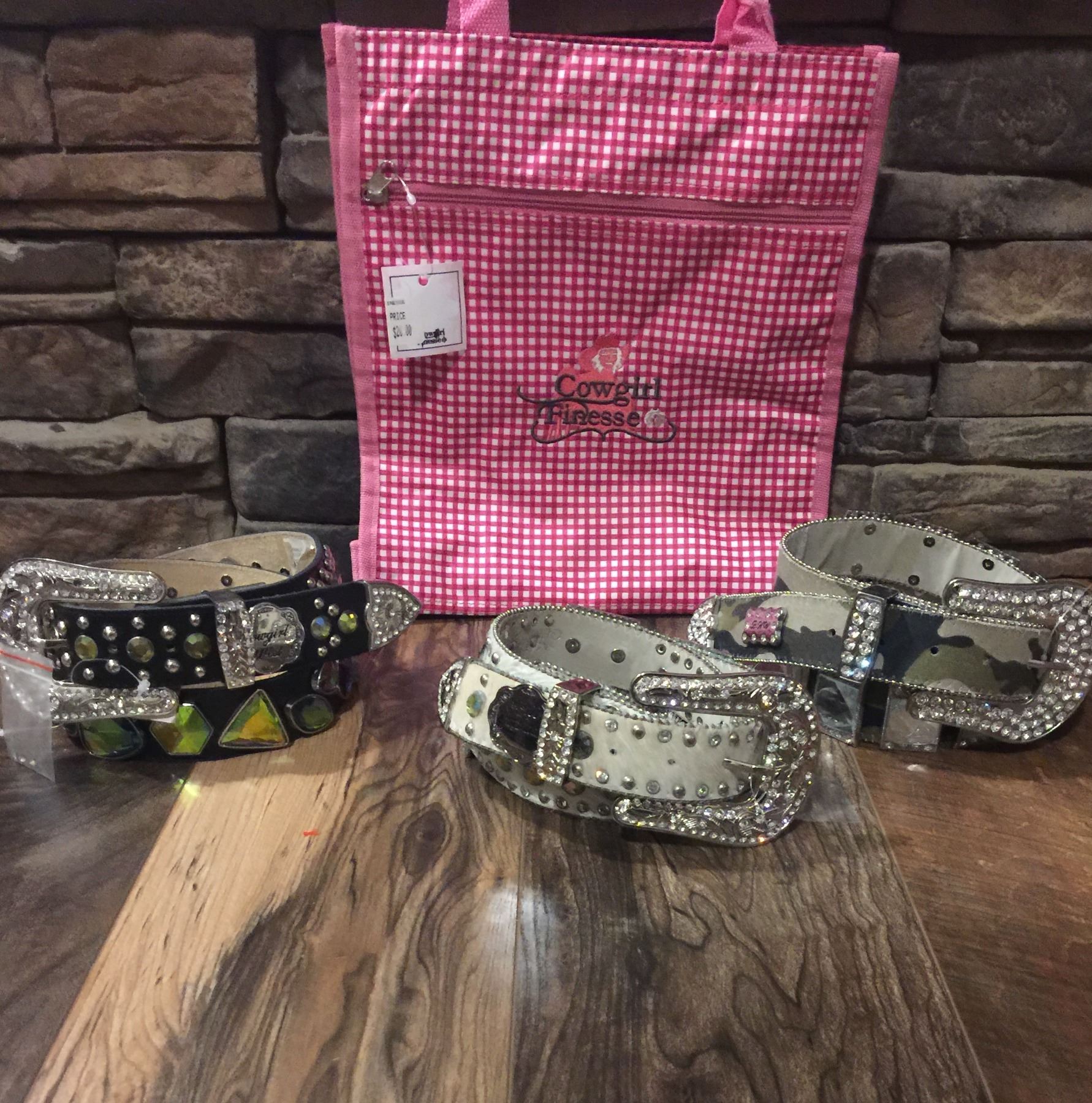 GROUP OF 3 WESTERN BLING BELTS PLUS A COWGIRL FINESS TOTE BAG*BELT MAY HAVE DEFECTS IN SOME STONES B