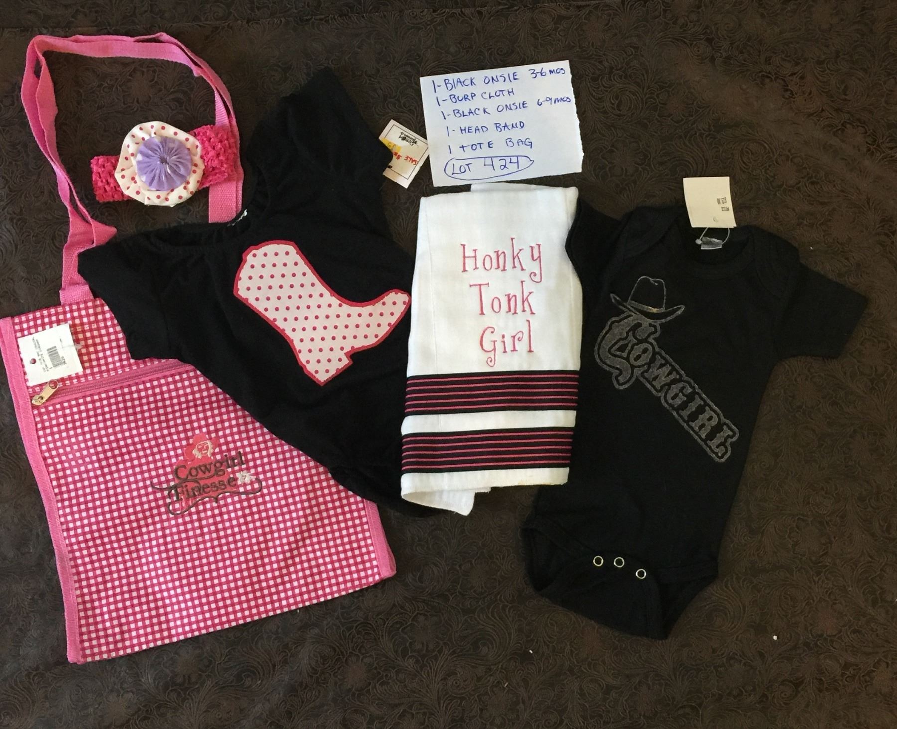 GROUP OF 5 BABY ITEMS/ 1-WHITE BURP CLOTH,1-BLACK 6/9 MOS ONSIE, 1-BLACK 3/6 MOS ONSIE, 1-HEAD BAND, 1-TOTE BAG