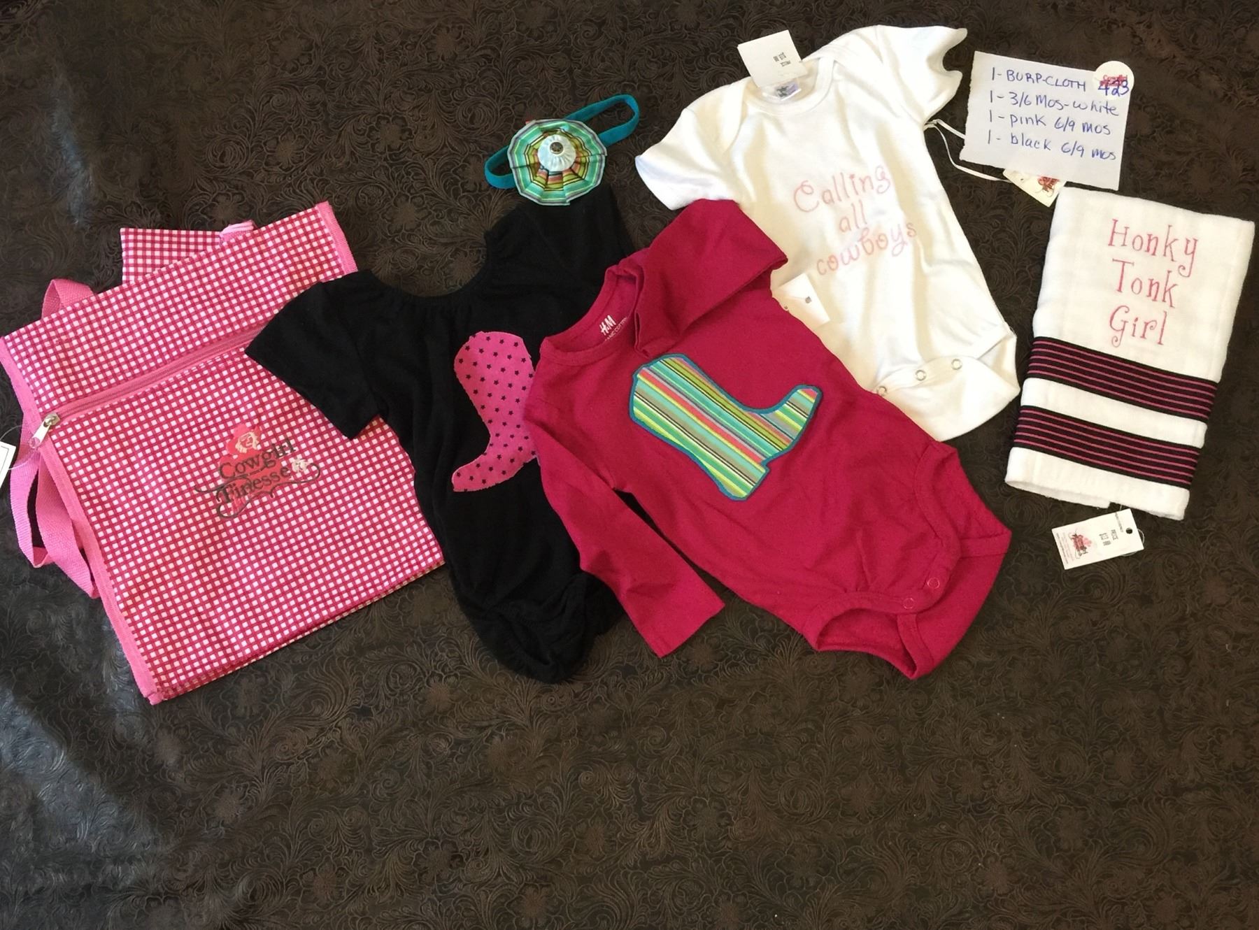 GROUP OF 7 BABY ITEMS/ 1-WHITE BURP CLOTH,2-WHITE 3/6 MOS ONSIE, 1PINK-6/9 MOS ONSIE,1-BLACK 6/9 MOS ONESIE, 1-HEAD BAND, 1-TOTE BAG
