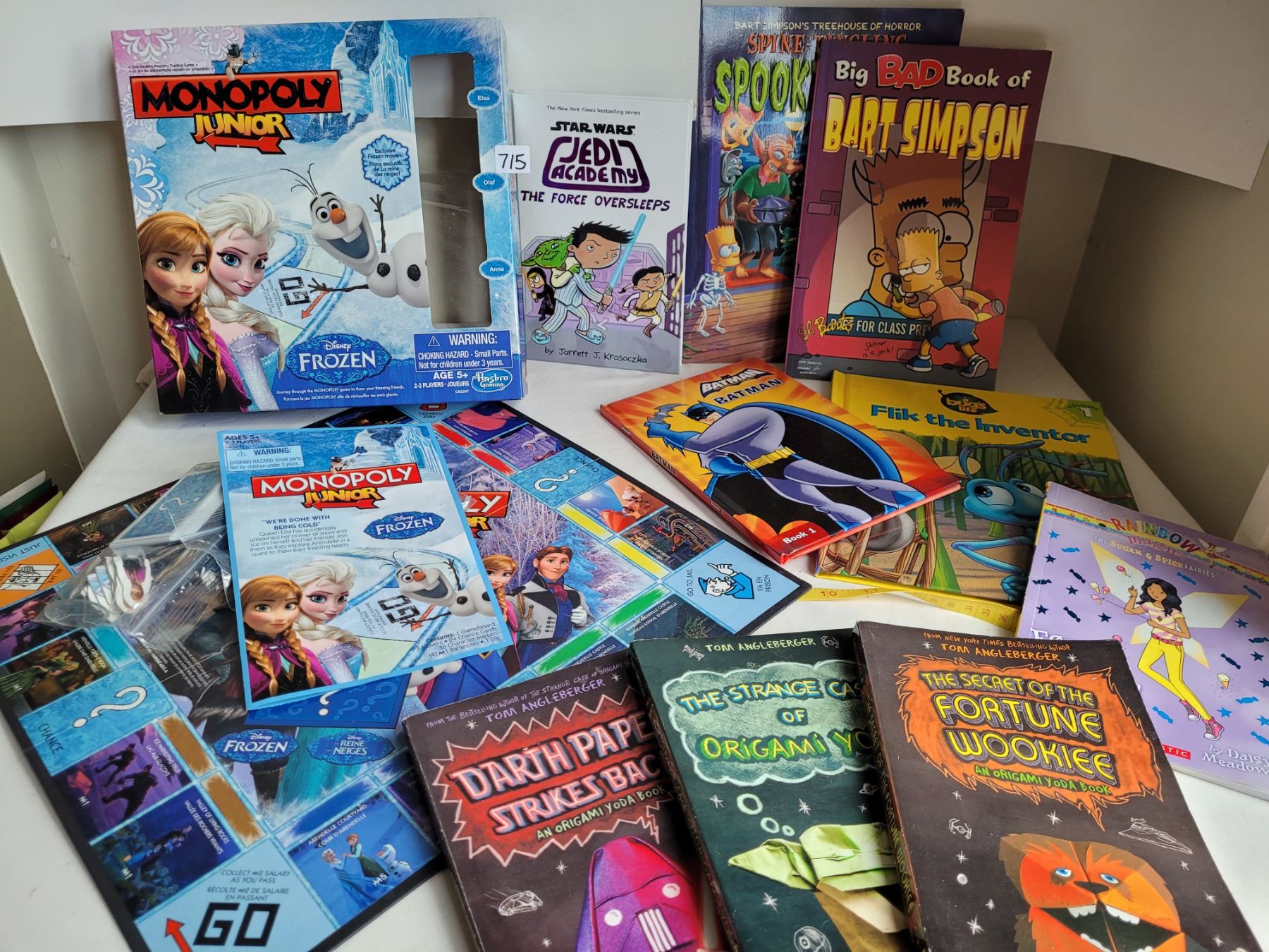 Game & book lot. Disney Frozen Monopoly Jr. Books include Batman, Bugs life, Bart Simpson, Star Wars & Tom Angleberger books.